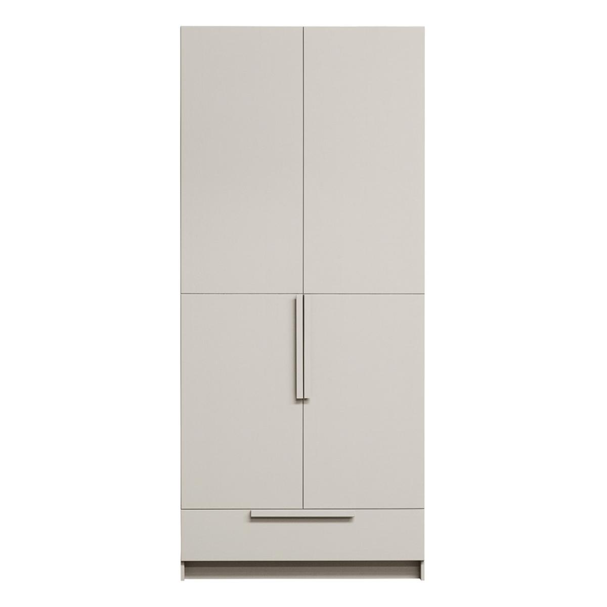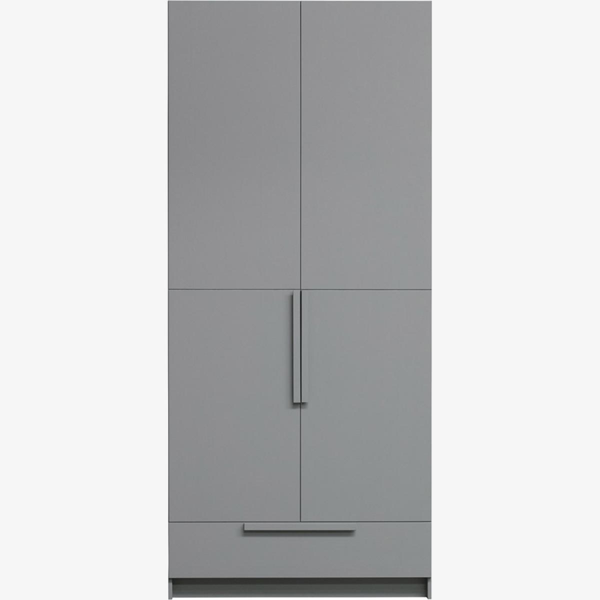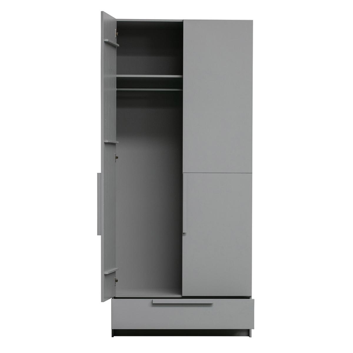 The Pure Collection from Woood is a stunning contemporary range of bedroom storage solutions. The Pure 2 Door Wardrobe is constructed from sustainable FSC pine by our friends in the Netherlands and finished in an on trend dust or concrete grey sanded finish giving it a super sleek look. The 2 doors feature a groovy little groove across the front which creates the impression of split doors for added interest. There is a useful double width drawer at the bottom and it, along with the wardrobe doors, all have robust handles and soft close hinges. This double wardrobe internally has a full width hanging area with full width shelf above. If more storage is required you could build a wall of Pure Wardrobes – take a look at the three door triple wardrobe and single width cupboard, get the measuring tape out and see how many you can fit in to give you a customised wardrobe wall!.