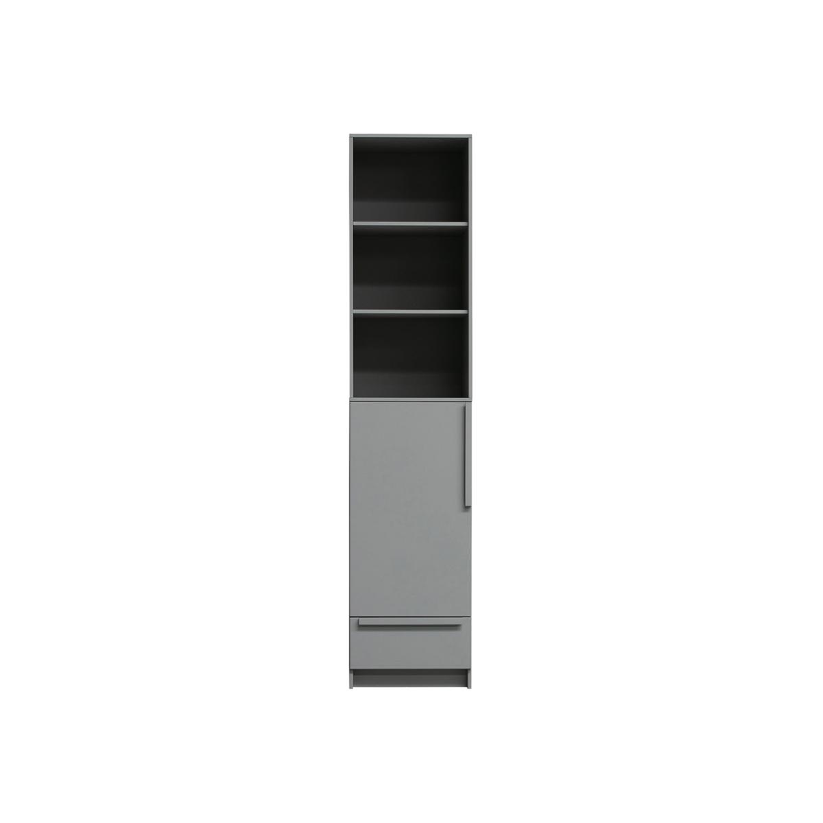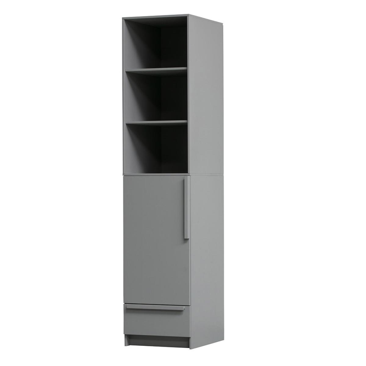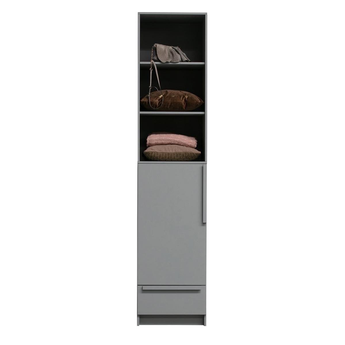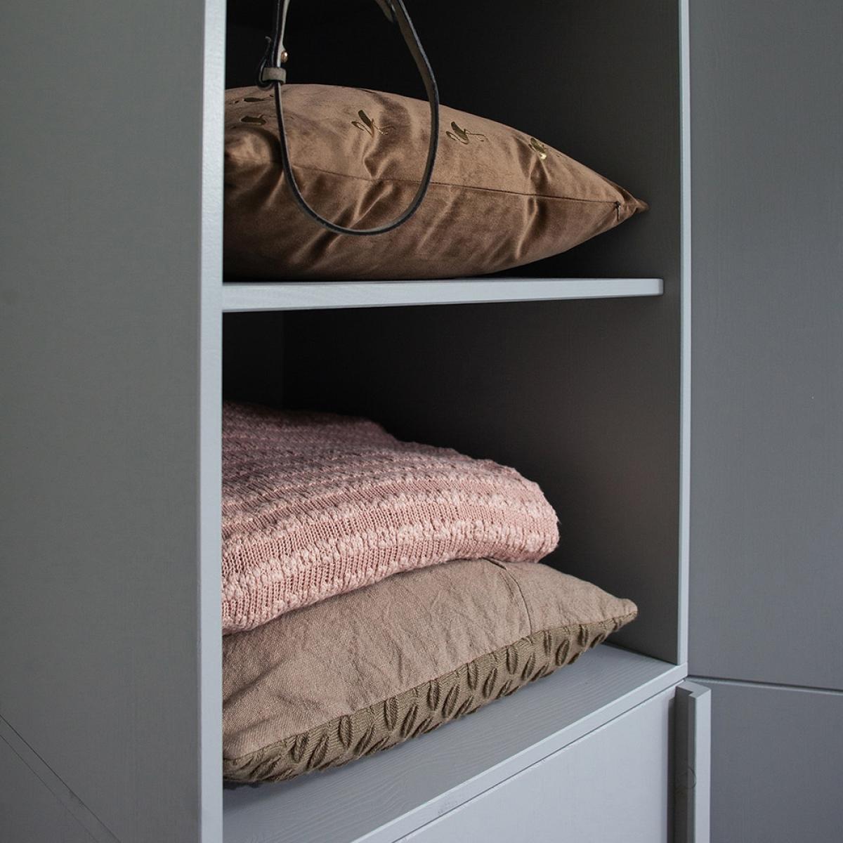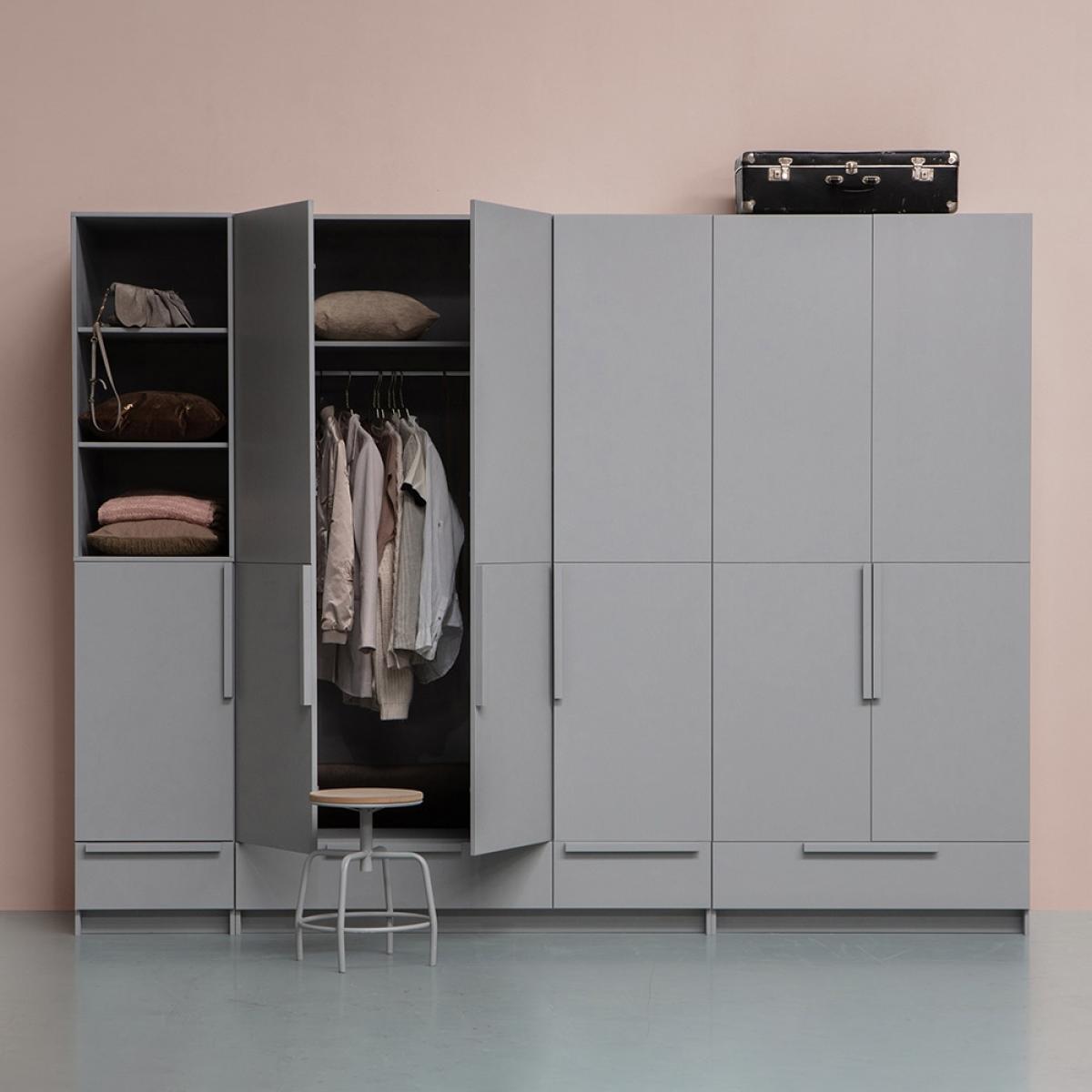The Pure Collection from Woood is a stunning contemporary range of bedroom storage solutions. The Pure Single Wardrobe is constructed from sustainable FSC pine by our friends in the Netherlands and finished in an on trend dust or concrete grey sanded finish giving it a super sleek look. Two shelves provide three storage cubbies on the top to display your finery and below the single door opens to reveal another two sections for your unmentionables that are best kept behind closed doors. There is a useful drawer at the bottom and it, along with the Cupboard door, both have robust handles and soft close hinges. If more storage is required you could build a wall of Pure Wardrobes – take a look at the 3 door wardrobe and 2 door wardrobe, get the measuring tape out and see how many you can fit in to give you a customised wardrobe wall!.