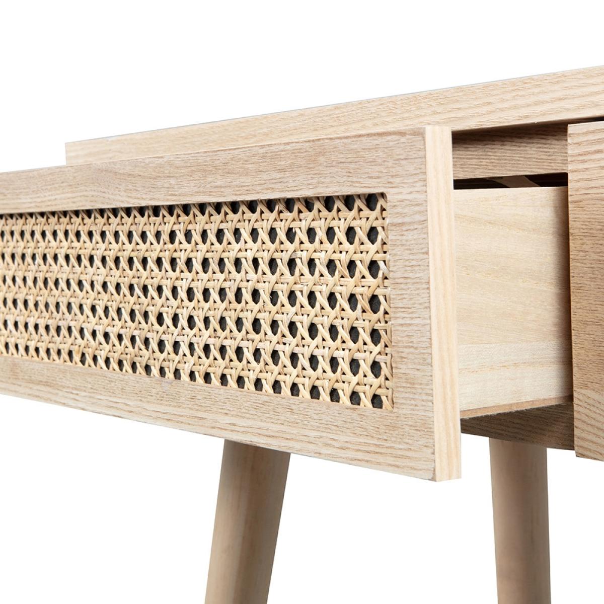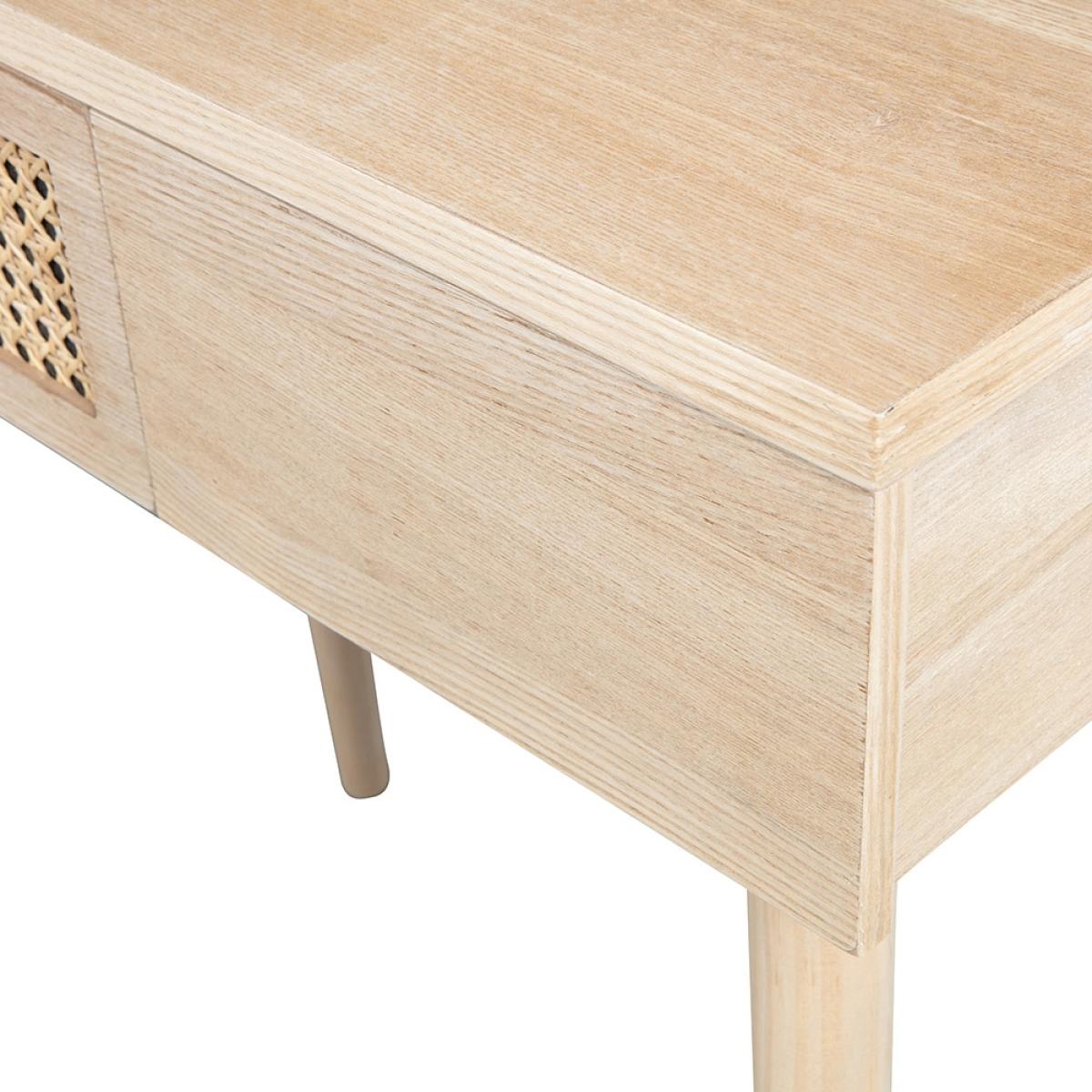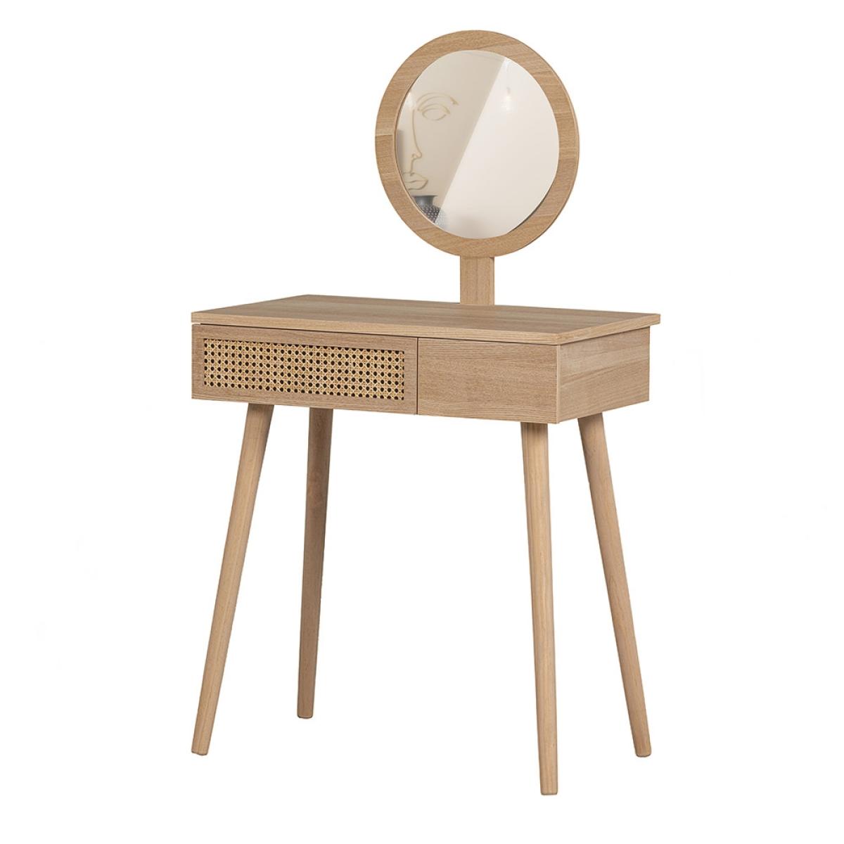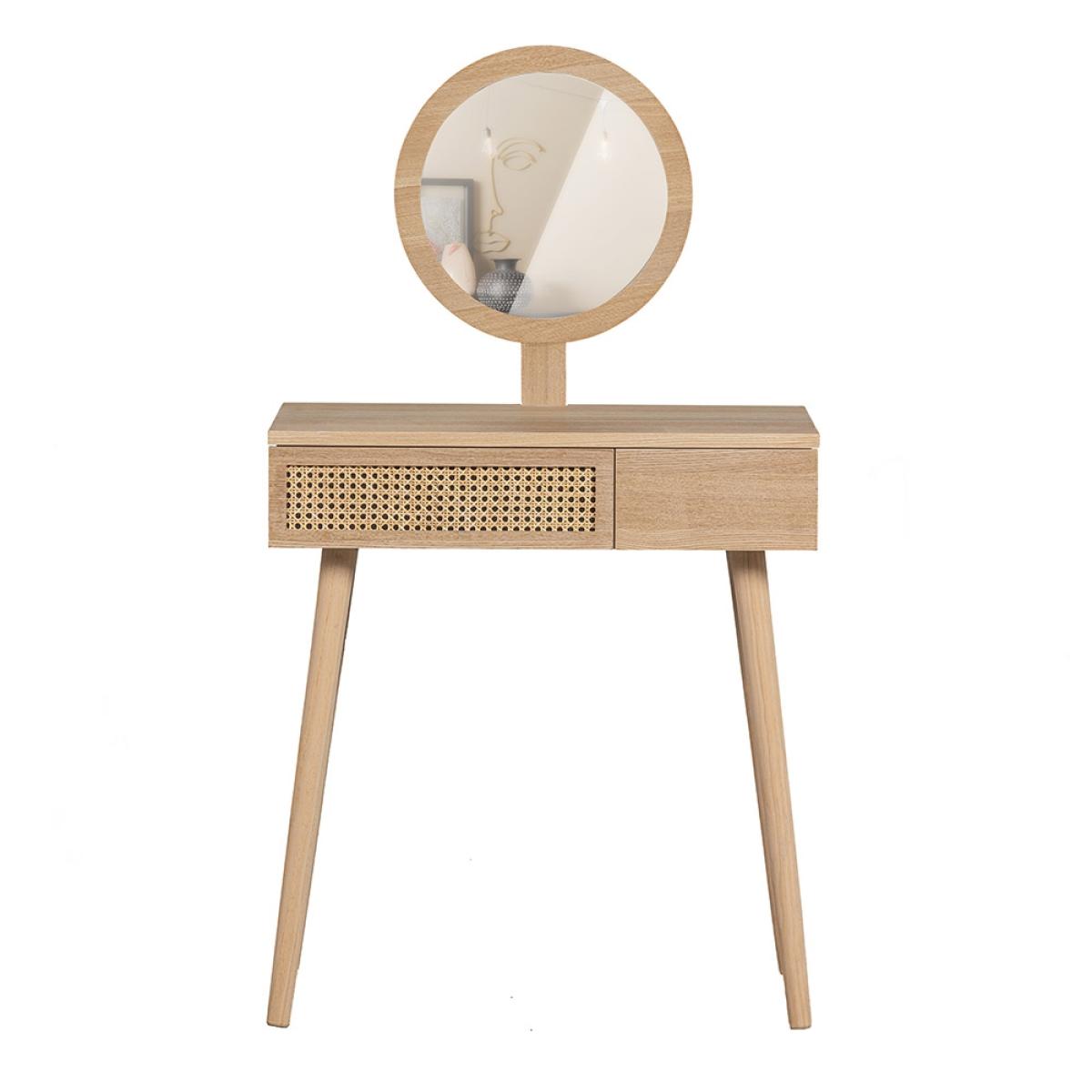 The Woood Soof Dressing Table with Mirror is stylish little dressing table that would be perfect for a small or guest bedroom. Perhaps the perfect thing your little darling who is growing up and requiring their first beauty station? Smooth finished pine wood with a rattan drawer front and a minimalist round mirror and give a cool retro Scandi feel to the piece. Simply gorgeous!.
