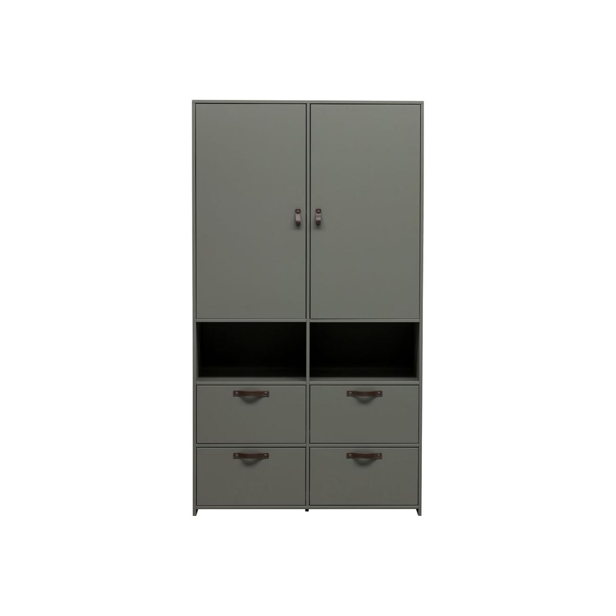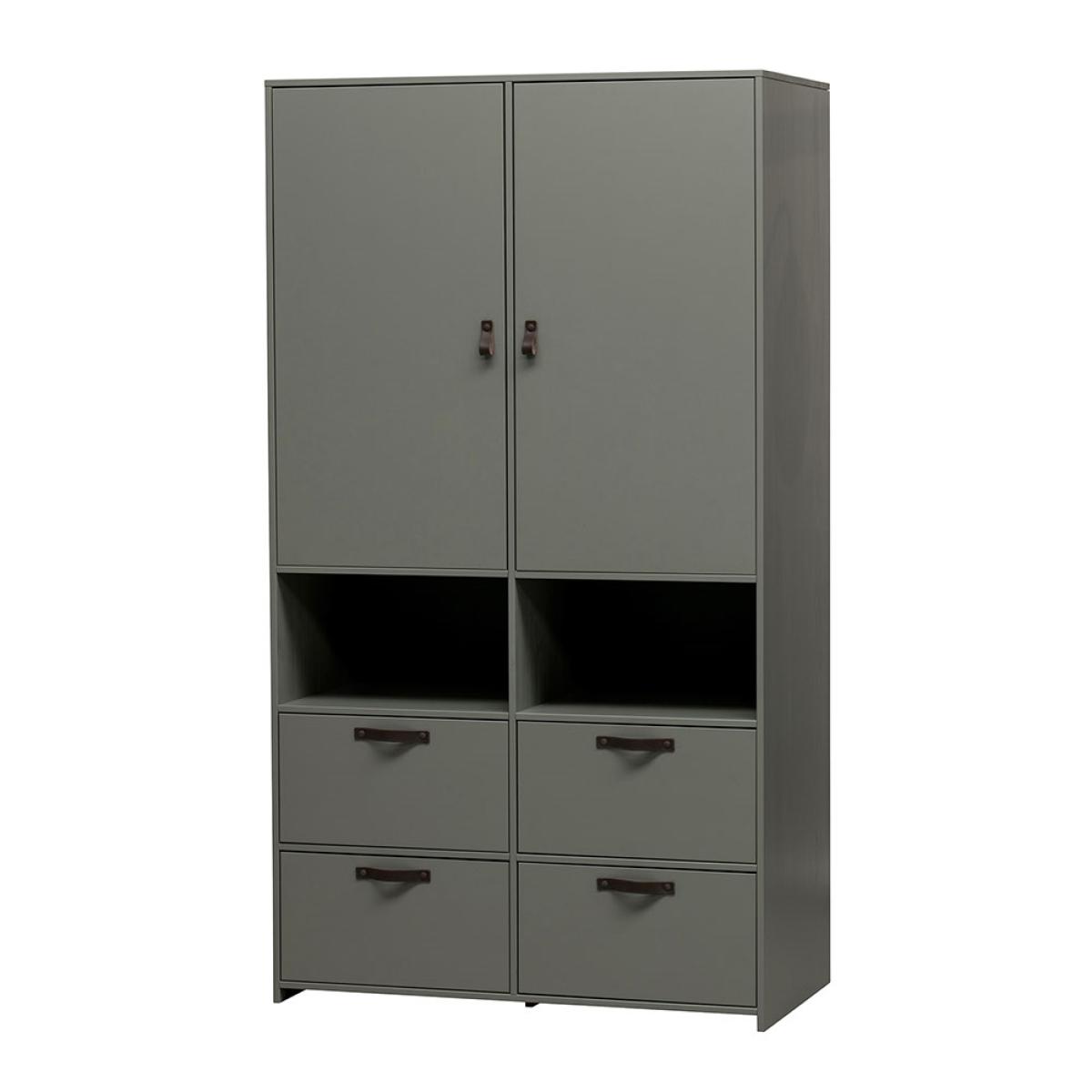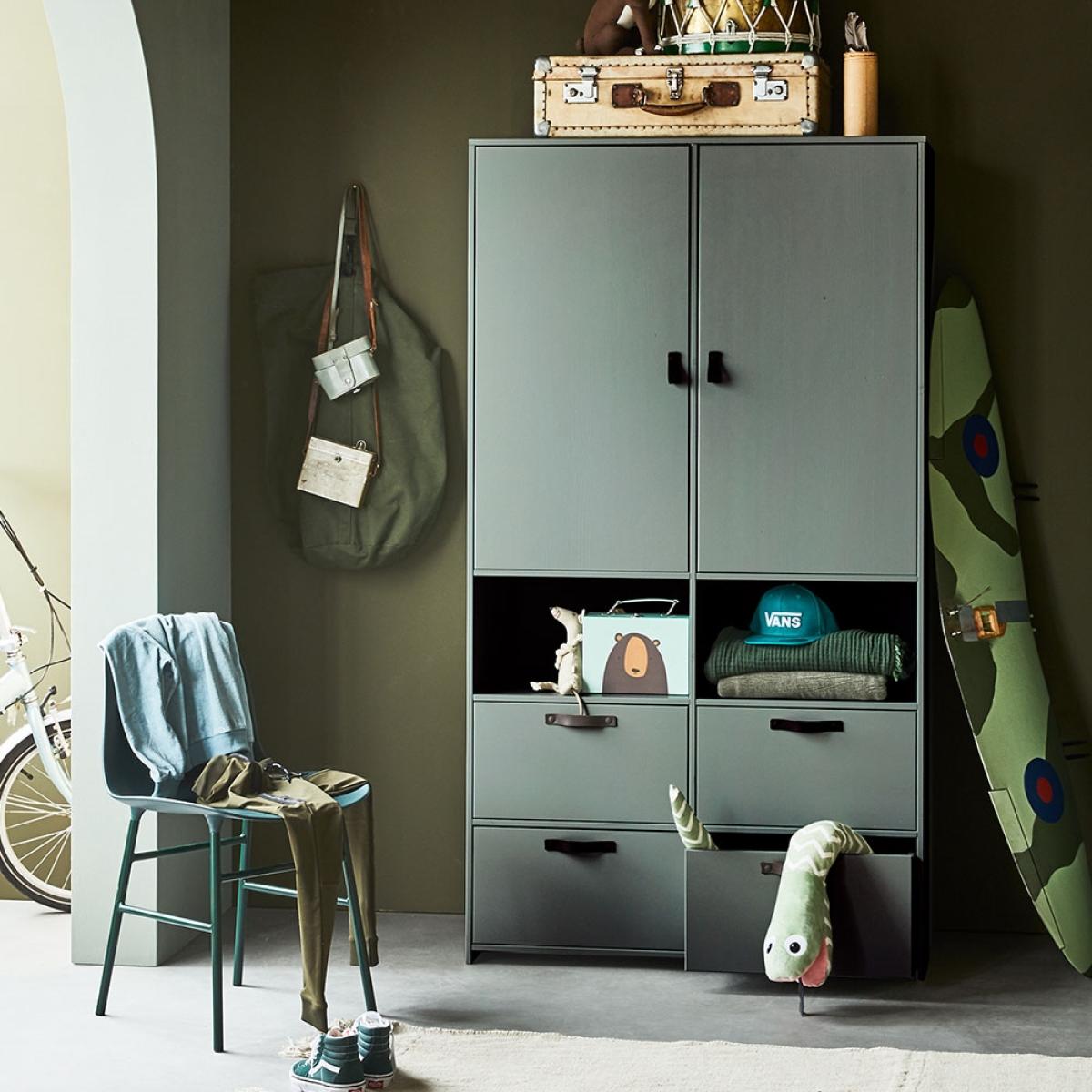 Keep those things neatly stored away in the Stage Pine Cabinet from Woood. With all the compartments this beauty has, there will be ample space for all of your kiddies bits and bobs. Finished in a gorgeous khaki green with brown leather handles, this wardrobe will add a cool contemporary feel to their bedroom. Complete with two large cabinets fitted with shelves, two open sections and four drawers, you certainly won't be short on space! Everything will have its place when you've got this cabinet to help you.