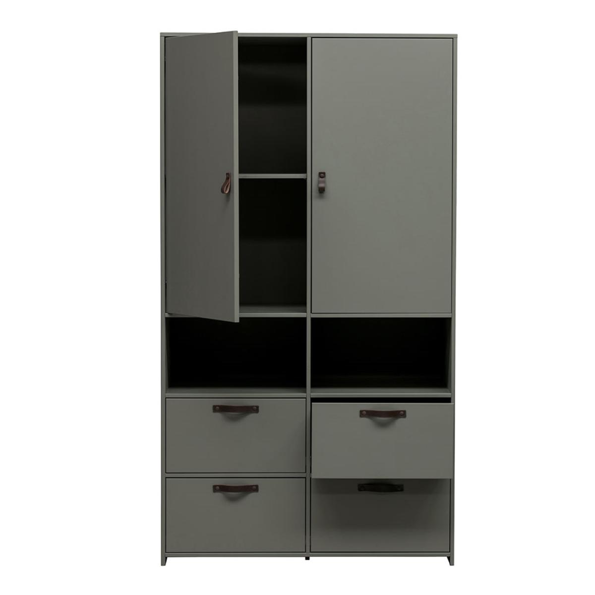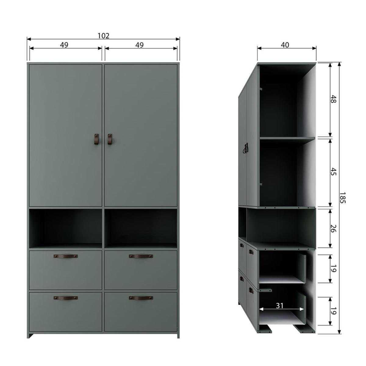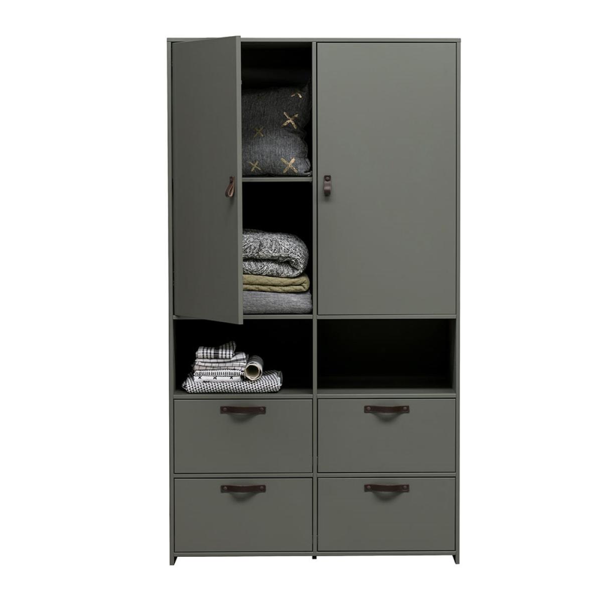 Keep those things neatly stored away in the Stage Pine Cabinet from Woood. With all the compartments this beauty has, there will be ample space for all of your kiddies bits and bobs. Finished in a gorgeous khaki green with brown leather handles, this wardrobe will add a cool contemporary feel to their bedroom. Complete with two large cabinets fitted with shelves, two open sections and four drawers, you certainly won't be short on space! Everything will have its place when you've got this cabinet to help you.