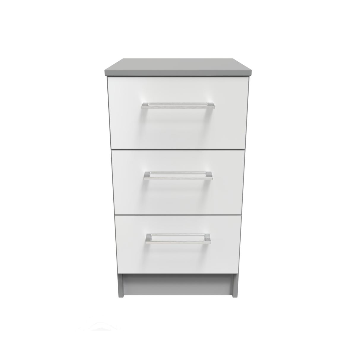 This 3 drawer bedside cabinet is practical and stylish. Perfect for any bedside or as a free standing storage unit. A elegant modern range, with solid metal pull bar handles and comes in a range of scratch resistant gloss or matt finishes. All our furniture is made in the United Kingdom, to the highest quality. It is delivered direct to your location of choice by one of our two man delivery teams, and come full assembled (although legs may be removed to prevent damage in transit).