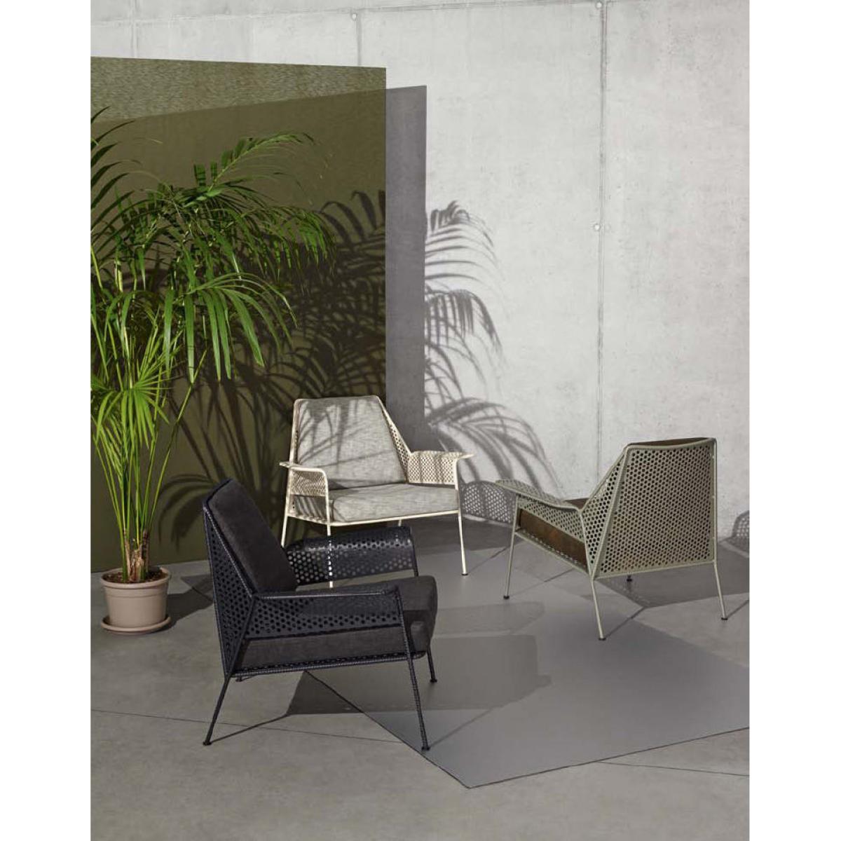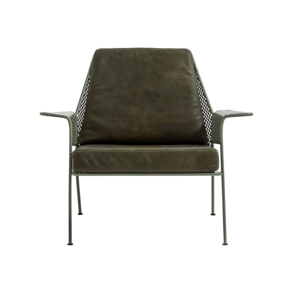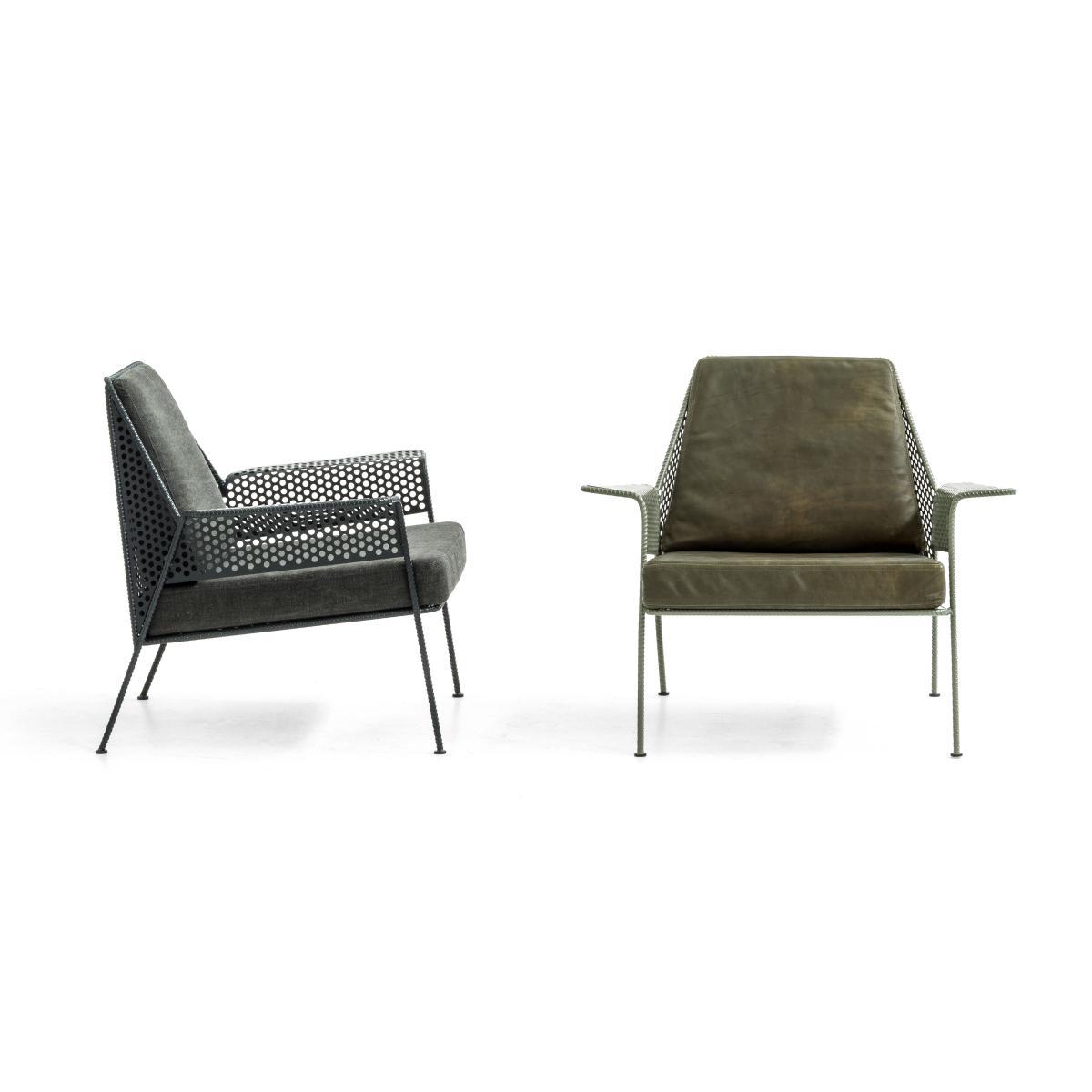 The new Work is Over armchair expresses the sobriety of industrial style in its lines while drawing inspiration from the aesthetics of the military and construction sites in its extreme functionality. Structural parts that usually remain concealed are here exposed to reveal all their beauty. The Work is Over concept is based on an ideal of hardness and rigidity that finally takes form in a soft, rounded object through the juxtaposition of straight and curved lines and the soft cushions that make the structure extremely comfortable. The armchair's silhouette gives it a strong identity enhanced by the combination of drilled sheet metal that serves both structural and decorative purposes. The chair is available in different colours and finishes for adaptation to every style and interior, The indoor version can be upholstered in leather or woven fabric in order to emphasize the texture contrast and accent the beauty of the unworked material. The outdoor version is proposed instead in a special selection of resistant fabrics without the addition of any embellishments not structural to its form.
