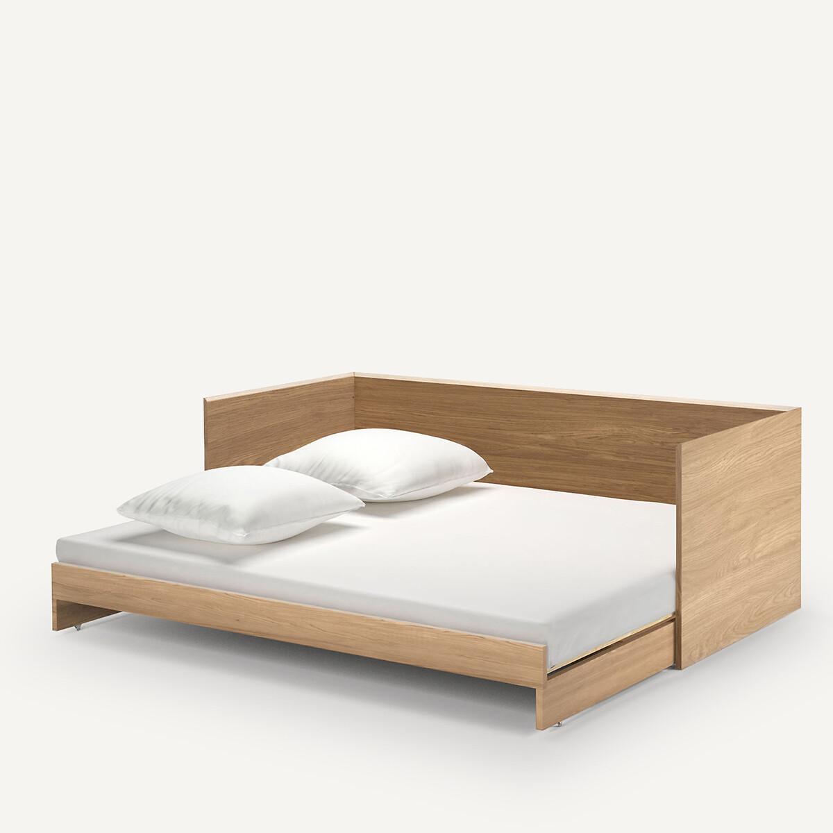 Our 'Working' sofa bed is a highly innovative, space saving solution. Smart, practical and easy to adapt, it can be used as a cosy single bed or extended to create a comfortable double bed. Product Details • Made from FSC® Mixed oak veneered wood panels • Nitrocellulose Matte finish • Bed base with extendable slats • Sleeps 2 people of similar height • Suitable for mattresses 90 x 200cm (thickness less than 12-14cm) (to be found on our site)Dimensions • Single: 99 x 205 x 74cm • Double: 180 x 205 x 74cmDelivery:. Assembly required. Available for home delivery. • Made in Europe. • WOOD FROM MORE SUSTAINABLY MANAGED FORESTS AND CONTROLLED SOURCES. FSC® Mix wood contains at least 70% FSC® certified and/or recycled wood, the remainder being FSC® controlled wood. Dimensions and weight of parcel3 parcels • L113 x H7 x D81cm - 25.4kg • L20 x H7 x D81cm - 28.5kg • L216 x H28 x D101cm - 43kg