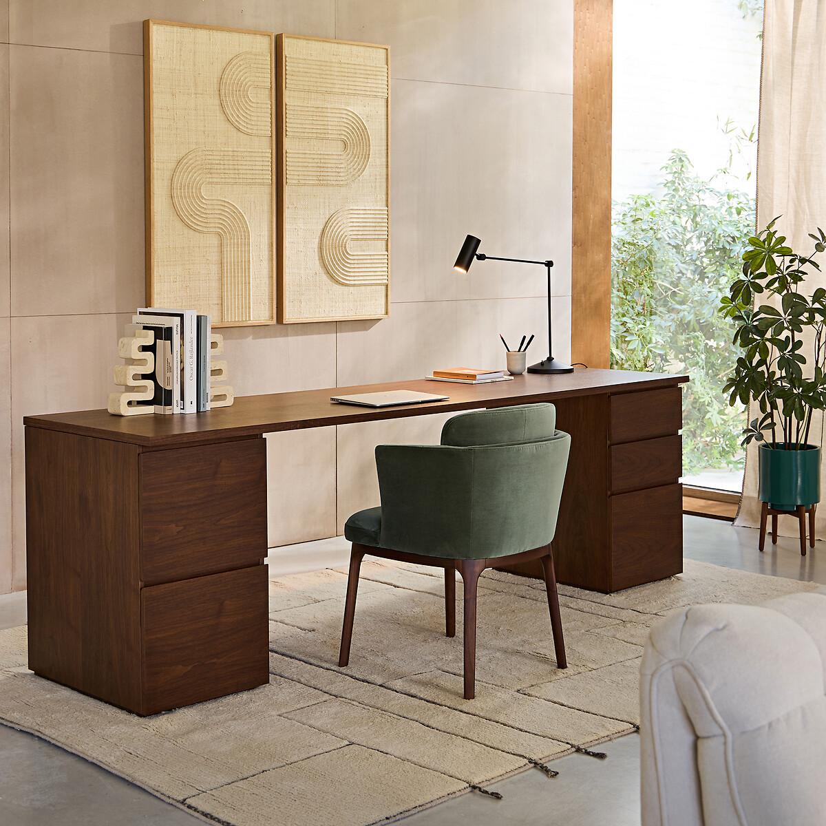 I’m a fan of this walnut desk top for its generous 240 cm span and the rich, even grain that suits both modern and more traditional schemes. It works particularly well in a Scandi-inspired study with pale walls and black steel legs, or as the focal point of a mid-century setup with walnut-toned storage units and brass accents. Keep styling practical: leave plenty of clear surface around your monitor or laptop, tuck cables into a slim tray underneath and add a low-profile desk lamp at one end. A simple ceramic planter, a neat stack of reference books and a leather desk mat will bring warmth without overcrowding. If you need more storage, pair it with floating shelves in a matching tone to maintain a streamlined look.