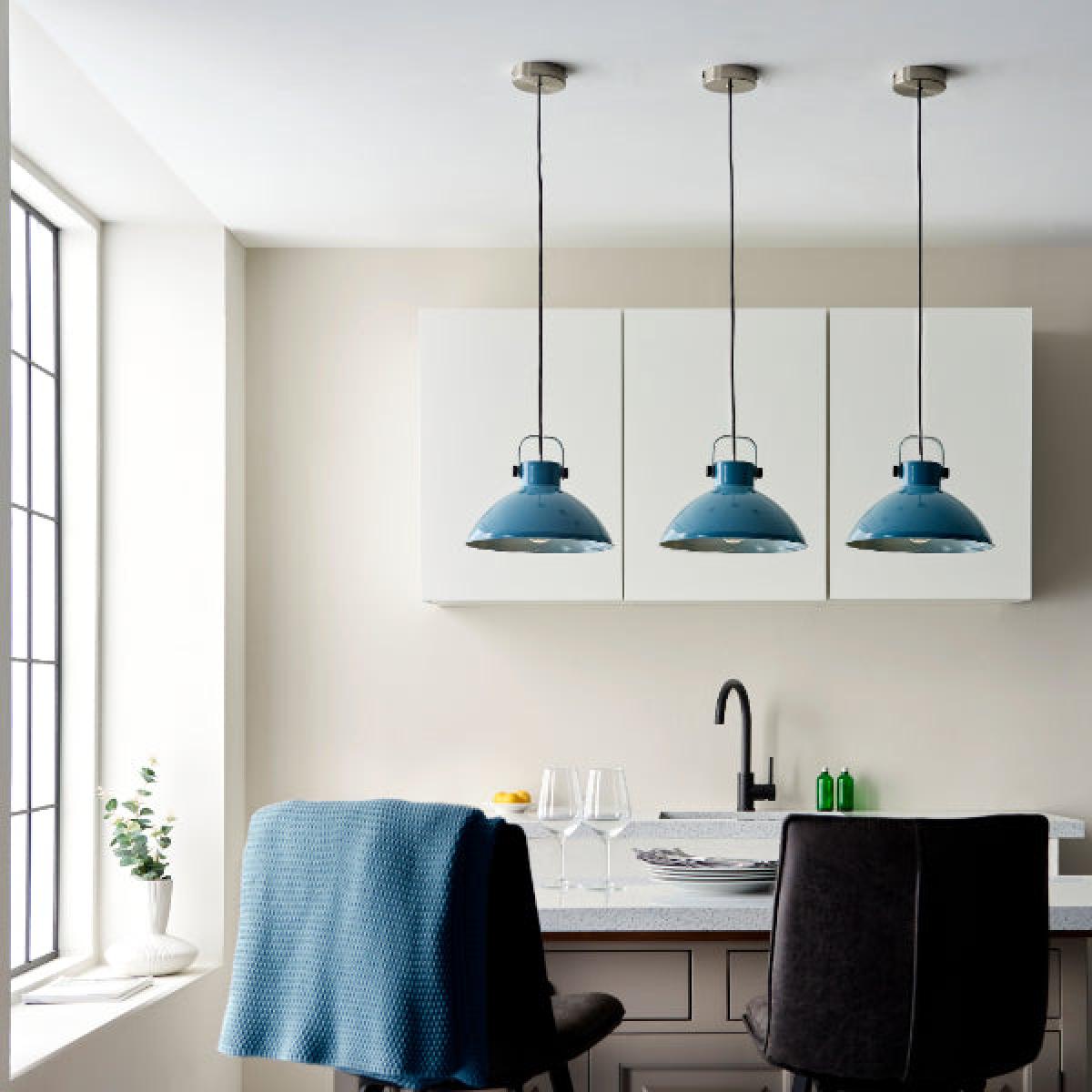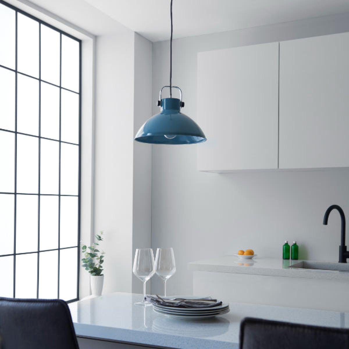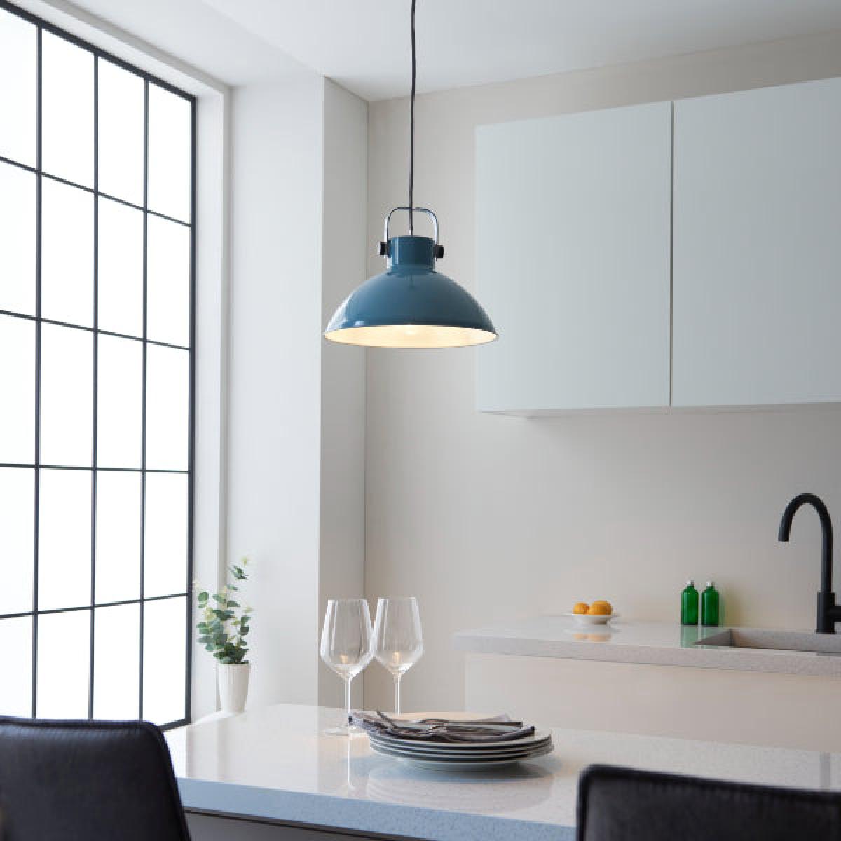 I love this workshop blue pendant shade for its understated industrial charm and versatile colour. It works particularly well in modern, minimalist kitchens or dining areas where you want to add a subtle pop of colour without overwhelming the space. It’s also a great choice for creating a statement in open-plan layouts due to its clean lines and practical size. To style it effectively, consider pairing it with natural textures like wood or concrete for a balanced look, and ensure it hangs at a height that provides good task lighting without obstructing views. This shade’s colour complements a range of colour palettes, from crisp whites to darker hues, making it a flexible option for many interiors.