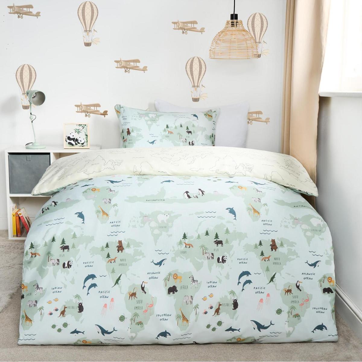 The World Map Print Reversible Duvet Cover Set is an educational and visually appealing bedding option that will inspire young explorers and animal lovers. One side of the duvet cover showcases a detailed world map globe design, complete with labeled continents and adorable animal illustrations placed according to their native regions. The refreshing bluegreen background adds a vibrant and colorful touch to the room, making learning about geography and wildlife fun and engaging. For a contrasting look and a change of pace, simply flip the duvet cover to reveal the same world map design outlined against a crisp, light green background on the reverse. Crafted from quality materials, this reversible duvet cover set offers both comfort and durability, ensuring a cosy and restful sleep for your little one.