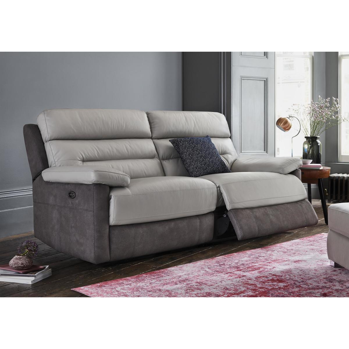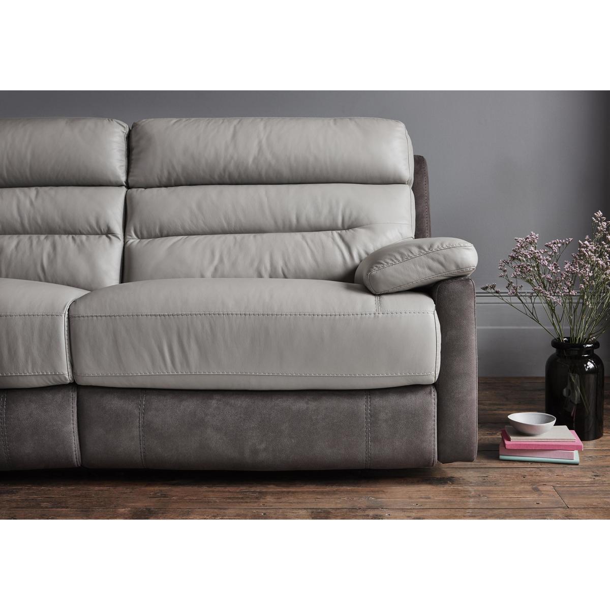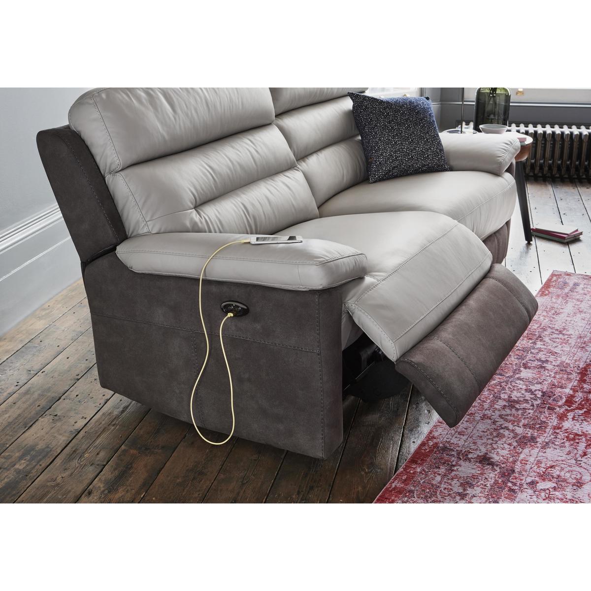 Pocket sprung seats for a softer, more supportive sit. Automatic, power recliner comfort. Beautifully upholstered in a high-quality leather and fabric mix. Discover comfort in a class of its own with the World of Leather Dual 2 Seater Leather and Fabric Mix Power Recliner Sofa. Perfect for easy-living, the cosy, supportive design features foam-wrapped pocket sprung seats for softly cushioned comfort. Back cushions are fibre filled and softly curved in all the right places for an incredibly supportive sit. The stylish upholstery mix of leather and fabric complement the padded, angled arms for a contemporary look. Power recliners are operated with a push button, so you can have your feet up in no time and enjoy the first-class cushioning of this wonderfully snug sofa. We also offer this sofa in a full fabric or leather design. Please call us on 0800 804 8879 to find out more and to discuss our extensive selection of leather and fabric grades and colours. A Furniture Village exclusive, the World of Leather Dual 2 Seater Leather and Fabric Mix Power Recliner Sofa is part of the Dual range. Top tip: Some fabrics can show wear on areas of more use or in direct sunlight. To keep your fabric upholstery looking fresh, plump you seat and back cushions regularly if possible. Natural leather has unique marks and characteristics with variance in colour and texture, and softens with use. Smoothing the cushioned top prevents ‘puddling’.