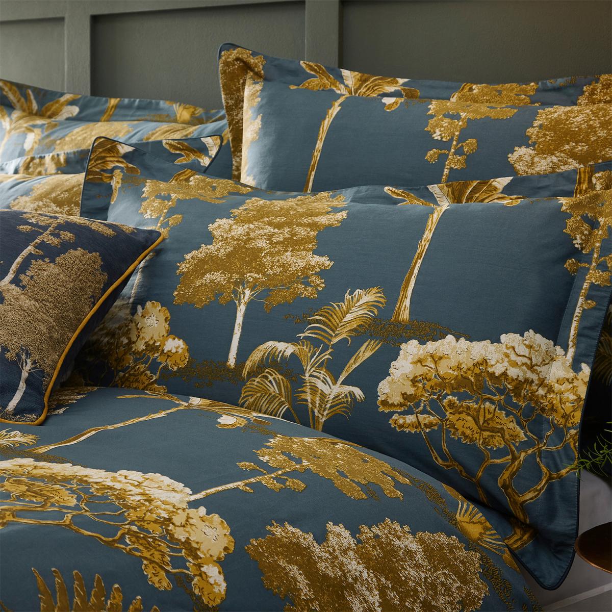Inspired by magnificent trees of the world, this design brings together majestic, ancient species, stretching high and displaying their beautiful fan-like foliage. Opulent, rich blue and royal gold tones give this soft 200 thread count sateen bedding a luxurious feel and featuring contrast piped edges for the perfect finishing touch. Pillowcases feature a piped oxford edge.