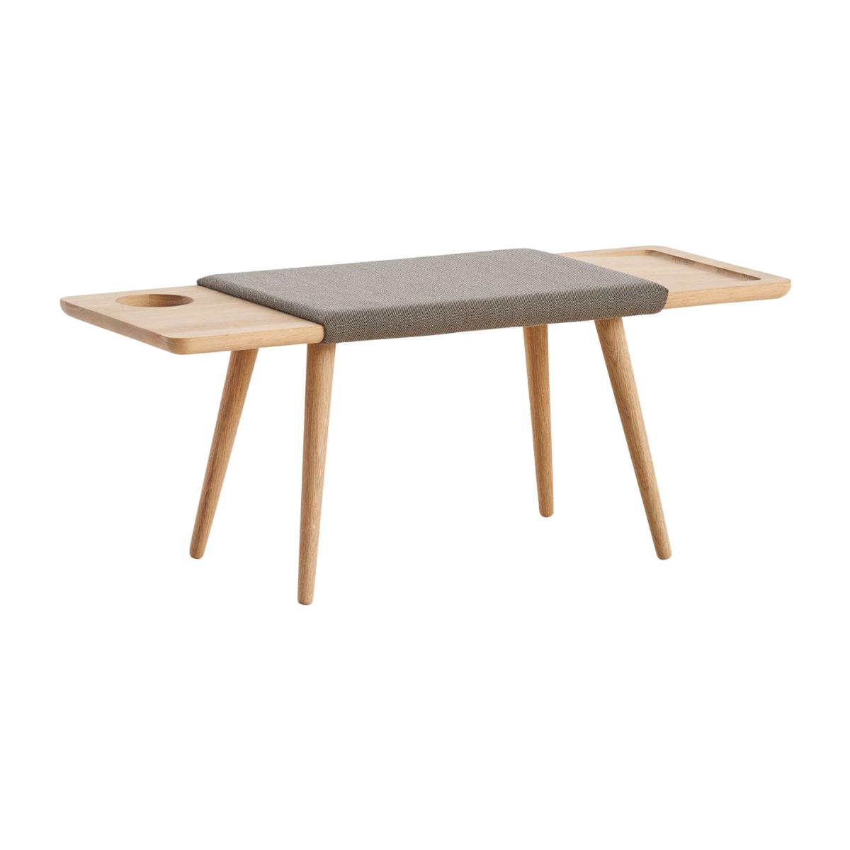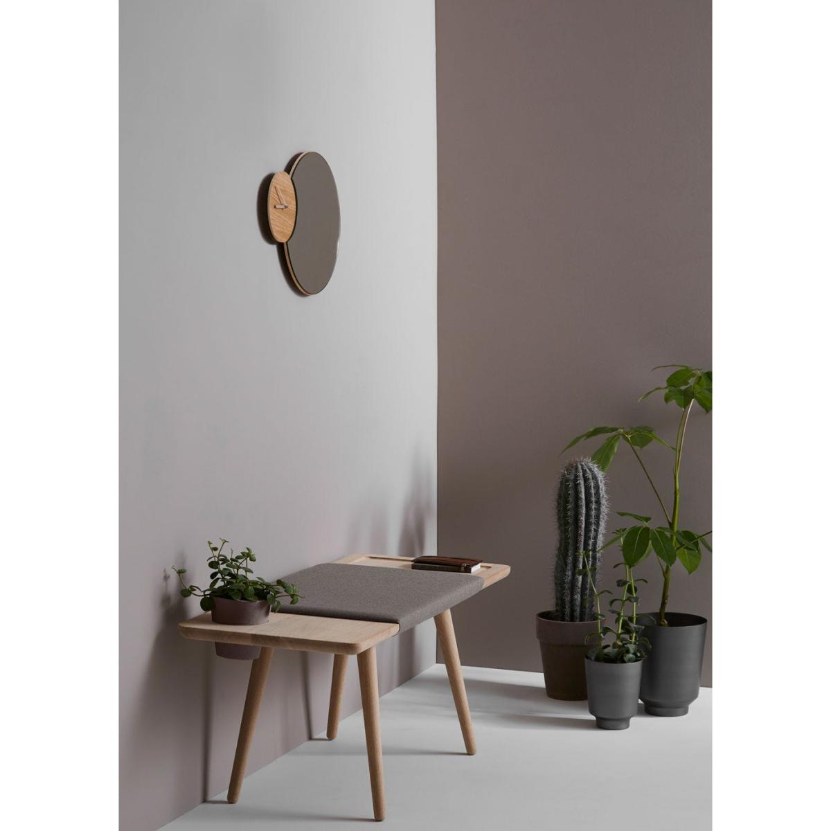Inspired by old cardboard embroidery thread bobbins, Studio Nur designed the Baenk Bench for Woud. An upholstered seat mimics thread wrapped around the bobbin whilst the oak seat makes use of clean, minimalistic lines. A circular hole cut into the surface is the ideal spot for an umbrella or plant.