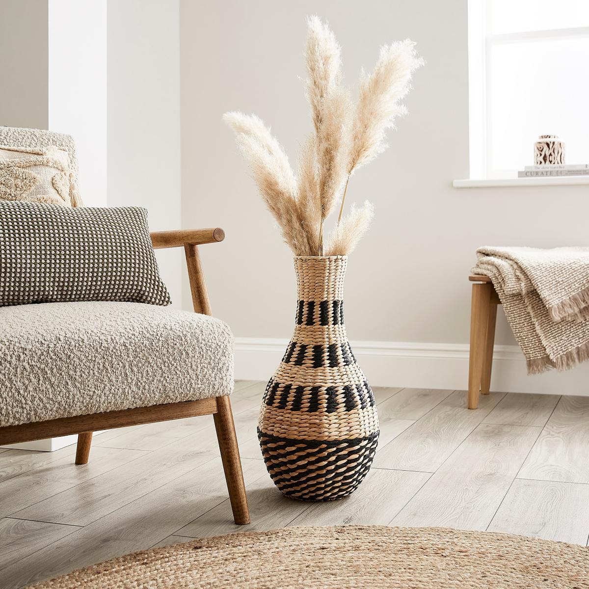 * Graceful shape* Perfect for artificial flowers* Black stripe and weave detail* Woven from natural rush* Not suitable for water This black and natural patterned woven jug vase is made from natural rush and is ideal for boho interiors. This vase is perfect for displaying artificial flowers for a lovely feature and is a great size for setting on the floor, bringing height and impact to your decor. Please note: not suitable for water. Take care when placing on painted or polished surfaces.