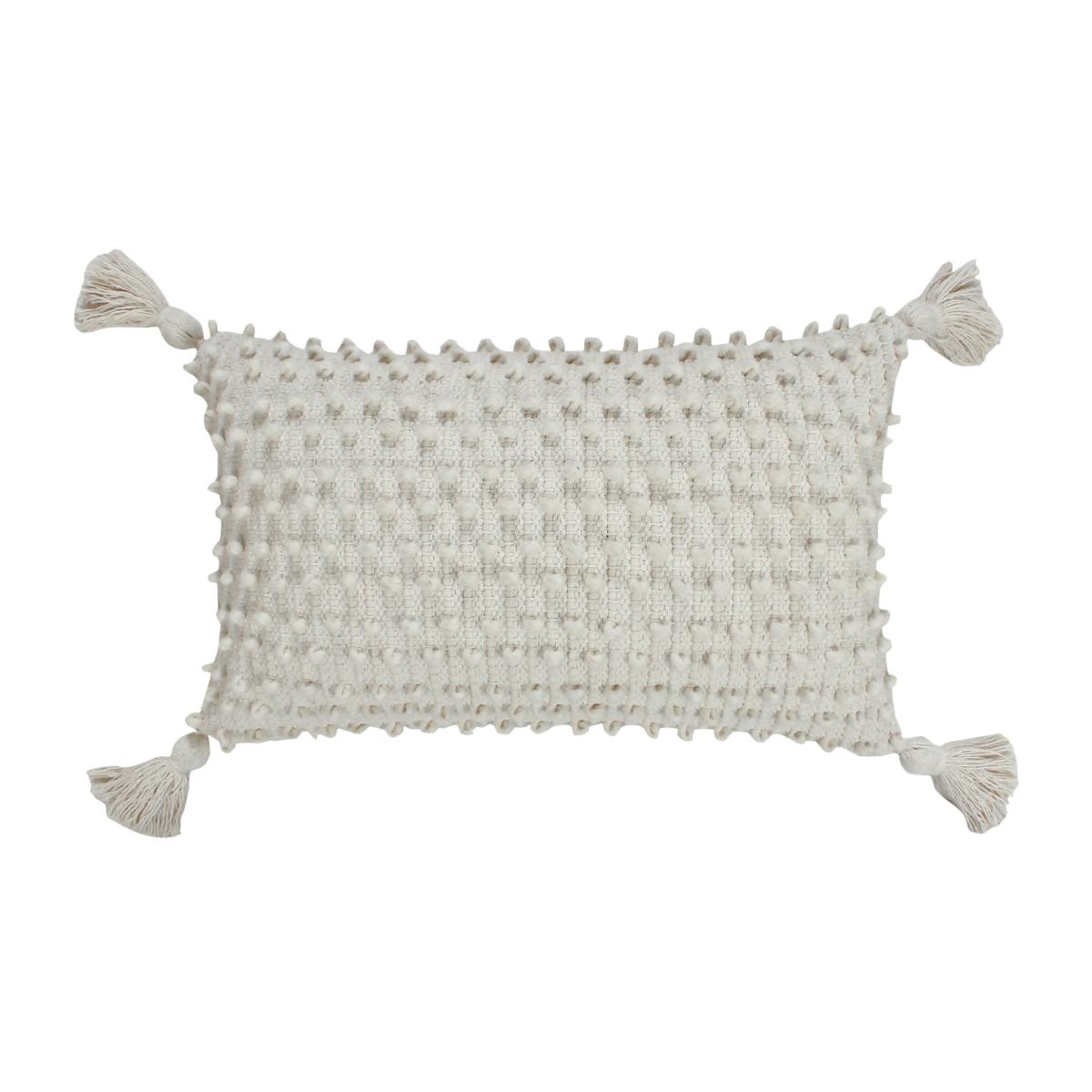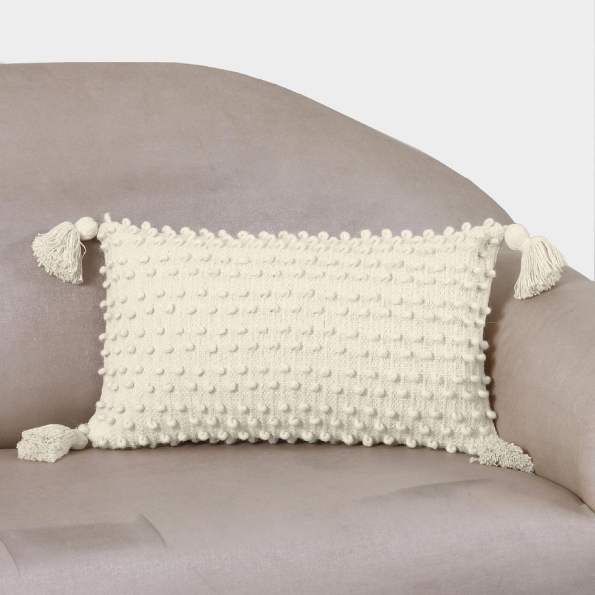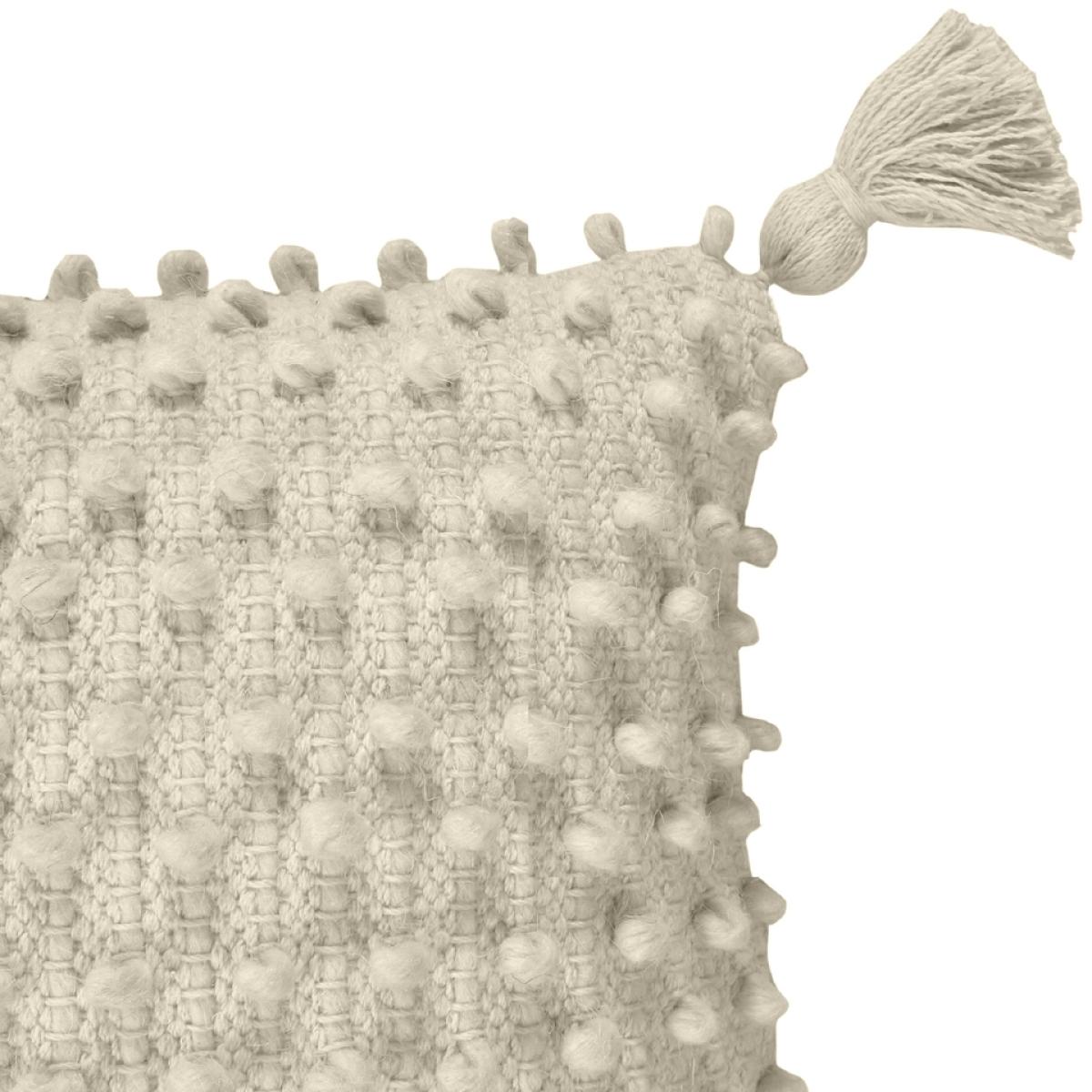 With its woven fabric and bobbled front, this natural coloured cushion is prefect for adding some texture to your living space. Finished with some statement tasselled corners, this rectangular cushion is sure to add some relaxed, boho charm to your home.