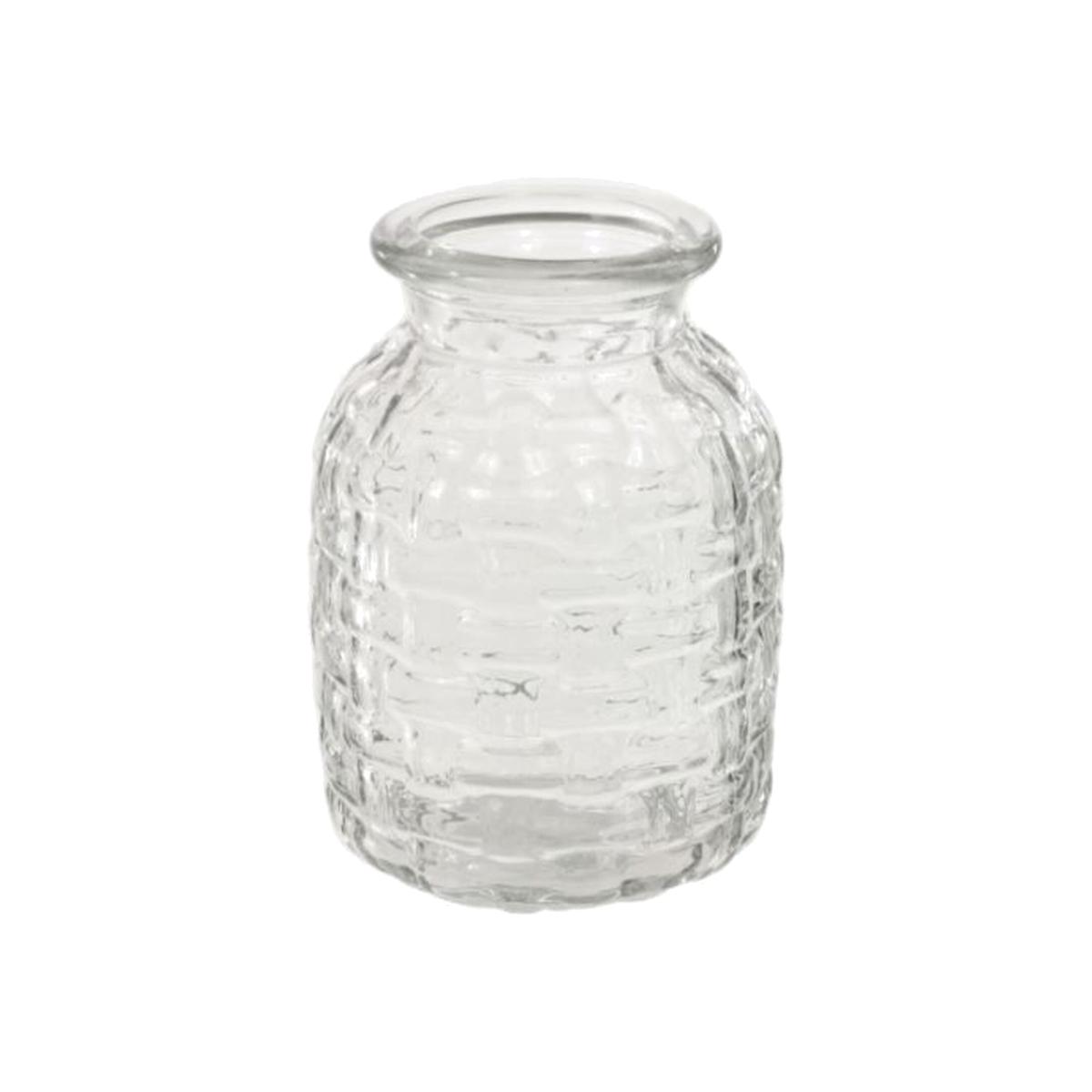 Pretty glass vase. Woven effect embossed design. Ideal for displaying small bouquets of real or artificial flowers. Choice of colours: Clear, pink or grey. Height of vase is 16 cm. Can be used as a decorative item.