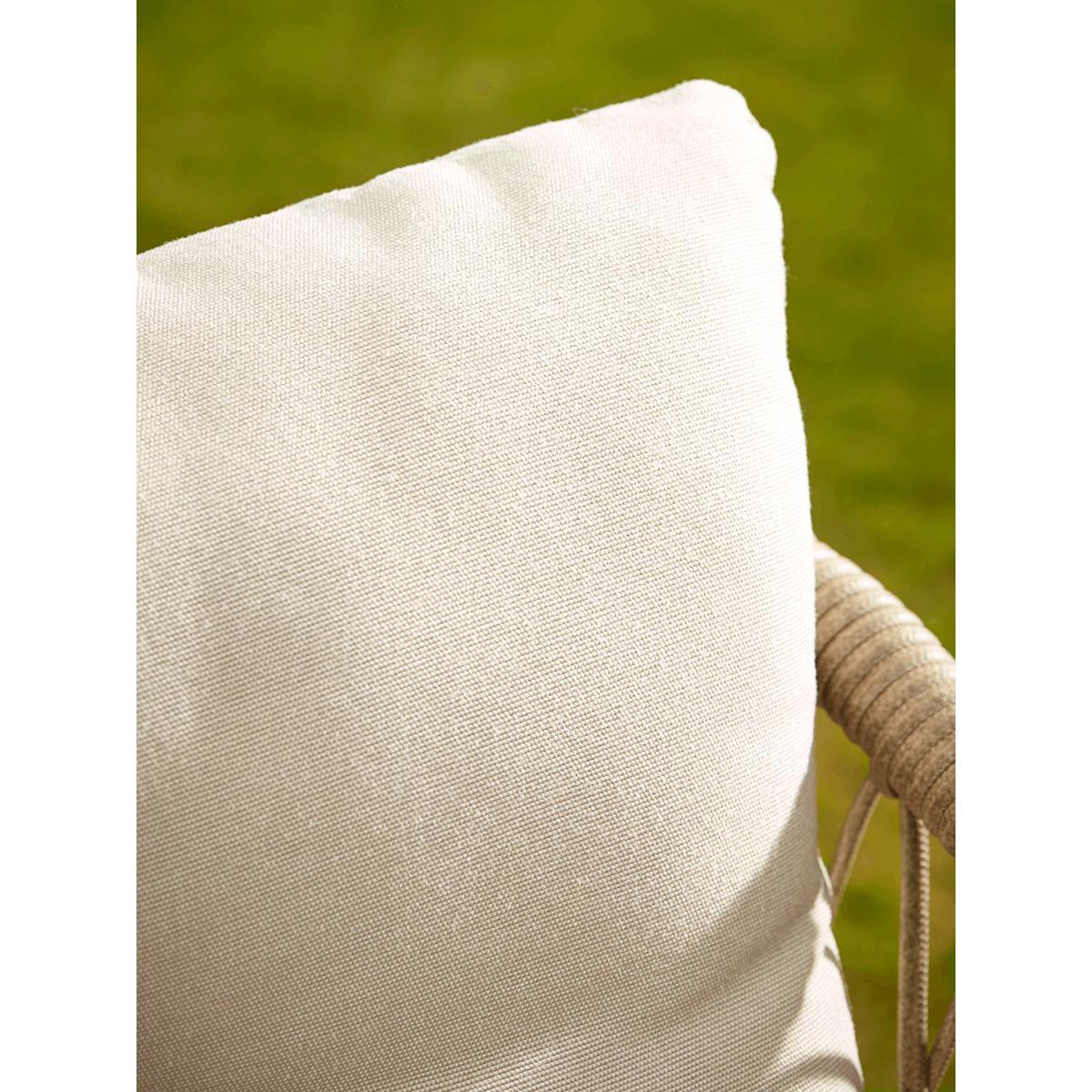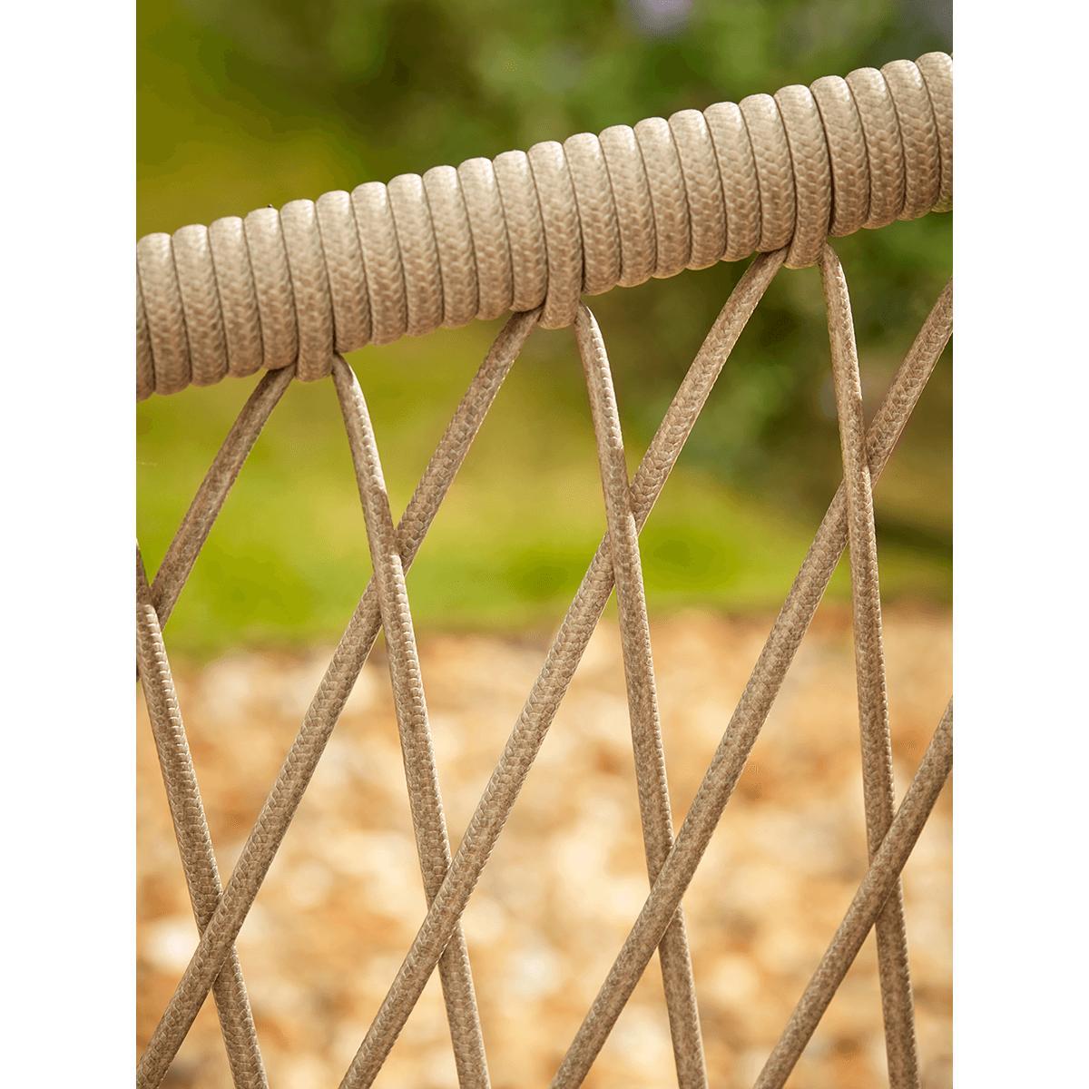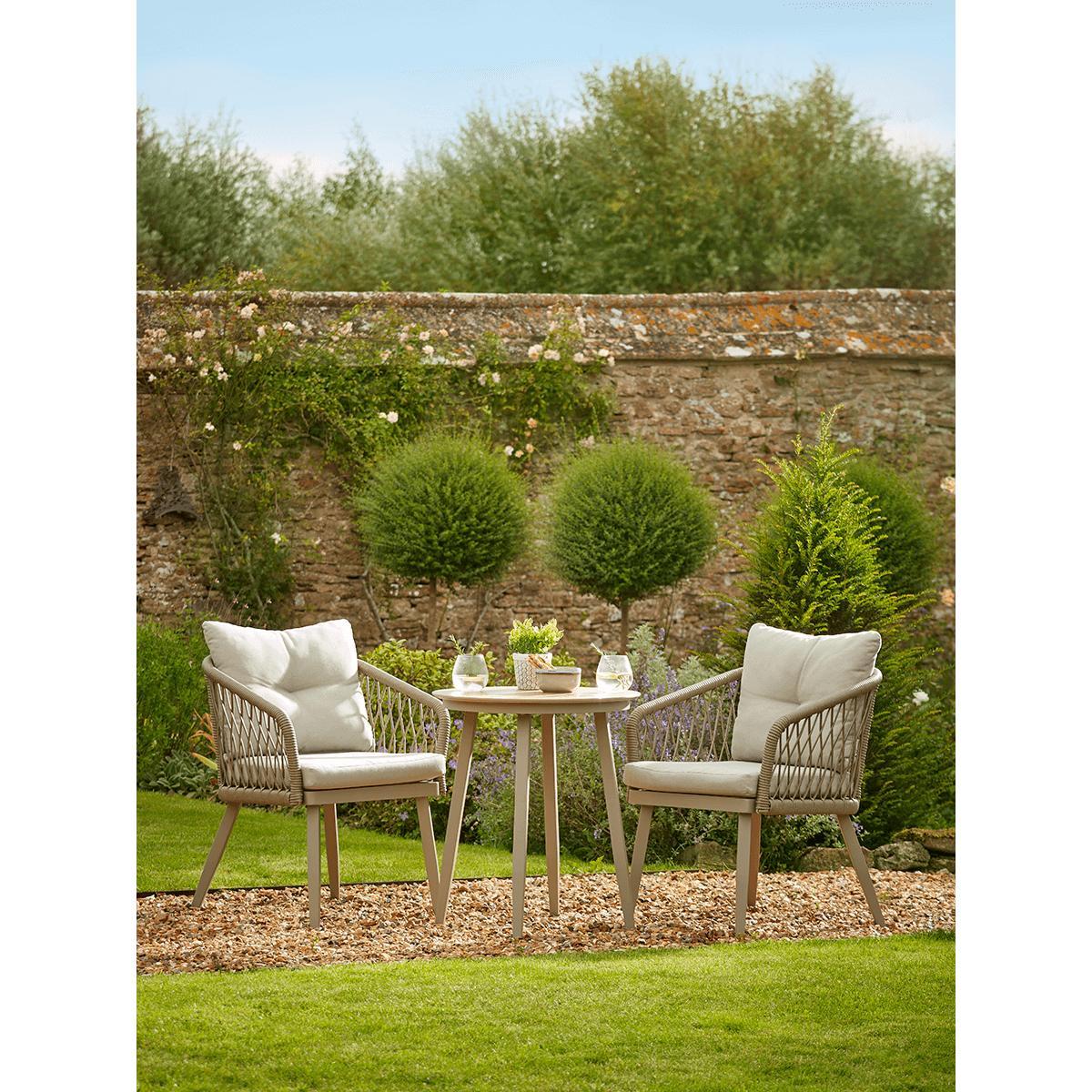 Complete with a petite table and two square-shaped chairs, our stylish bistro set is ideal for intimate meals or coffee with a friend in your outdoor space. The woven rope design of the chairs is off-set beautifully by slender legs, a cosy grey seat cushion and a simple, round table for drinks and snacks. The table is made from a clever wood-effect composite, and each aluminium frame is powder-coated to prevent rusting.