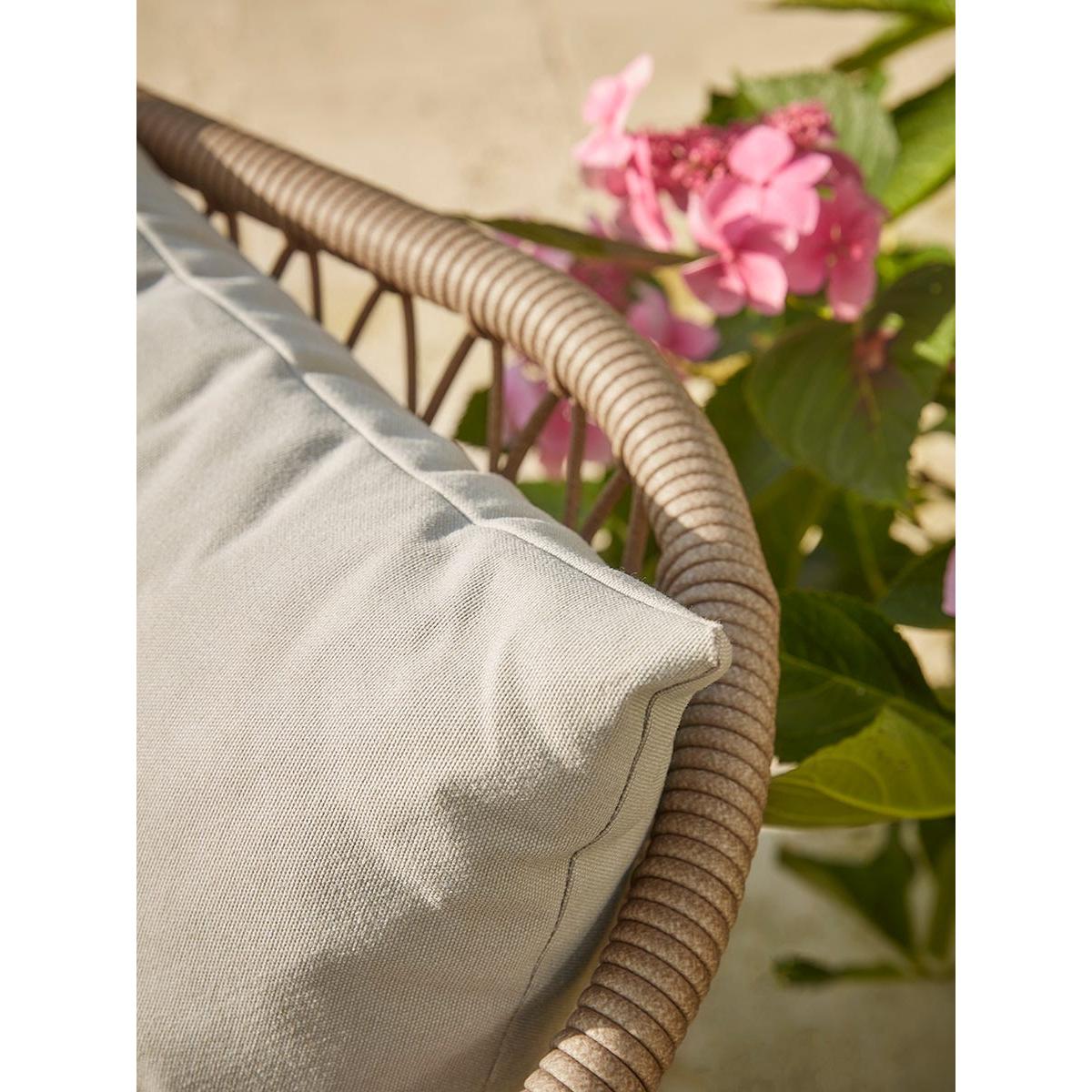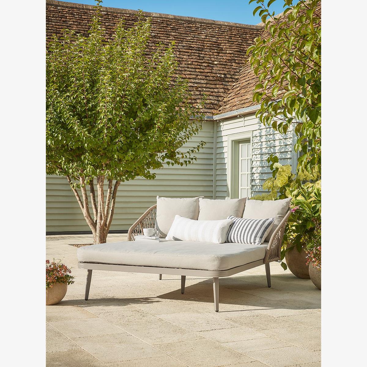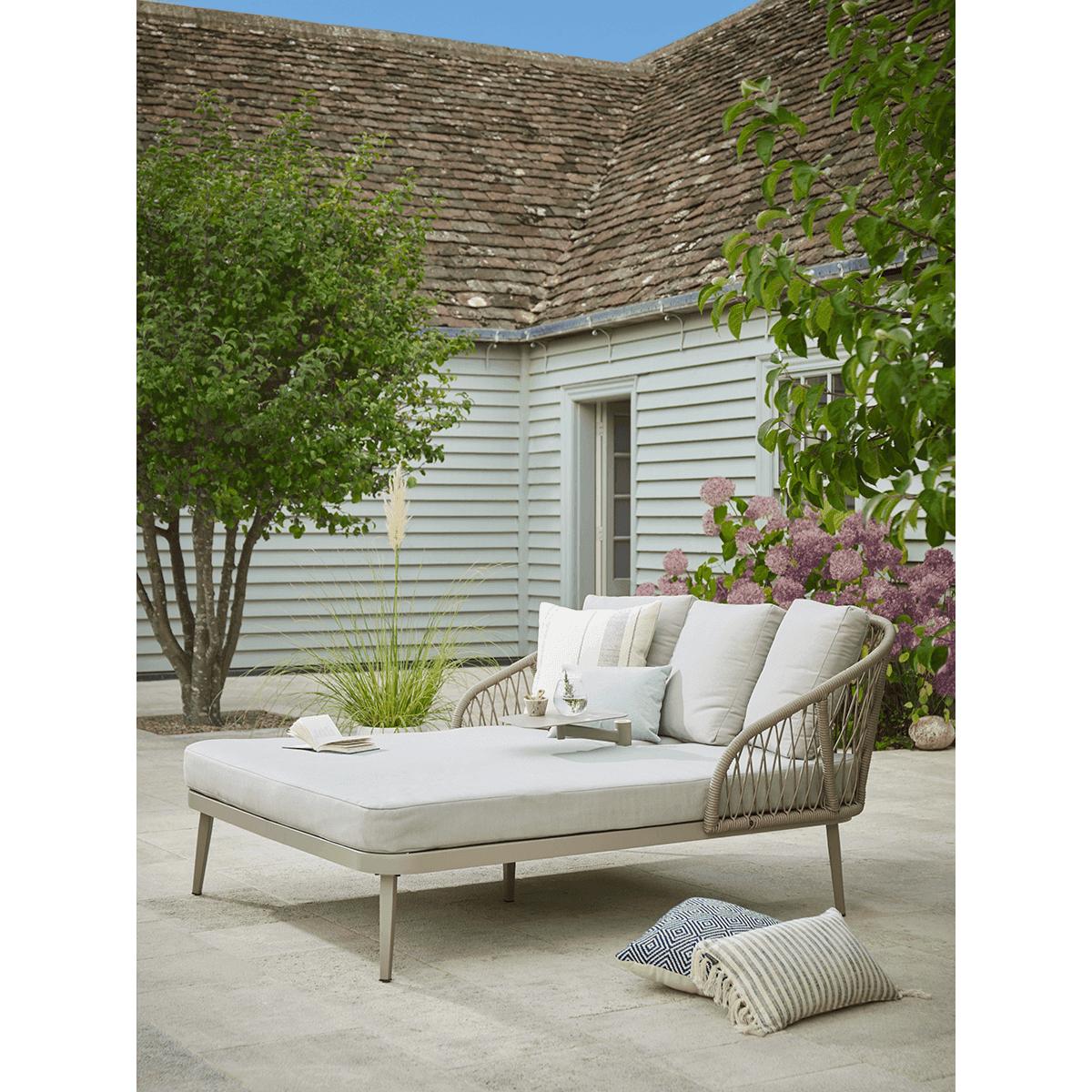 The perfect platform from which to idle away the brighter days, this elegant day bed is the epitome of stylish lounging. A soft taupe woven faux rope back rest wraps around the head of the metal bed frame giving it an almost 1930s coastal vibe. A luxurious mattress and back cushions mean that comfort is a given. This envy-inducing piece will be equally at home in traditional or contemporary gardens or in the conservatory in the cooler months.