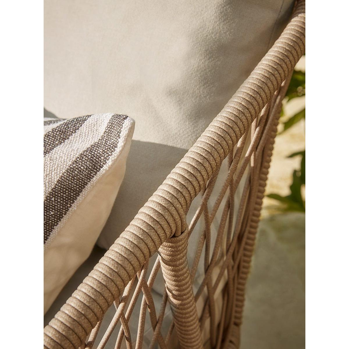 I love this garden lounger for its relaxed, yet sophisticated design. The woven rope detail adds texture and visual interest, making it an excellent statement piece in both contemporary and coastal-style gardens. It works well paired with neutral outdoor cushions for a laid-back feel, or dressed up with colourful throws and scatter cushions to add pops of colour. Practical styling tips include positioning it in a sunny spot or under a shaded tree to make the most of outdoor lounging. It’s versatile enough to sit alongside greenery, water features, or modern garden furniture, helping to create an inviting outdoor retreat.