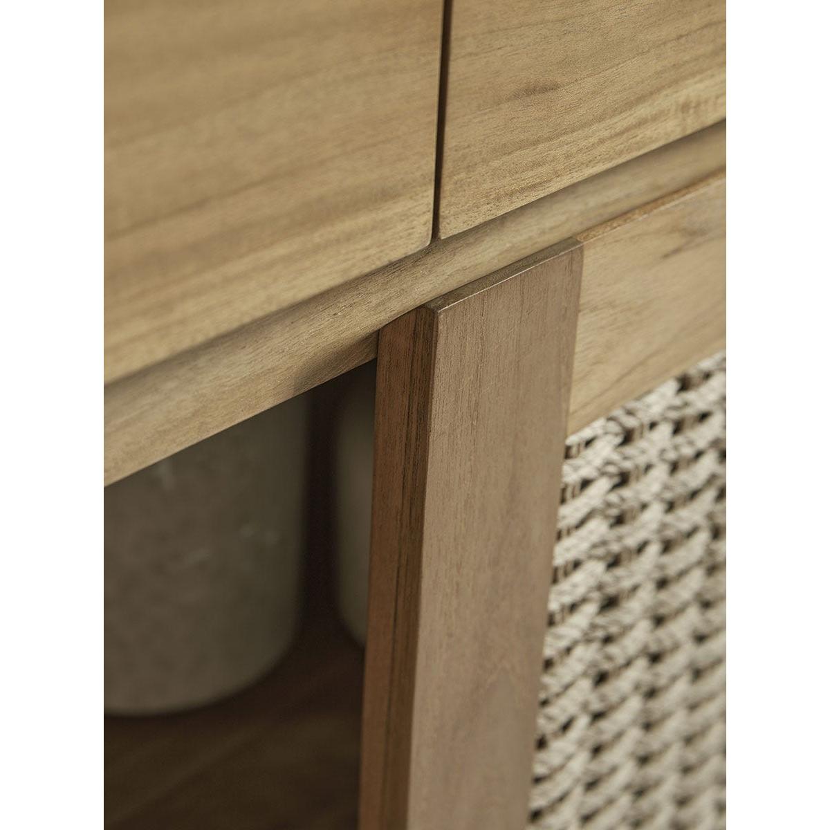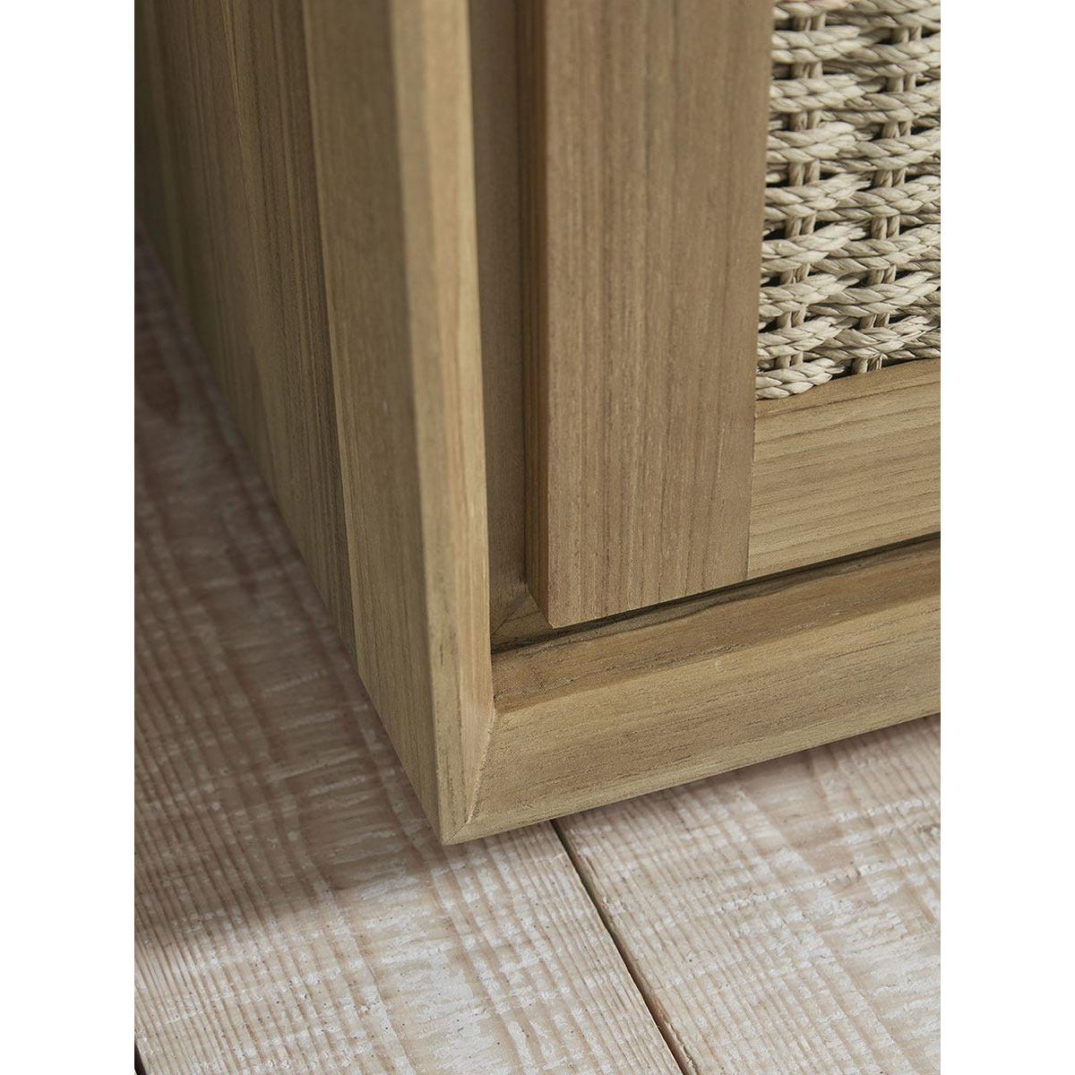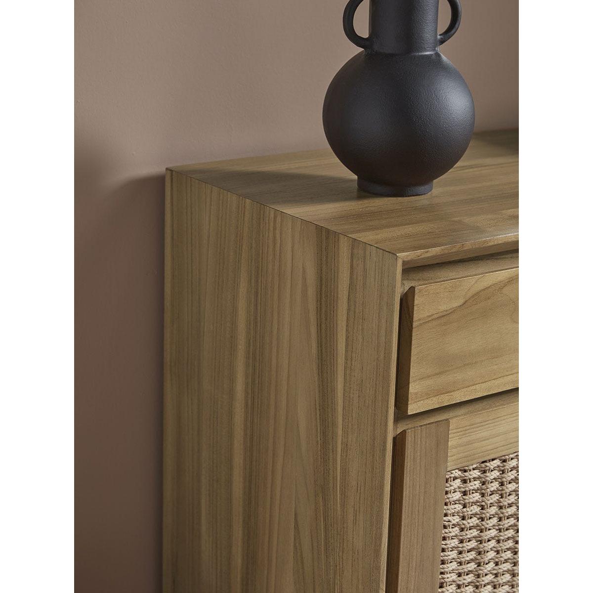 In a warming teak wood, this sideboard has a simple, boxy frame that works in our New Neutral trend and in a number of interior schemes. Providing plenty of storage, three drawers and three cupboards are set within the frame. Cupboard doors are fronted with a woven design that adds a welcome contrast to the simple frame, whilst the handleless design creates a sleek and modern finish.