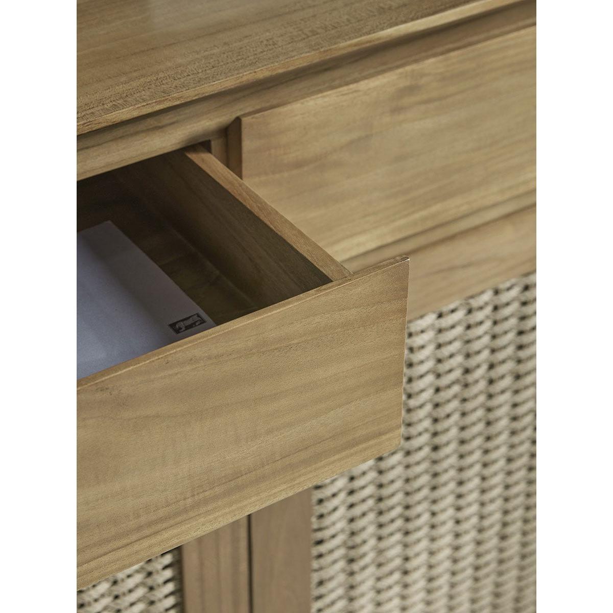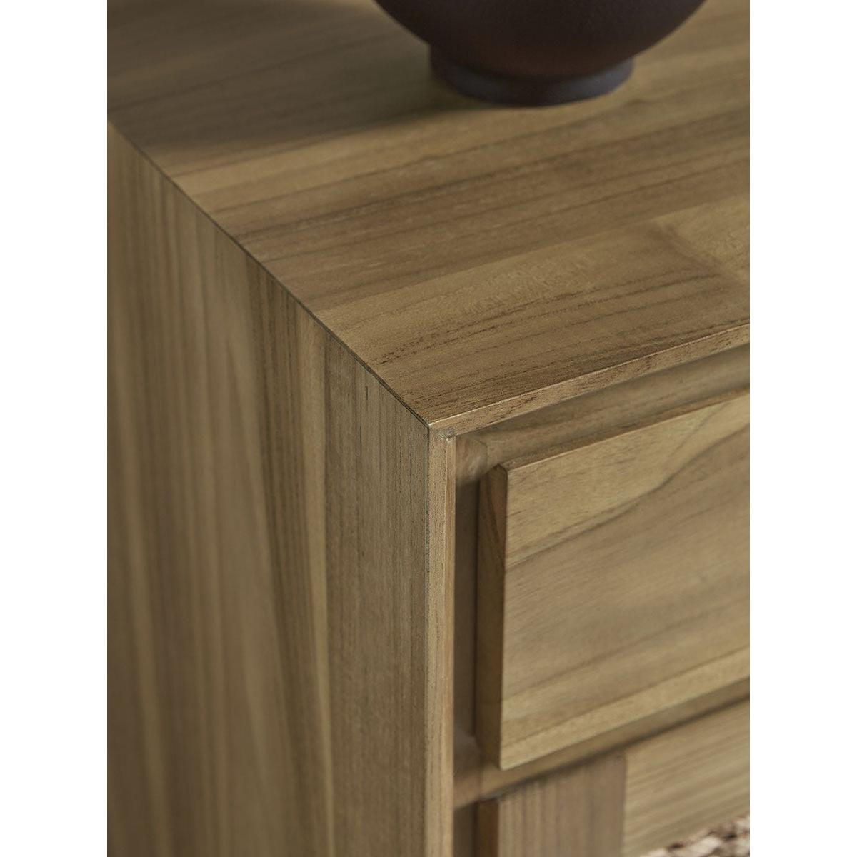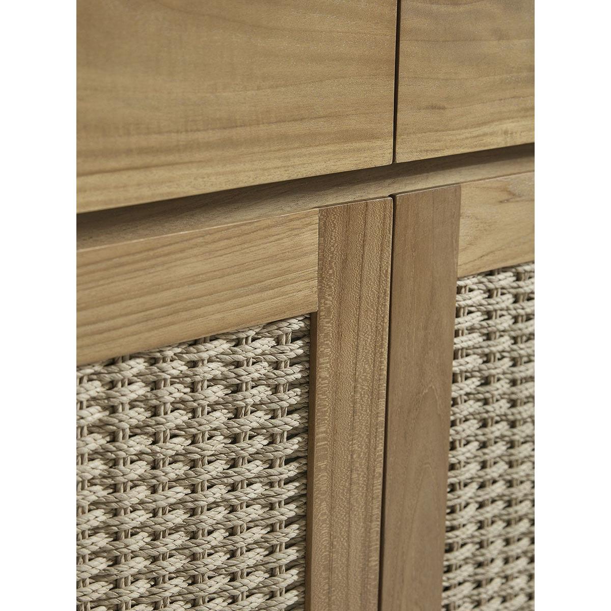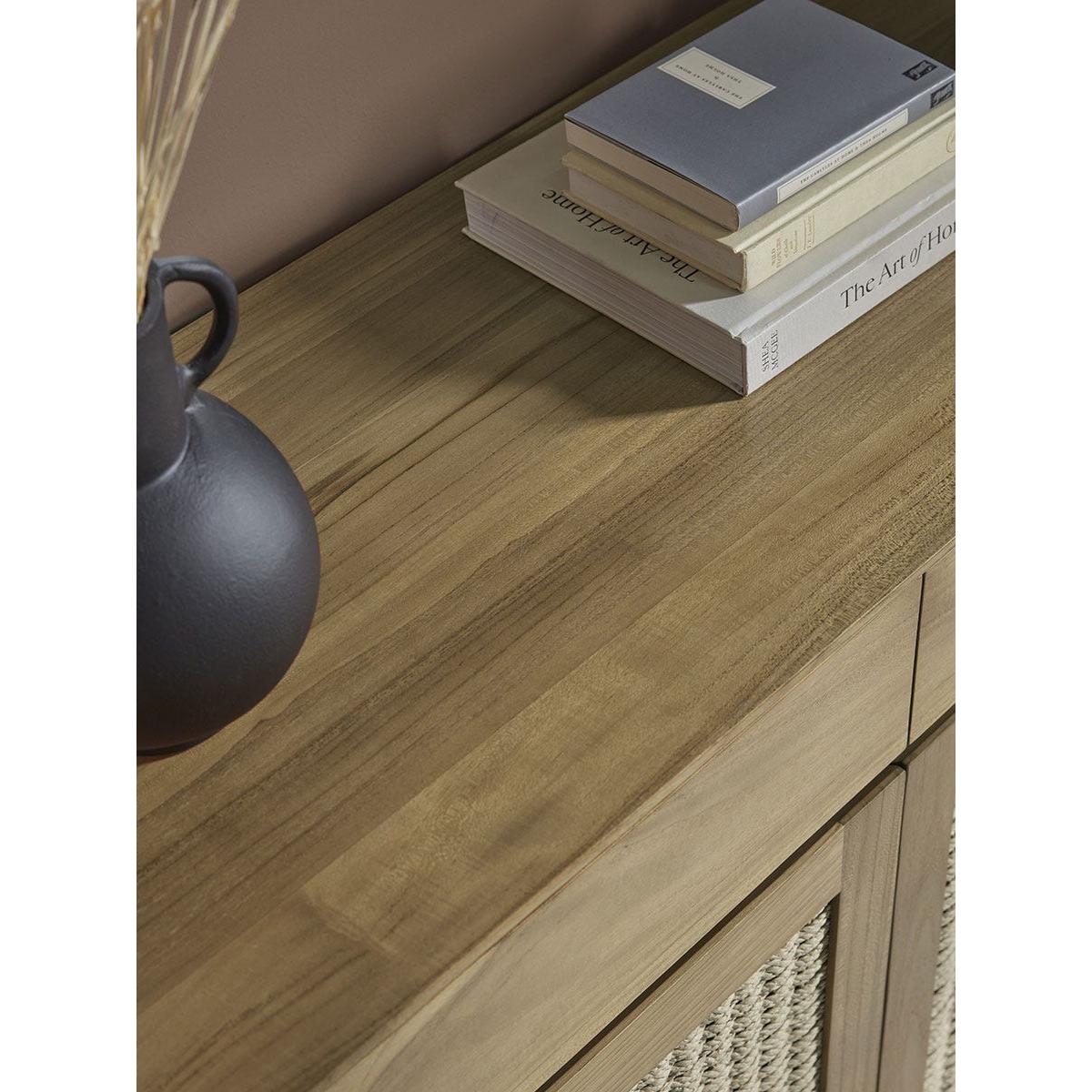 In a warming teak wood, this sideboard has a simple, boxy frame that works in our New Neutral trend and in a number of interior schemes. Providing plenty of storage, three drawers and three cupboards are set within the frame. Cupboard doors are fronted with a woven design that adds a welcome contrast to the simple frame, whilst the handleless design creates a sleek and modern finish.