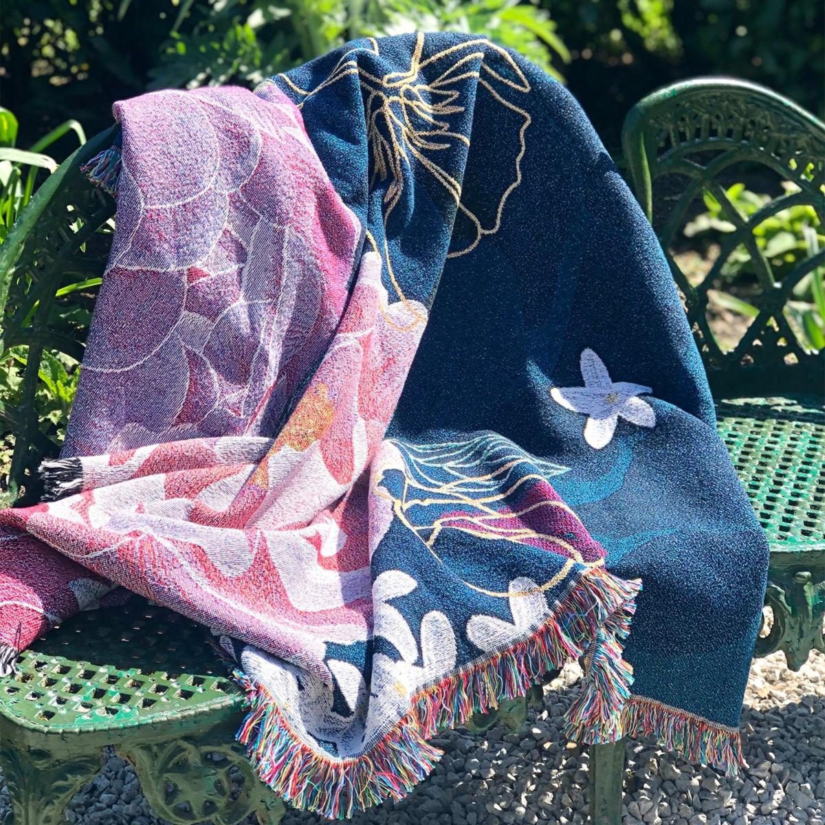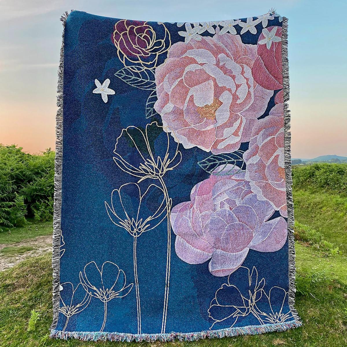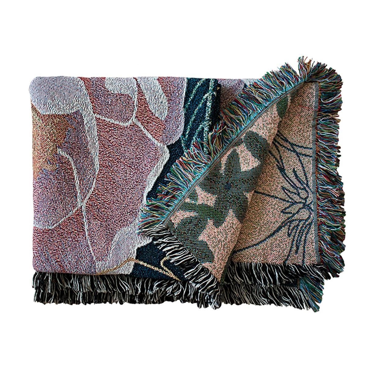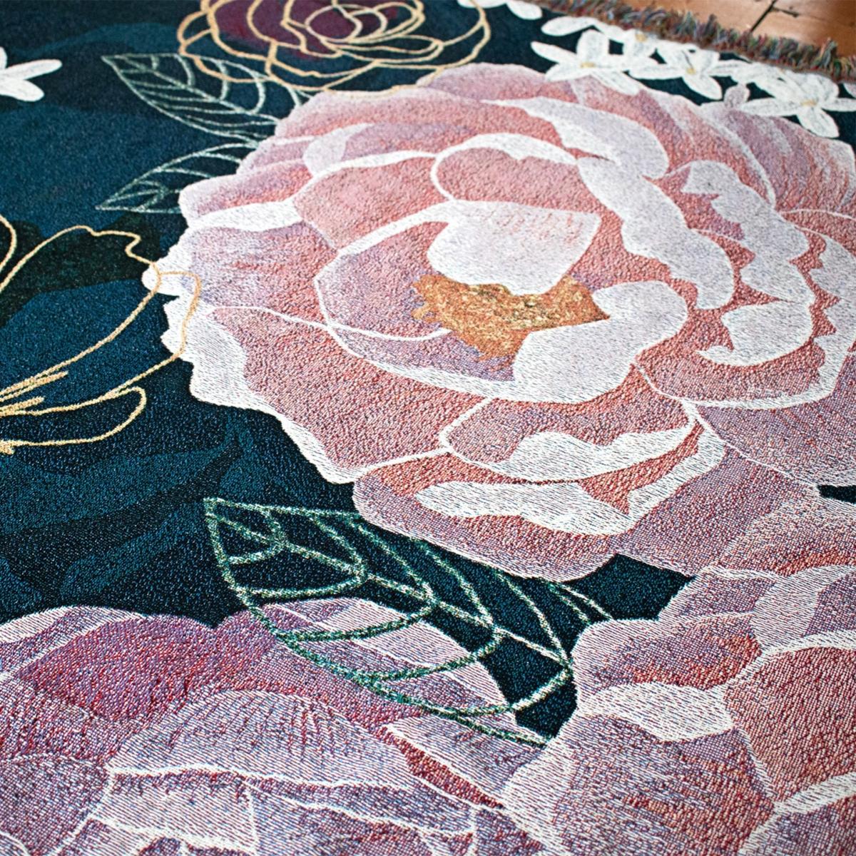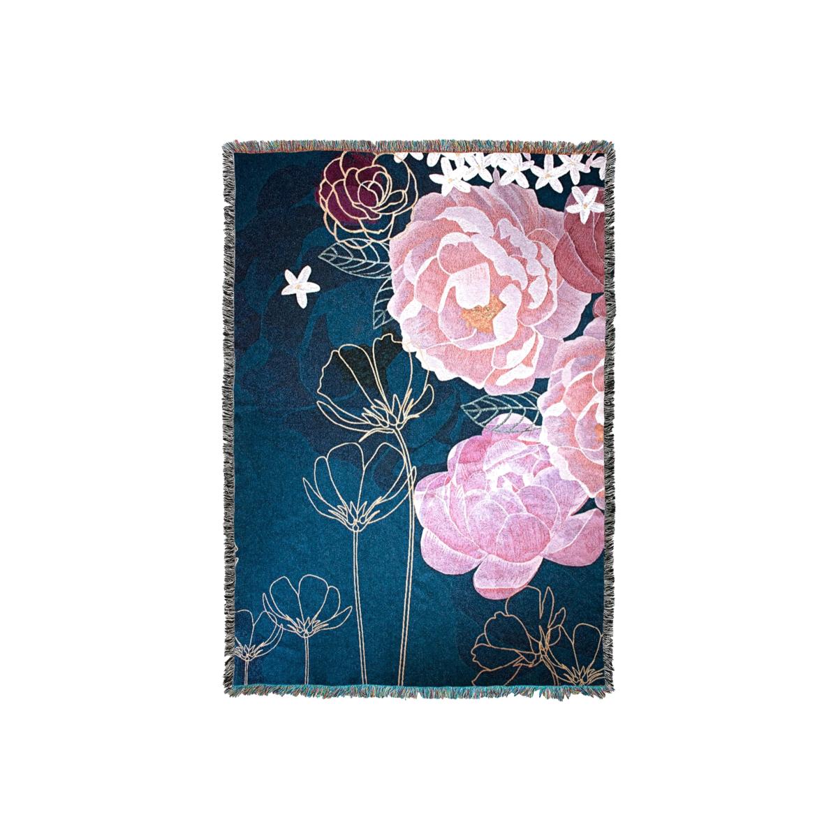 Exquisite peonies and jasmine adorn this throw with the woven design picking up the details beautifully. Exquisite peonies and jasmine adorn this throw with the woven design picking up the details beautifully. Woven in the USA to the highest quality of craftsmanship, this weighty throw blanket can be used as a decorative addition over your sofa, bed, or even as an eye catching wall hanging. Woven with 100% cotton, and finished with the softest fringe edge.