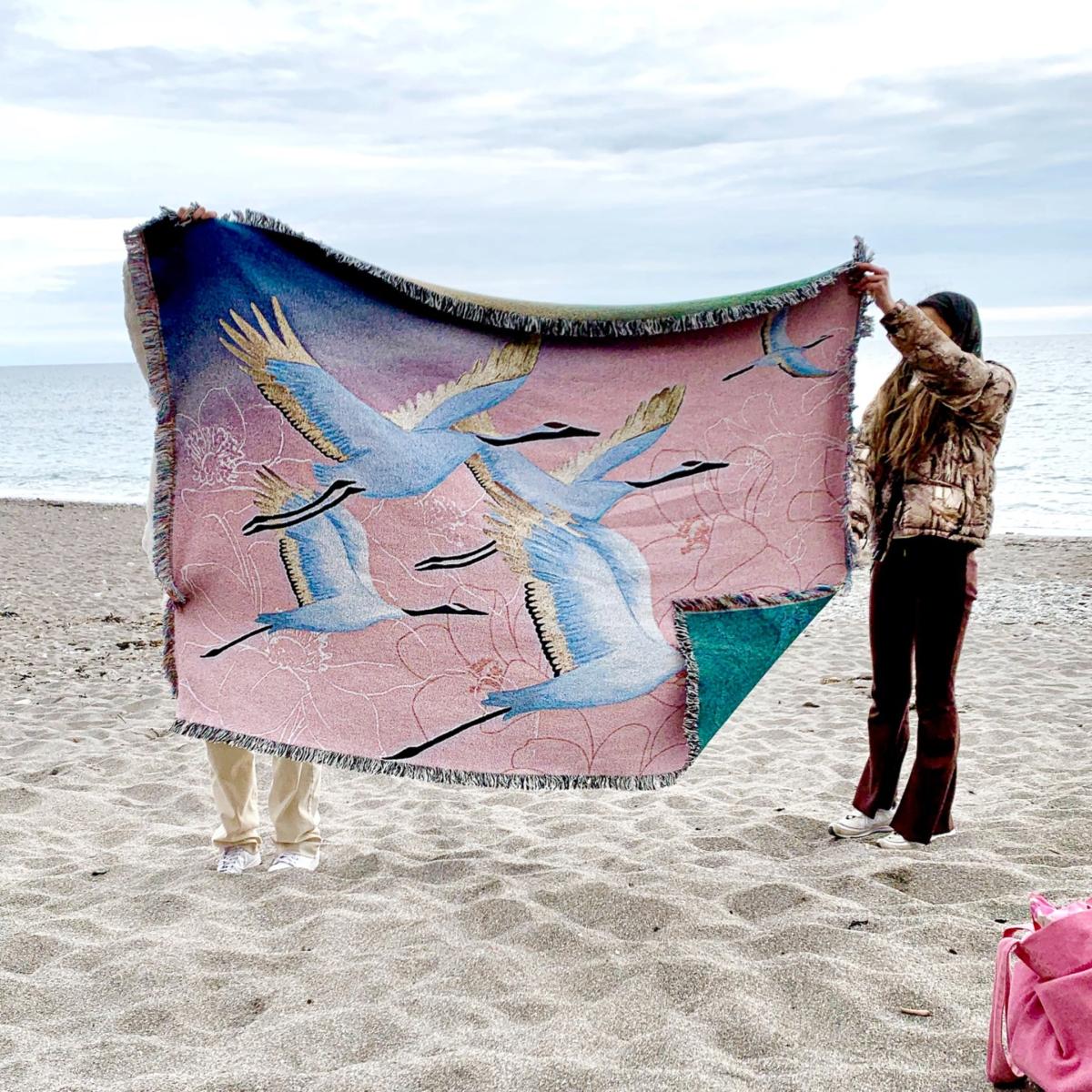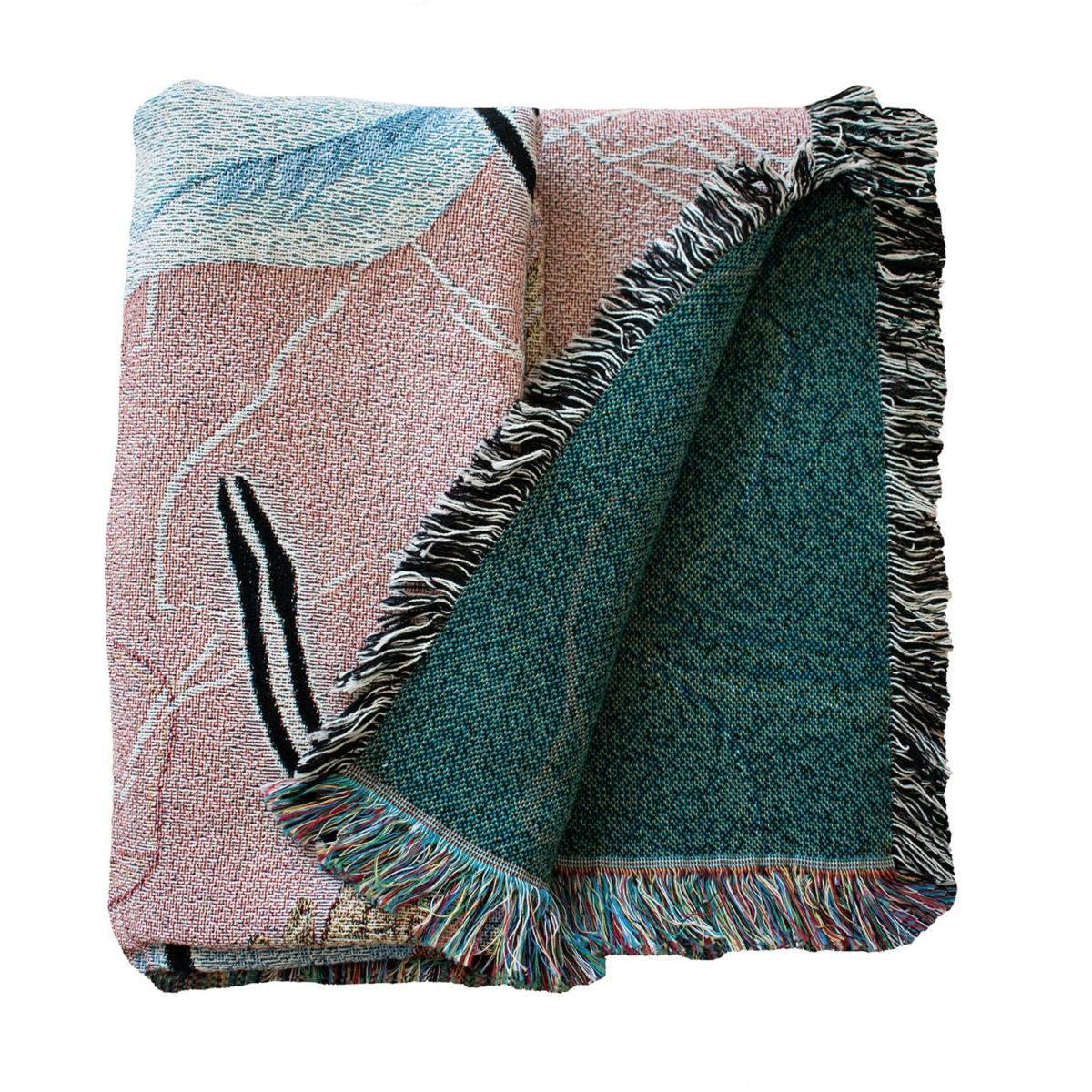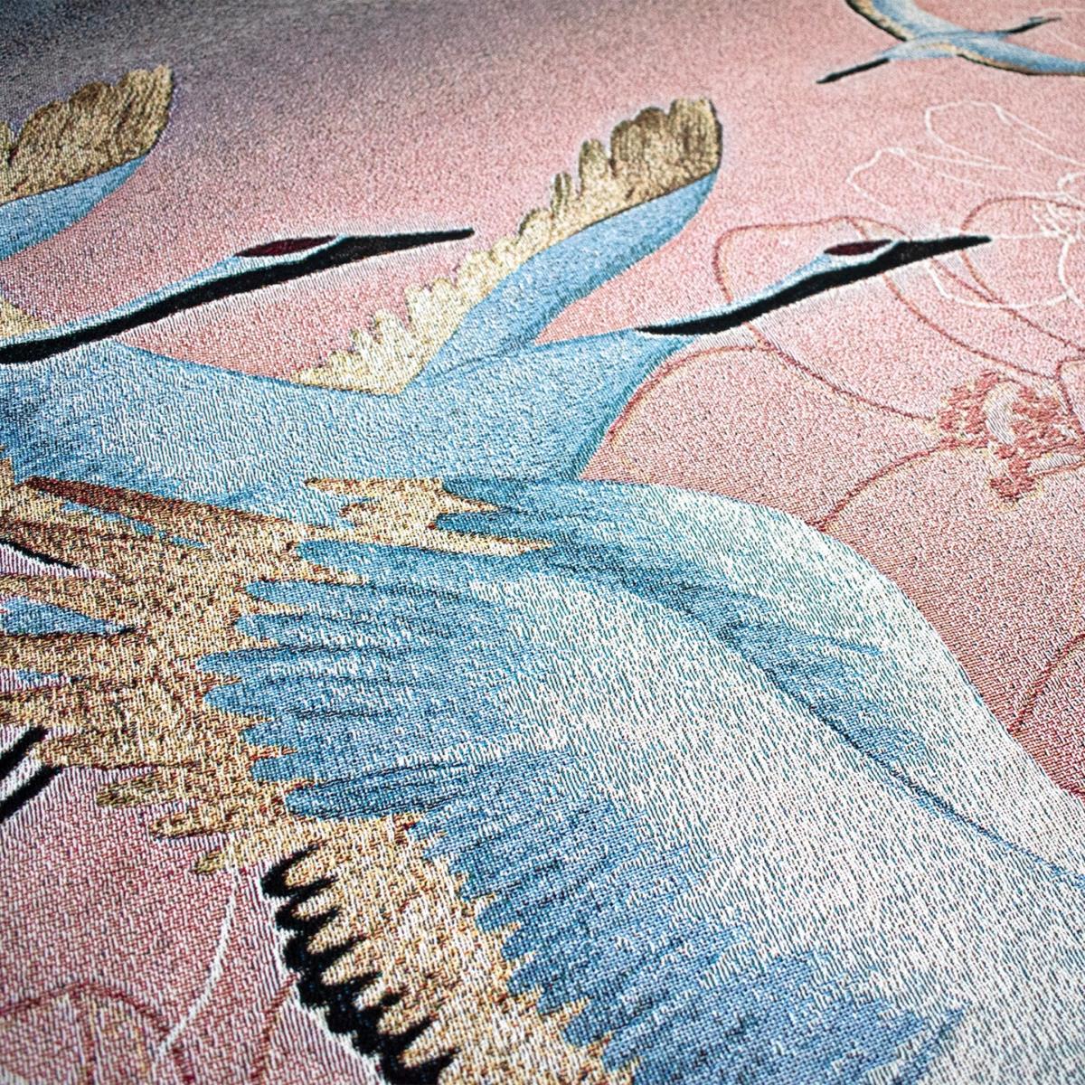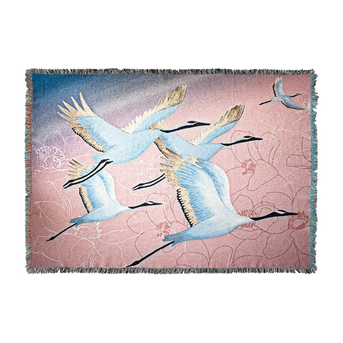 Snuggle up with one of these luxurious and comforting woven throws. A striking design of graceful red crowned cranes flying majestically in an ombre pink and indigo sky. Woven in the USA to the highest quality of craftsmanship, this weighty throw blanket can be used as a decorative addition over your sofa, bed, or even as an eye catching wall hanging. Woven with 100% cotton, and finished with the softest fringe edge.
