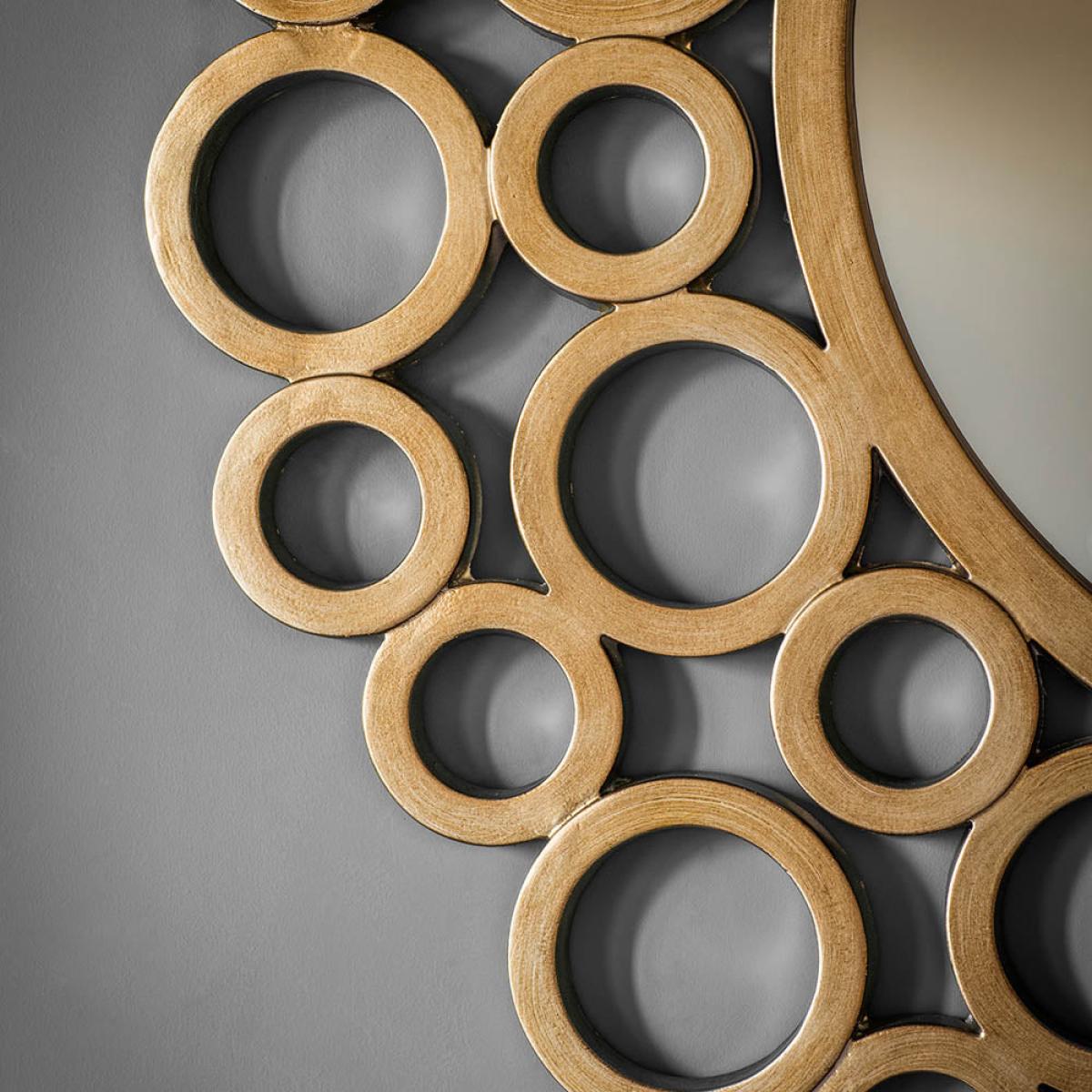 Dynamic feature mirror with a flat ring design in a warm gold leaf finish.