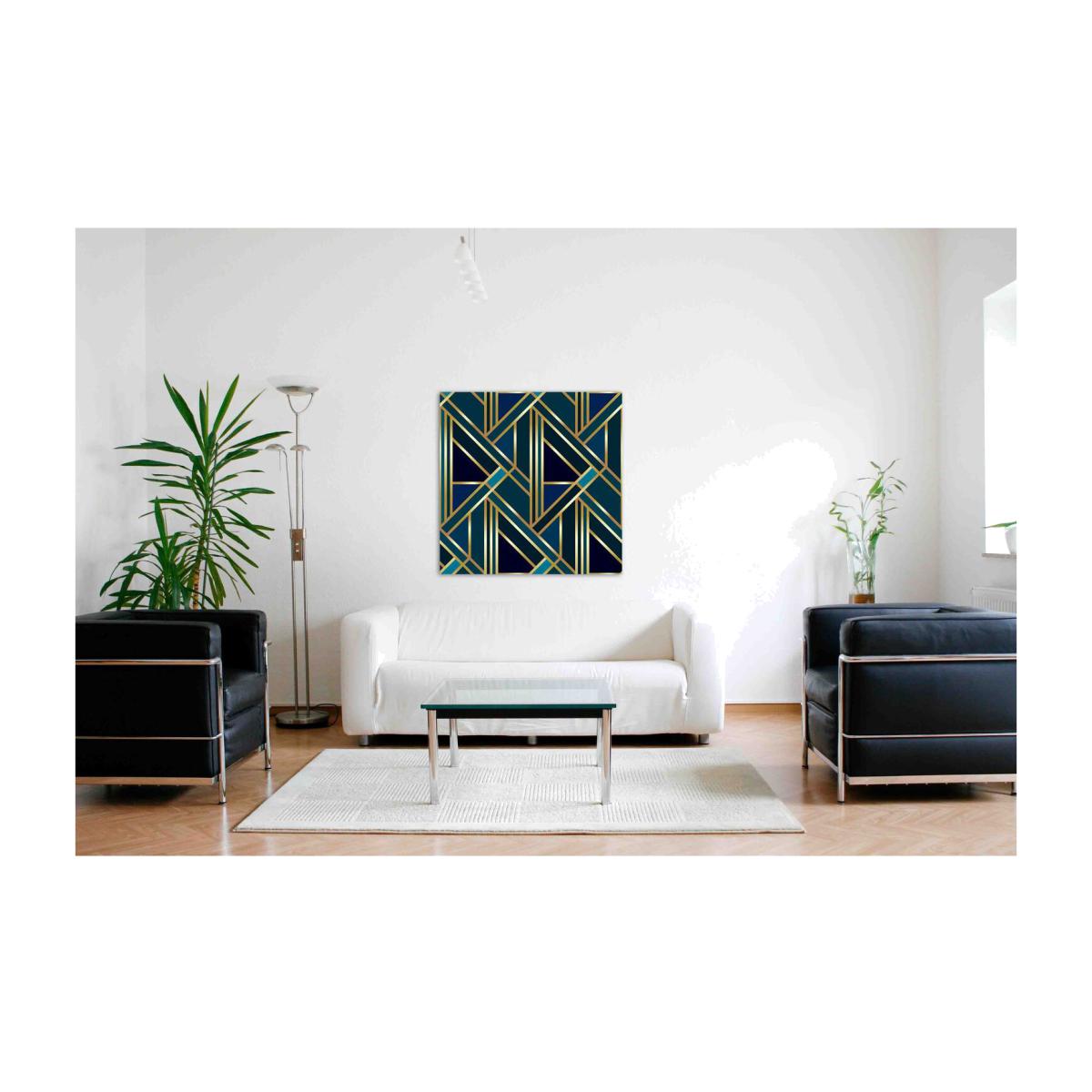 I love this teal canvas because it adds a bold yet sophisticated pop of colour, perfect for modern or eclectic interiors. Its size makes it a real statement piece, ideal above a sofa or main seating area, helping to anchor the room. To style it effectively, consider pairing it with neutral or monochrome accessories, like the black armchairs shown, to allow the artwork to stand out. Mixing textures-such as a plush rug or metallic accents-can also elevate the overall look. Keep surrounding decor minimal to let the canvas shine or coordinate smaller accessories in similar teal tones to create a cohesive palette.