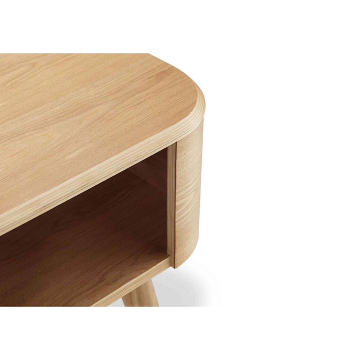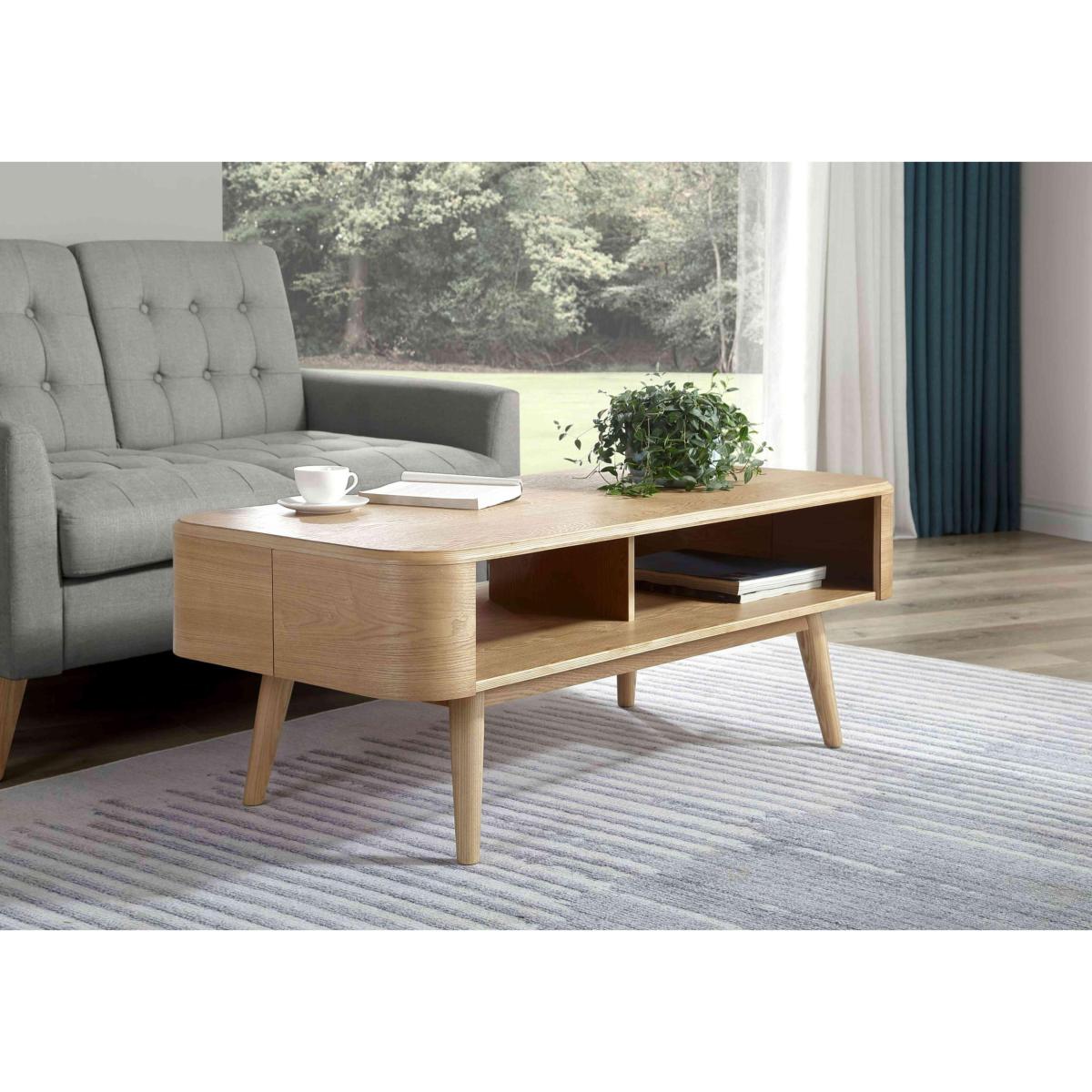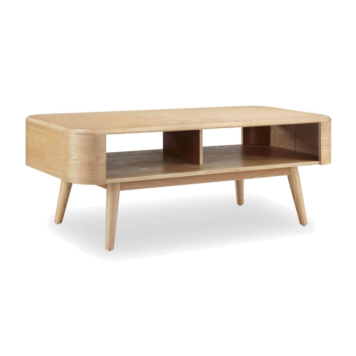 Beautifully fluid design, effortless functionality – it all comes together in our well-crafted Wren living room furniture collection. Showcasing bentwood curves, authentically achieved through the time honoured technique of steaming and then moulding wood veneer, the Wren range includes a TV stand, living room tables and a wall unit. With more than a hint of mid-century style in the pale oak finish and splayed legs, these pieces offer useful extra storage space in the most stylish way possible. The Wren collection is only available online. We love the beautifully curved profile of this authentically crafted bentwood coffee table with storage. With a pale oak veneer finish and splayed legs, it's the best of retro style and modern functionality. Why you'll love it Mid-century modern storage coffee table with lovely bentwood curves. Real oak veneer has a light-toned finish. Authentically crafted – the wood is steamed and then shaped. Large divided storage compartment holds books, board games, magazines and more. A Furniture Village online exclusive. This coffee table is part of the Wren range. What you need to know Delivered to you flat-packed. Assembly required. No two pieces of veneer are the same. You may see variations in colour and woodgrain. Avoid placing in direct sunlight or close to a heat source. Wipe clean with a damp cloth, and dry with a soft duster. Do not use abrasive cleaning products. We recommend using coasters or placemats at all times. The Wren range also includes a TV unit, a side table and a wall shelf.