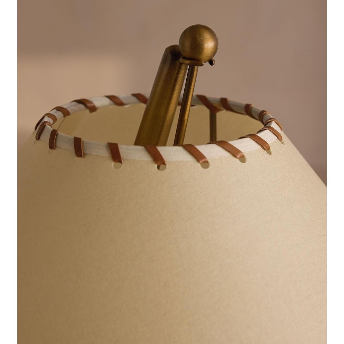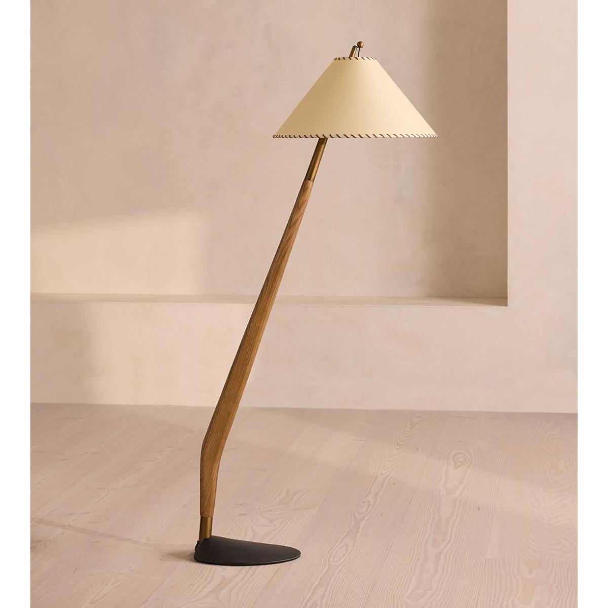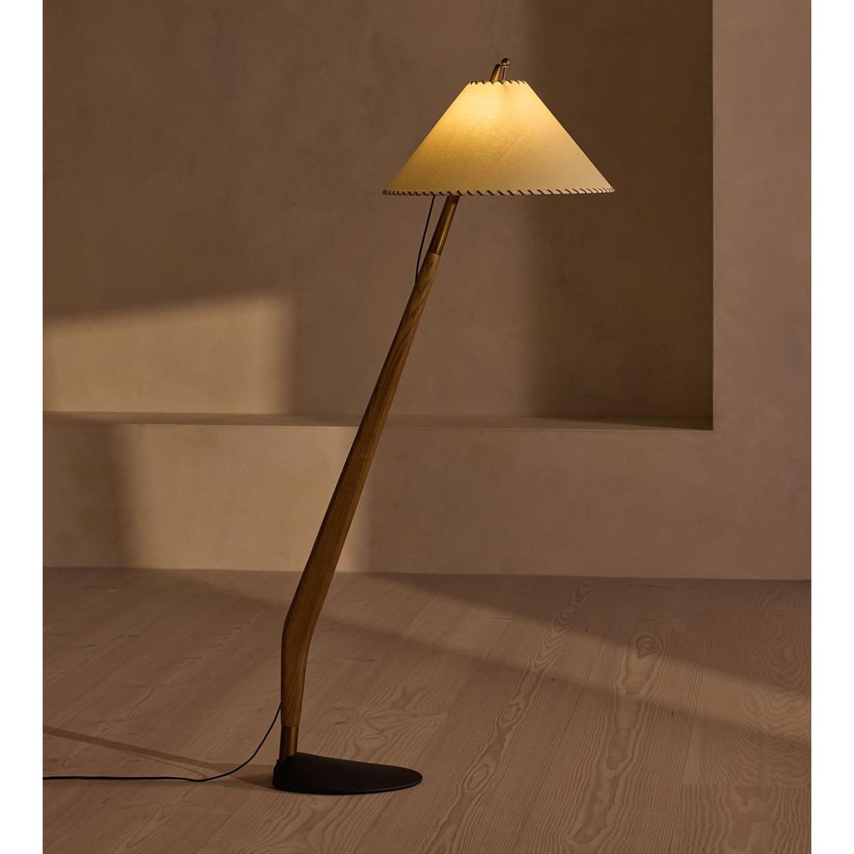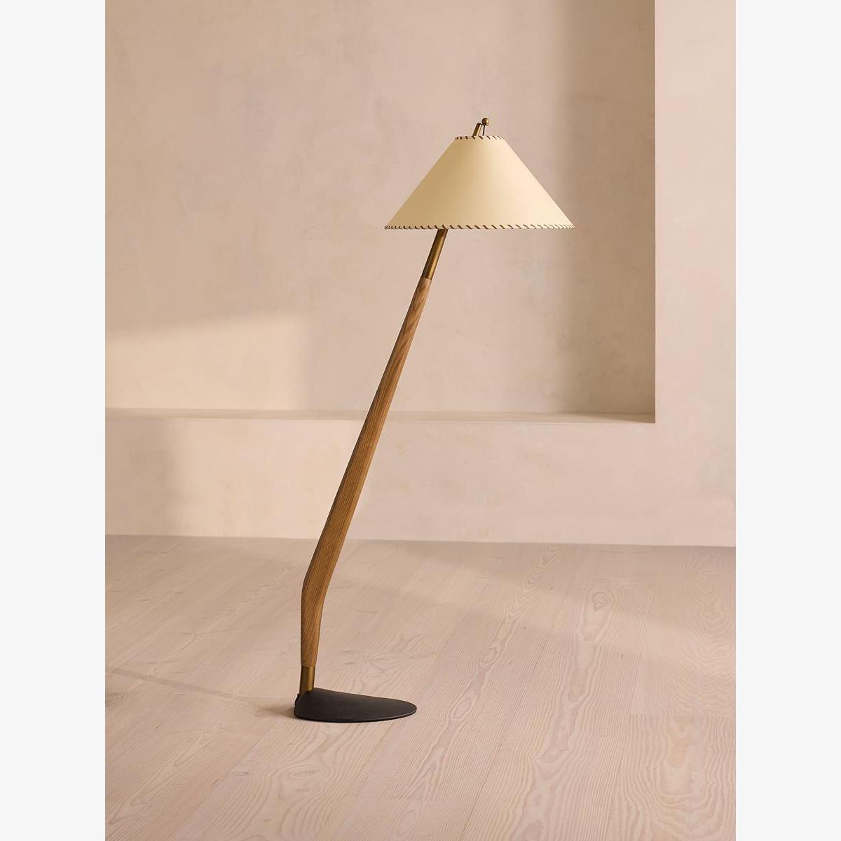 An angled, tapered parchment shade detailing with a leather lace trim complements a slanted oak base. Stabilised by a circular cast iron base, the angular stem of our Wren floor lamp is carved from solid oak. At the top, a tapered shade is crafted from light-coloured parchment to let a soft, warm light shine through, and is finished with a contrasting leather lace trim.