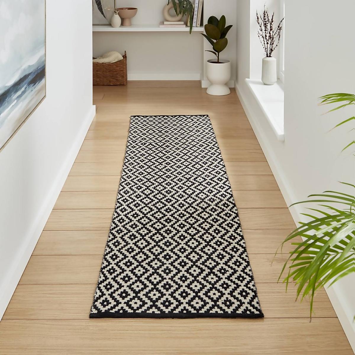 Introducing the Wren Monochrome Cotton Runner, a captivating addition to any hallway or walkway. This runner features a flat weave pile in a geometric design, that add warmth and texture to any space. Hand crafted from 100% cotton, this modern monochromatic design is sure to complement any decor style, adding a touch of elegance and sophistication to your space.