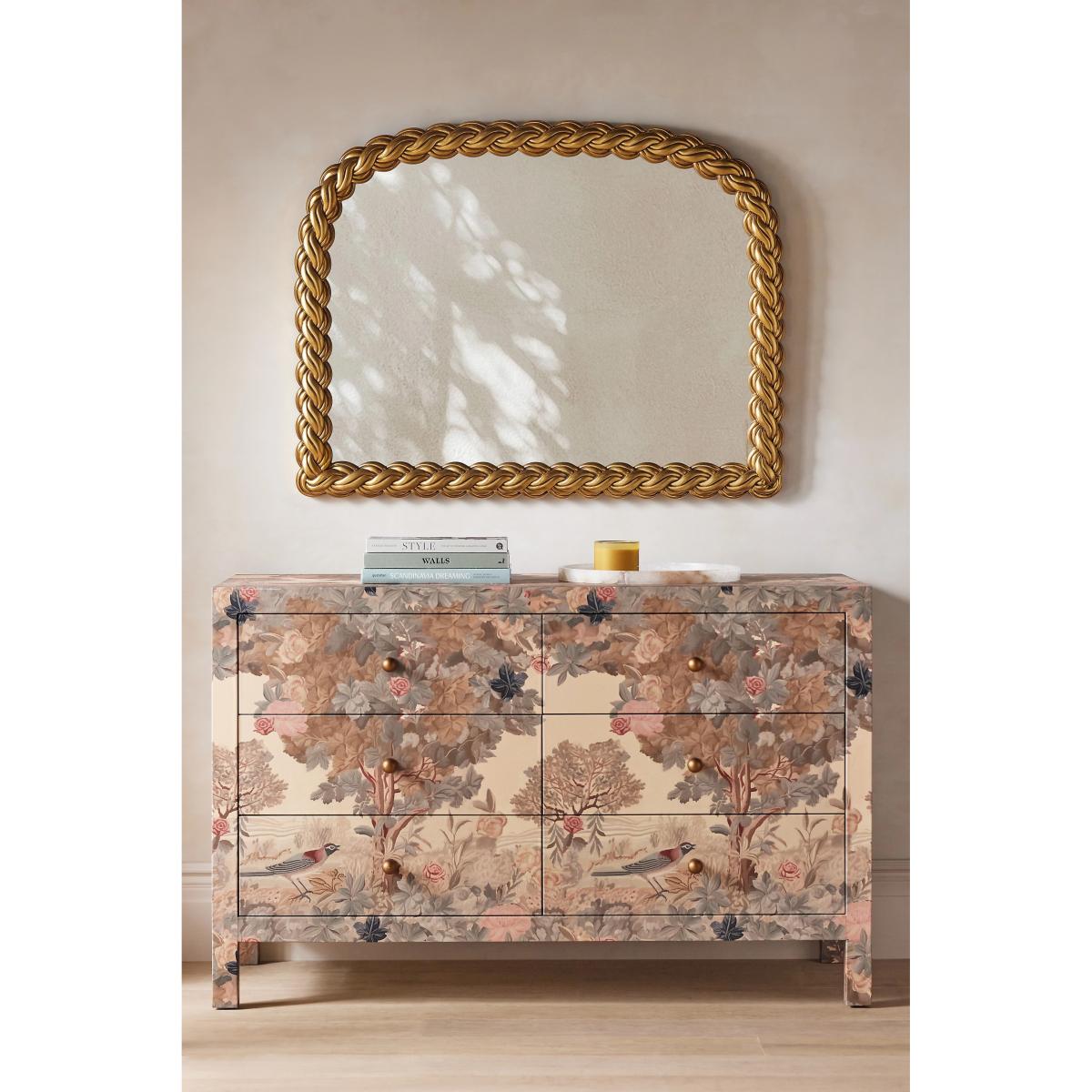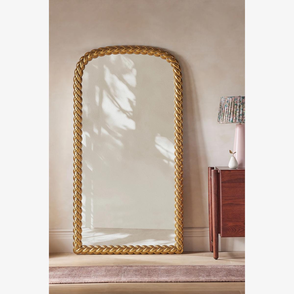 A braided chain forms the gilded arch silhouette of the Wren Mirror, bringing an elevated and artful statement to any space. * Polyurethane frame reinforced with engineered hardwood back, mirrored glass * Due to the handcrafted nature of this piece, minor variations in the reflection can occur along the edges of the glass * Floor Mirror:This style is intended to lean against a wall; do not hang; fitted with D-ring for anti-tip support * Mantel Mirror: Fitted with a ready-to-hang D-ring; hanging hardware included * Wipe clean with dry, soft cloth * Imported
