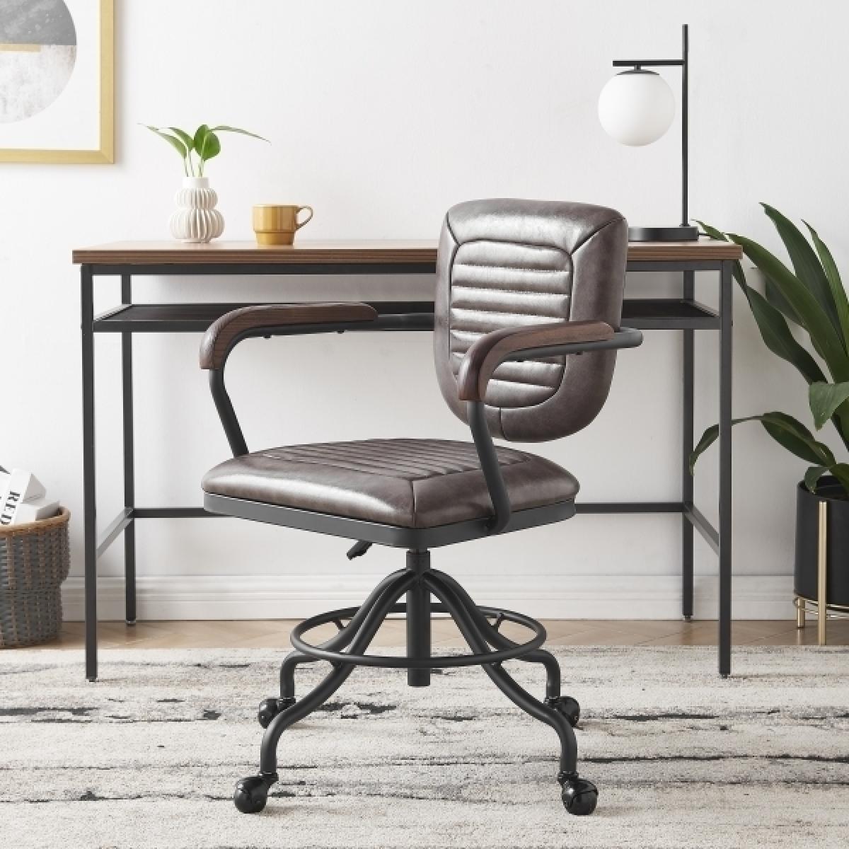 Give your home office an upgrade with the Wren office chair. With its industrial look and intricate metalwork, the Wren is a classic addition to home studies. Take notice of the ribbed backrest, padded vintage black faux leather seat, and curved armrests with wooden accents on the arms. The Wren features height-adjustable swivel base on castor wheels.