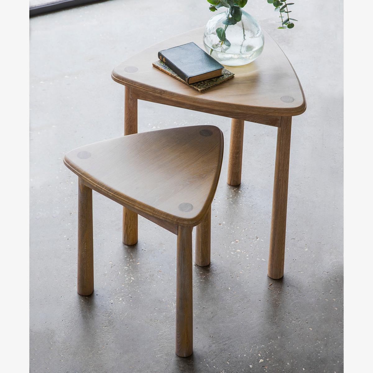 I love these small tables because of their simple, clean lines and natural oak finish, which makes them incredibly versatile. They work well in both contemporary and Scandi-inspired interiors, adding warmth and texture without overwhelming the space. Practical styling tips include using the smaller table as an occasional side table or plant stand, while the larger one can double up as a bedside or coffee table. Their nesting design means you can easily slide the pieces apart when needed or keep them tucked together for a streamlined look, making them both functional and visually appealing.