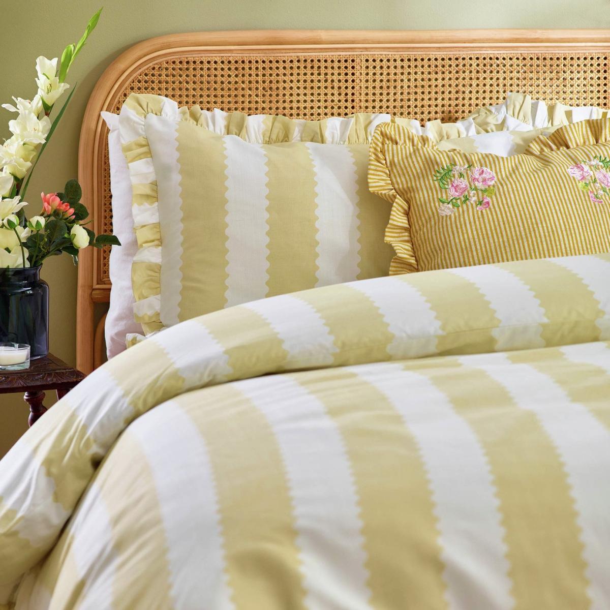 Bring a touch of elegance to your bedroom with the Birdie Stripe Duvet Cover Set. Crafted from cotton-rich fabric with a 180 thread count, this duvet cover set offers a blend of comfort and style. The delicate ruffle trim nods to British heritage, while adding a subtle hint of cottage core charm. Designed for those who appreciate classic prints and patterns, this timeless bedding will become the centrepiece of your room, creating a serene retreat inspired by the natural world. Fabric finish: printed. 60% cotton, 40% polyester. 180 thread count. Set includes 1 duvet cover and 2 pillowcases. Bed size: king size. Length 220cm, Width 230cm. Reversible. Buttons for fastening. Pillowcase length 75cm, Width 50cm. Reversible pillowcase (s). Machine washable. Suitable for tumble drying.