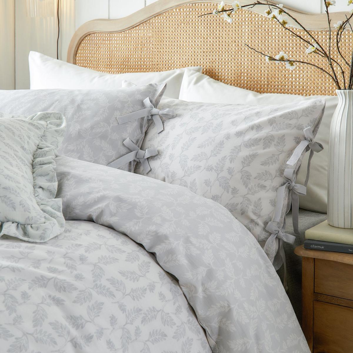 Transform your bedroom into a serene haven with the Chloe Duvet Cover Set, thoughtfully designed for those who cherish delicate patterns. Made from 100% tumbled cotton with a luxurious 144 thread count, it offers unmatched softness and comfort. The reversible design, featuring a serene tonal leaf print on both sides, allows for effortless style refreshes, perfectly blending elegance and versatility. Charming bow closures on the duvet and pillowcases add a touch of character, combining country charm with a modern aesthetic. Tie Fastening. Fabric finish: printed. 100% cotton. 144 thread count. Set includes 1 duvet cover and 1 pillowcase. Bed size: single. Length 200cm, Width 135cm. Normal confection edging detail. Reversible. Ties for fastening. Pillowcase length 75cm, Width 50cm. Reversible pillowcase (s). Machine washable. Suitable for tumble drying.