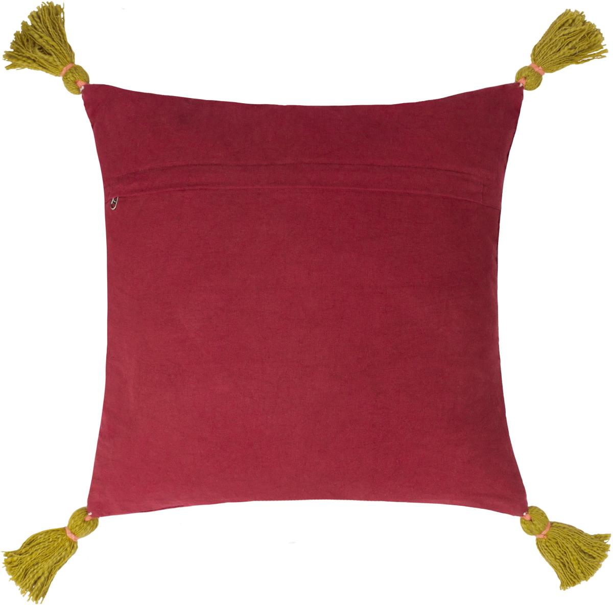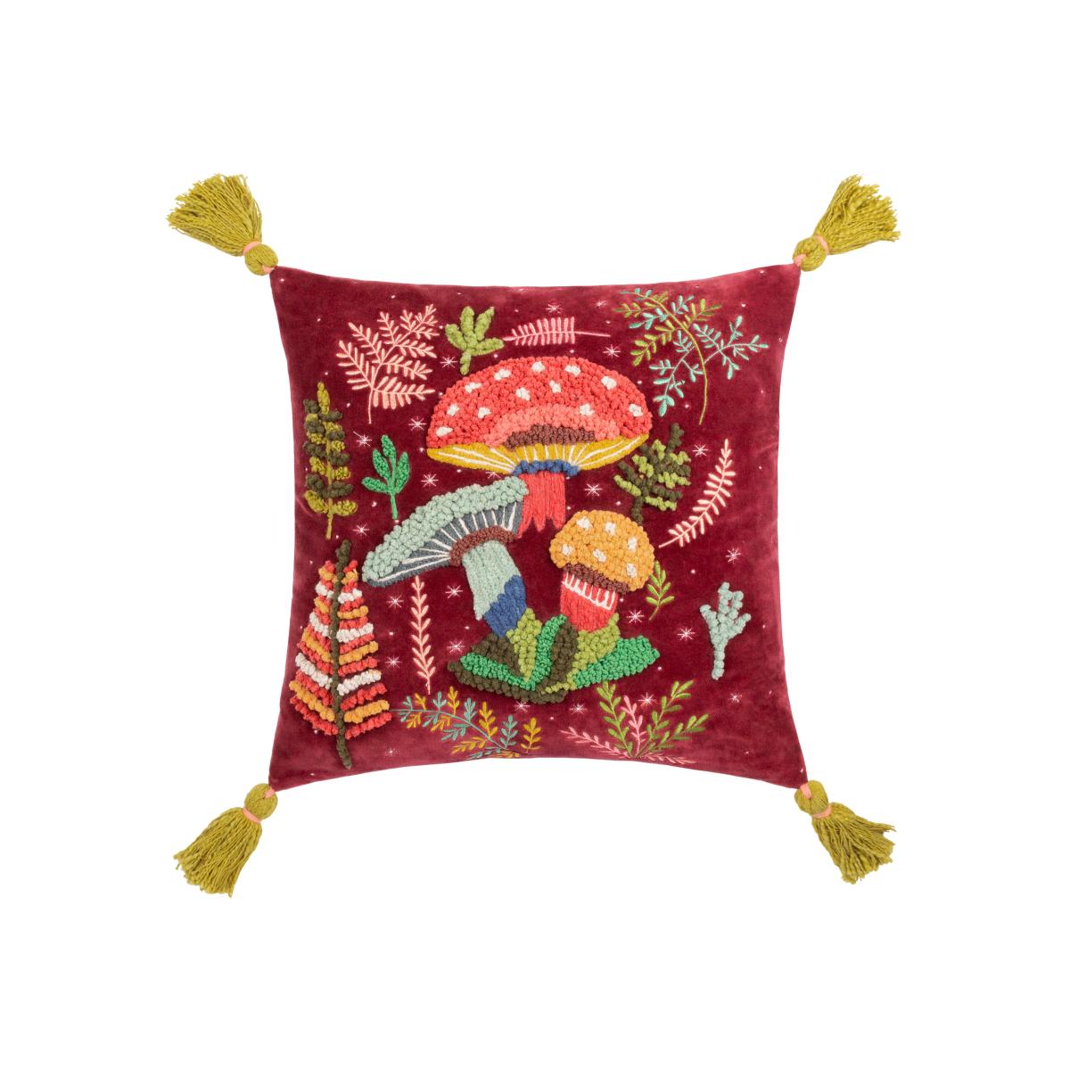 * Embroidered design * Made from 100% cotton * Includes tassels * Sponge clean only Transform your space with the whimsical charm of the Wylder Magic Mushrooms Square Cotton Cushion Cover. Intricately embroidered mushrooms, fungi, and leaves adorn a soft red velvet fabric, while a plain cotton reverse and tasselled trim complete the design.
