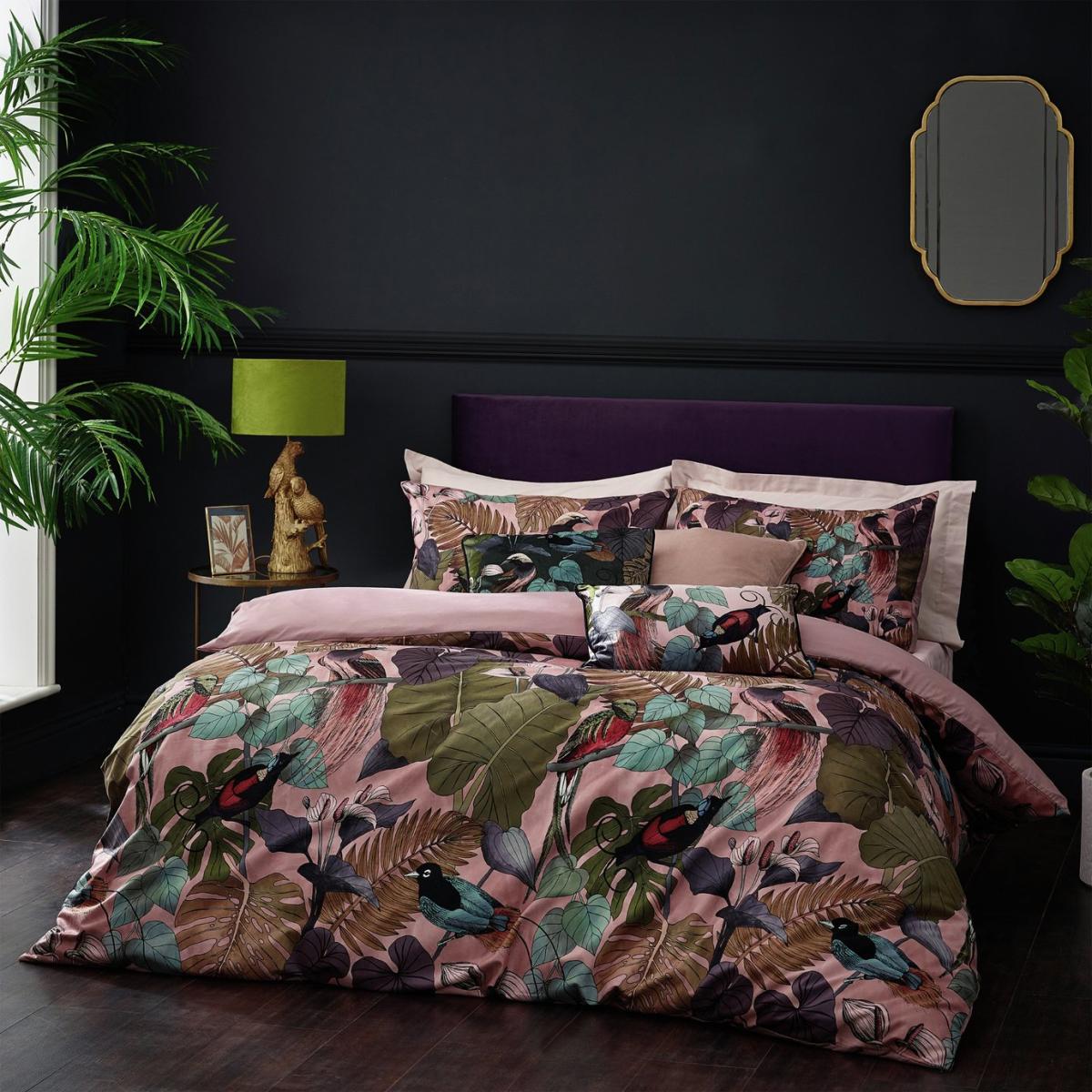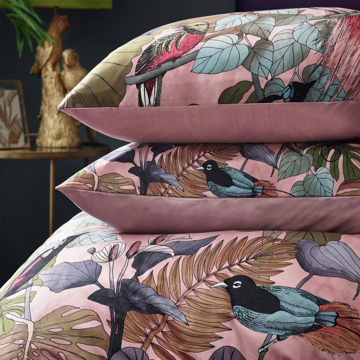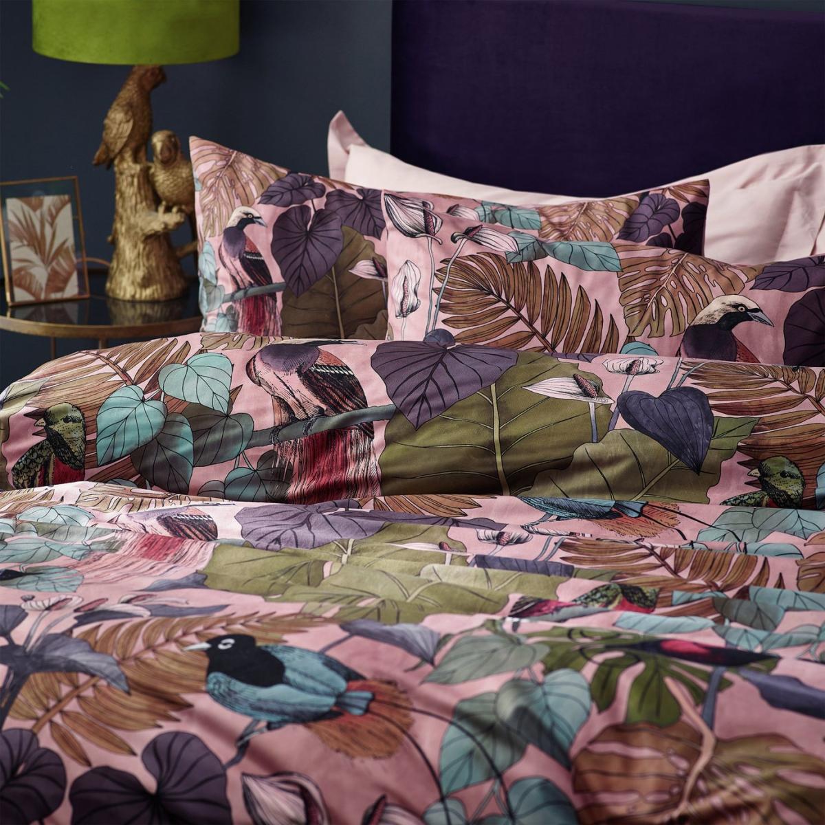 This beautifully designed printed velvet duvet set adds a touch of the tropics to your bedroom. Featuring hand painted, printed exotic birds, perched on lush tropical plants, against a vivid blush background; this duvet will bring life to your home as soon as it is placed on the bed. The reverse is a rich plain mauve colour, which helps to make this duvet set a fantastic addition to your bedding collection. Featuring a flock of printed exotic birds of paradise perched on thick undergrowth, set on a vivid blush pink background. Complete with a richly coloured plain reverse and a clear button fastening. Finish: velvet. 100% polyester. Set includes 1 duvet cover and 2 pillowcases. Bed size: king size. Length 220cm, Width 230cm. Jacquard panel. Buttons for fastening. Standard pillowcase (s). Pillow case length 75cm, Width 50cm. Machine washable.