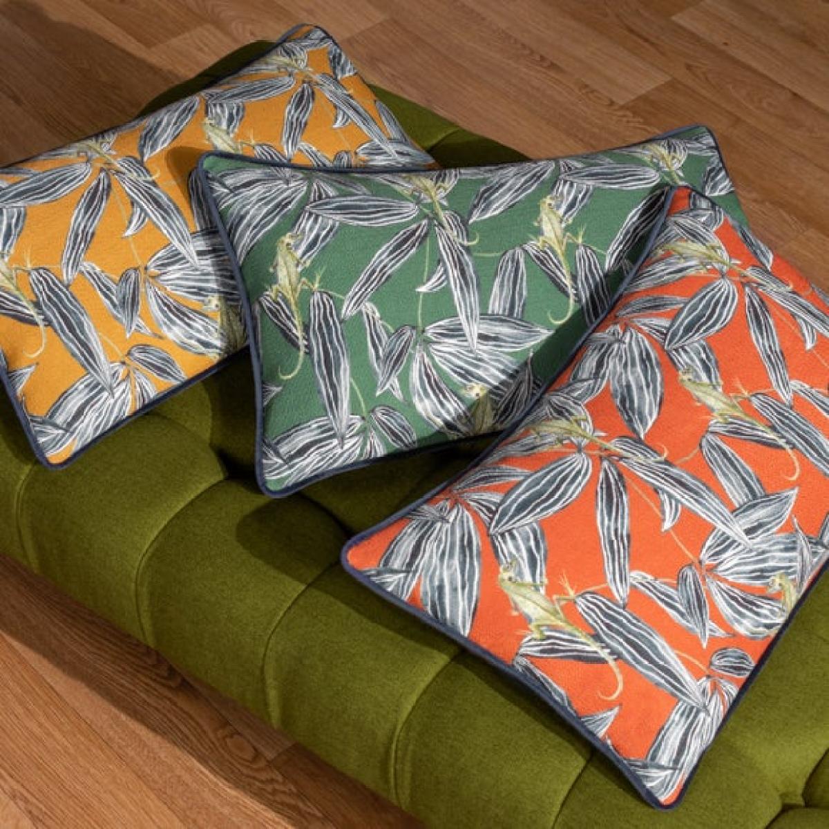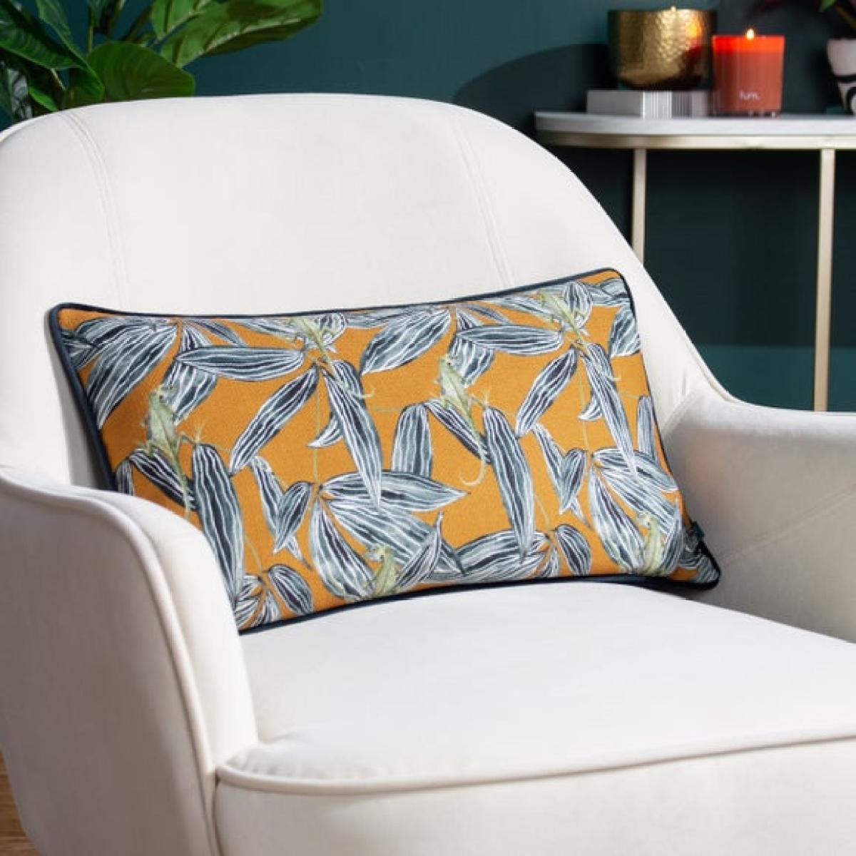 * Stylish, Exotic Design * Contrast Piping * Discreet & Secure Zip Fastening * Plump Polyester Fibre Filling Bring the wild indoors with the Wylder Nature Ebon Wilds Nkiru Rectangle Cushion. Featuring hand-painted exotic lizards climbing through monochrome jungle leaves on a bold backdrop, it’s finished with a soft velvet reverse, contrasting piping, and a discreet zip.