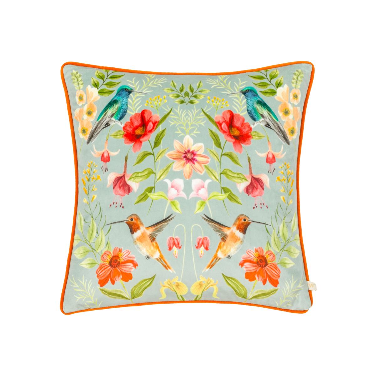 * Mirrored design of birds and botanics. * Velvet reverse, piped edge, hidden zip. * 100% polyester fabric. * Designed, printed, and made in the UK.* Zip Fastening* Polyester fibre filling The Wylder Nectar Garden Blossom Square Cushion features a mirrored design of whimsical birds and modern botanics. Complete with a contrasting plain velvet reverse and piped edge, this 100% polyester cushion offers both softness and durability.