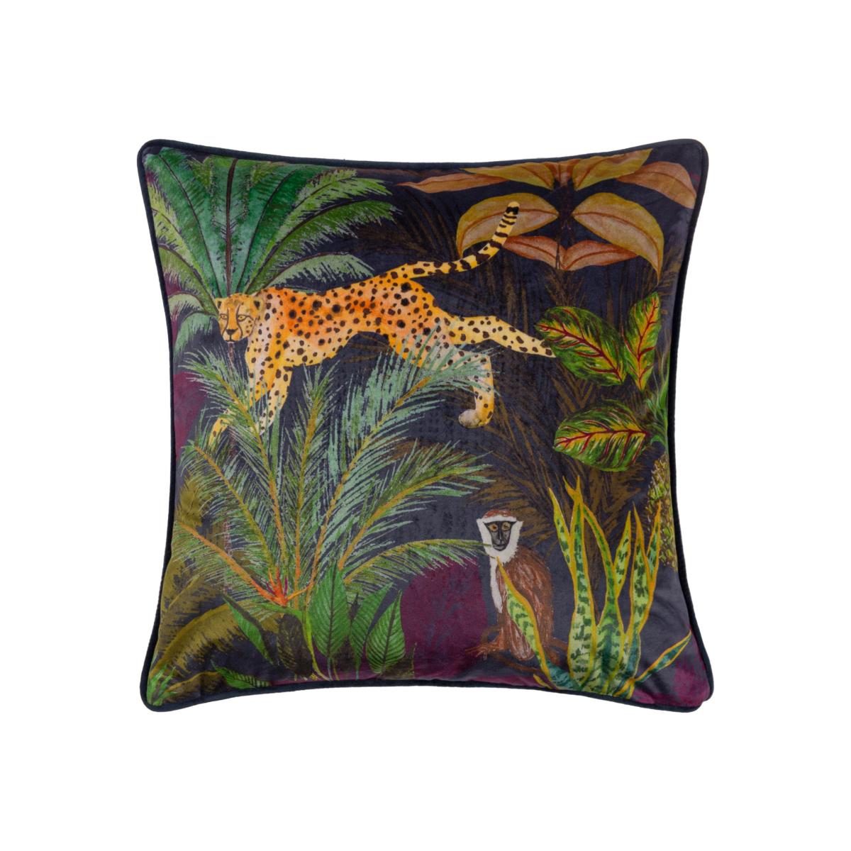 * Featuring a hand-painted jungle design* Made from 100% Polyester* Soft velvet reverse Immerse yourself in the wild beauty of nature with the Wylder Tropics Aranya Cheetah Square Cushion. Hand-painted and featuring a bounding cheetah and a perched monkey amidst lush jungle foliage in rich jewel tones, this cushion adds a touch of the exotic to your decor. Crafted from 100% Polyester fabric and featuring a plain velvet reverse, piped trim, and zip fastening, it's not only super soft but also remarkably durable.