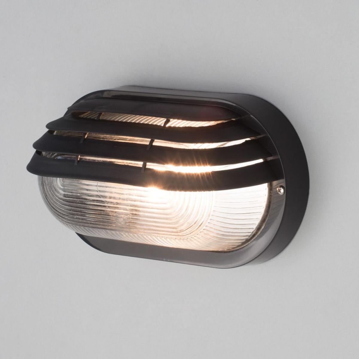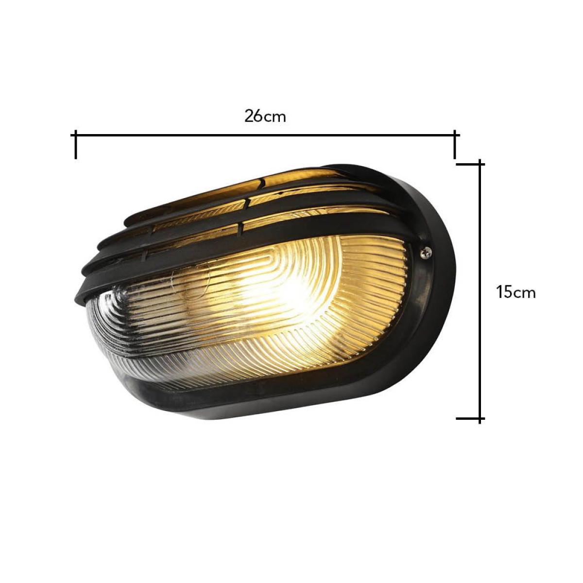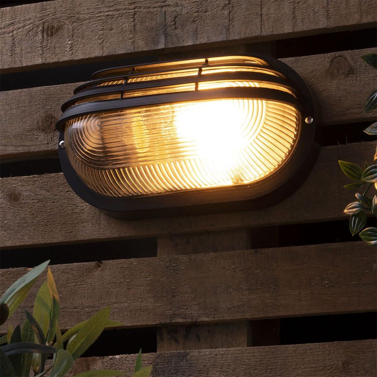 Add an industrial look to your outdoor lighting arrangements with the Wyre Oval Outdoor Bulkhead Eyelid Wall light. This light features a durable black finish and a slatted eyelid type design that gives a robust feel to the light that looks incredibly stylish. Ideal for coastal areas, this light is also corrosion resistant and protected against most outdoor weather conditions.