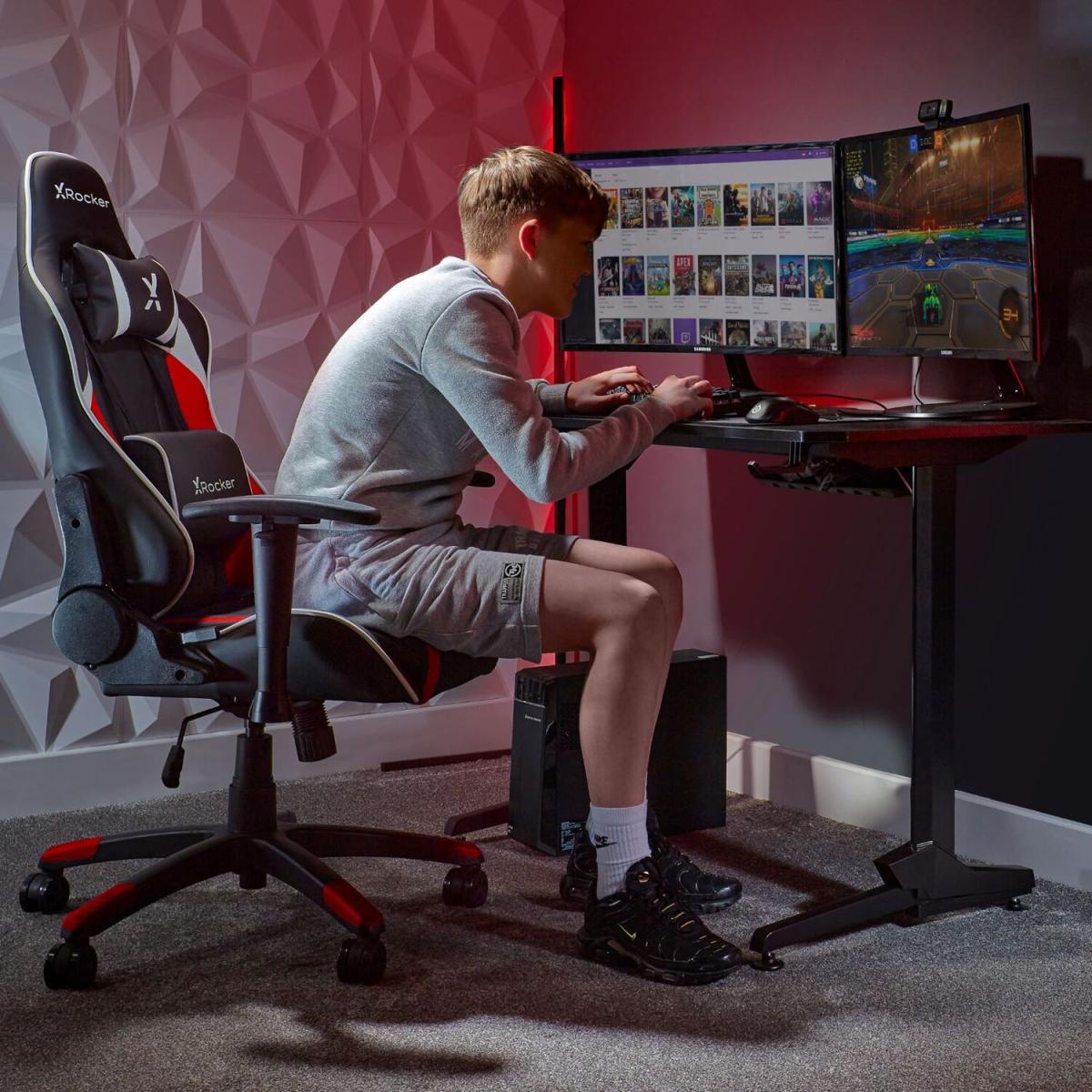 The X Rocker Agility Junior is a fully adjustable tournament gaming chair, sized and designed for Junior gaming enthusiasts and growing streamers. The Agility Junior Features all of the benefits of a full-sized Tournament gaming chair, with fully adjustable armrests, backrest tilt and neck/lumbar support for staying comfortable during many hours of study or play.