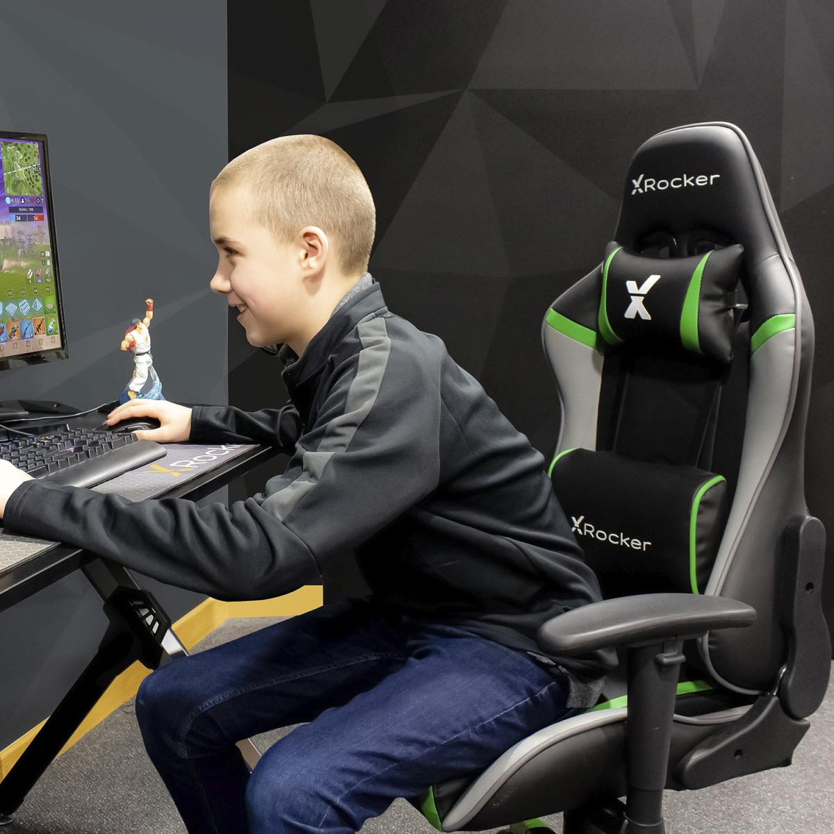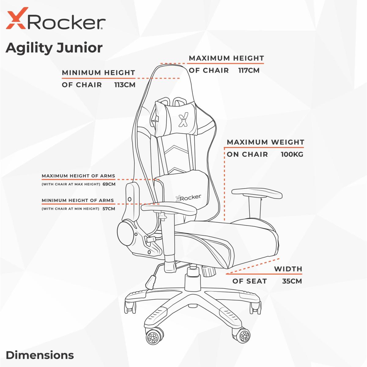 The X Rocker Agility Junior is a fully adjustable tournament gaming chair, sized and designed for Junior gaming enthusiasts and growing streamers. The Agility Junior Features all of the benefits of a full-sized Tournament gaming chair, with fully adjustable armrests, backrest tilt and neck/lumbar support for staying comfortable during many hours of study or play.
