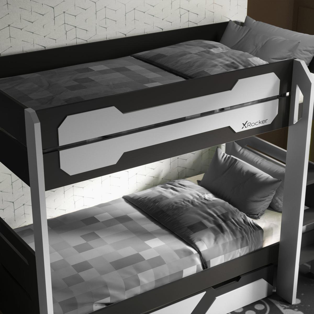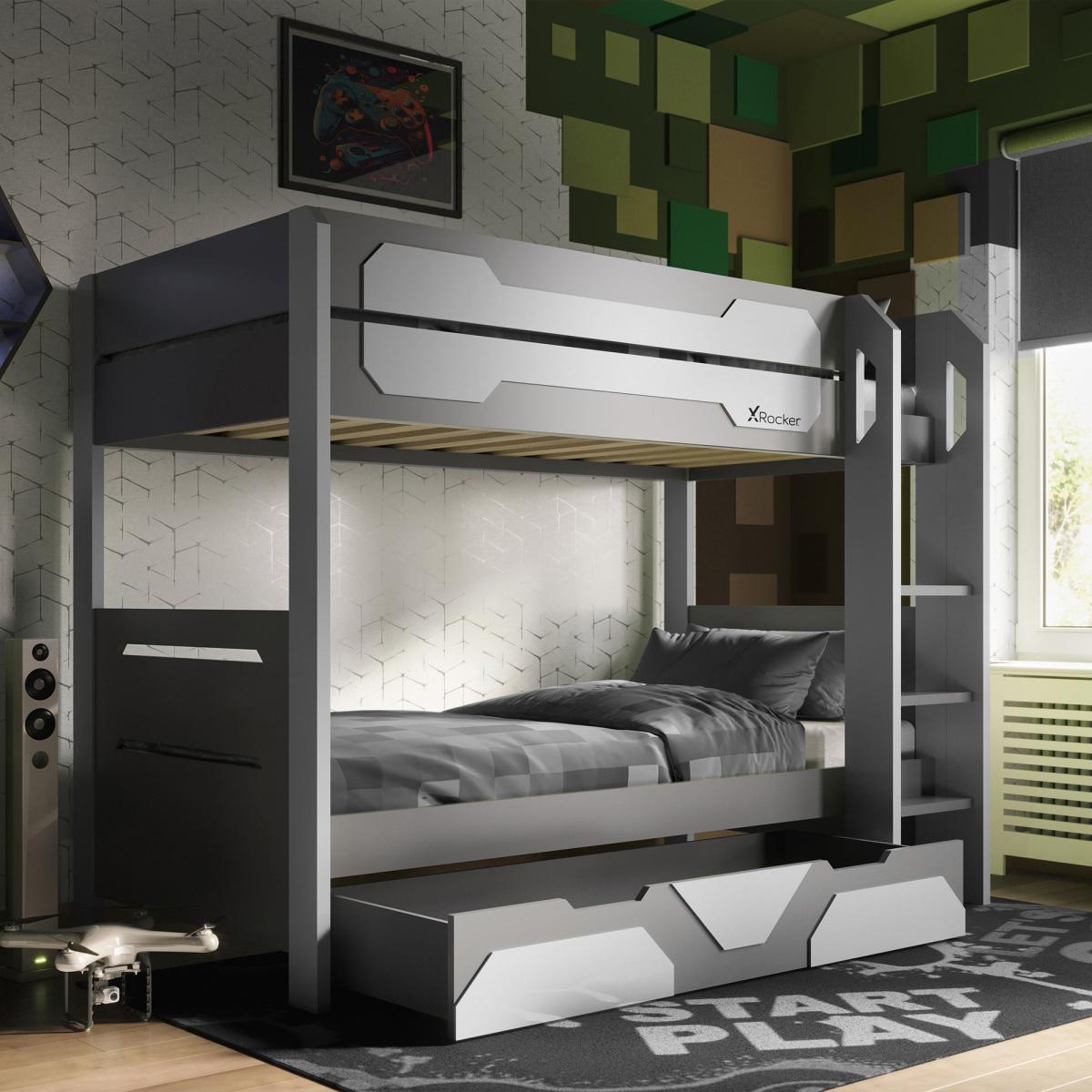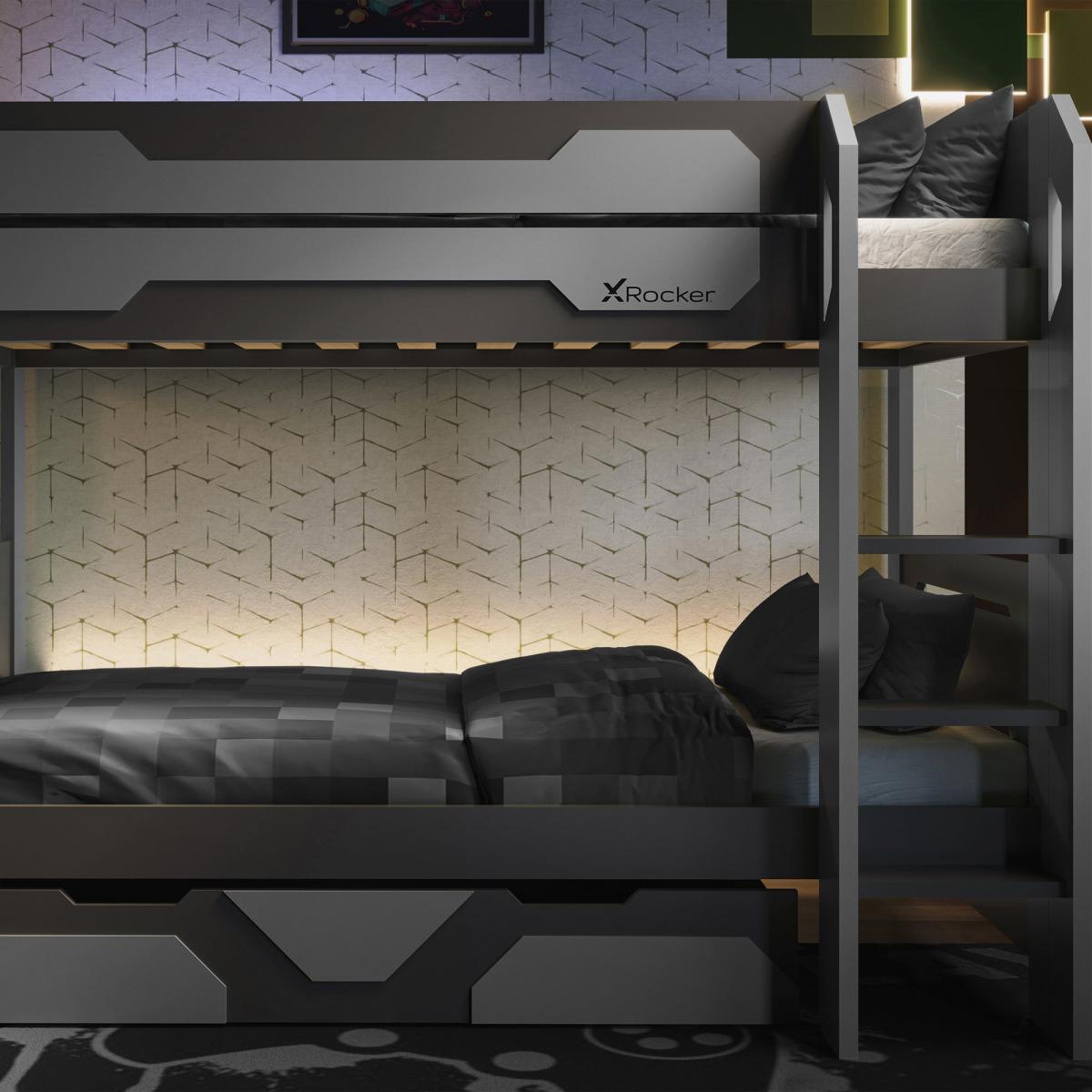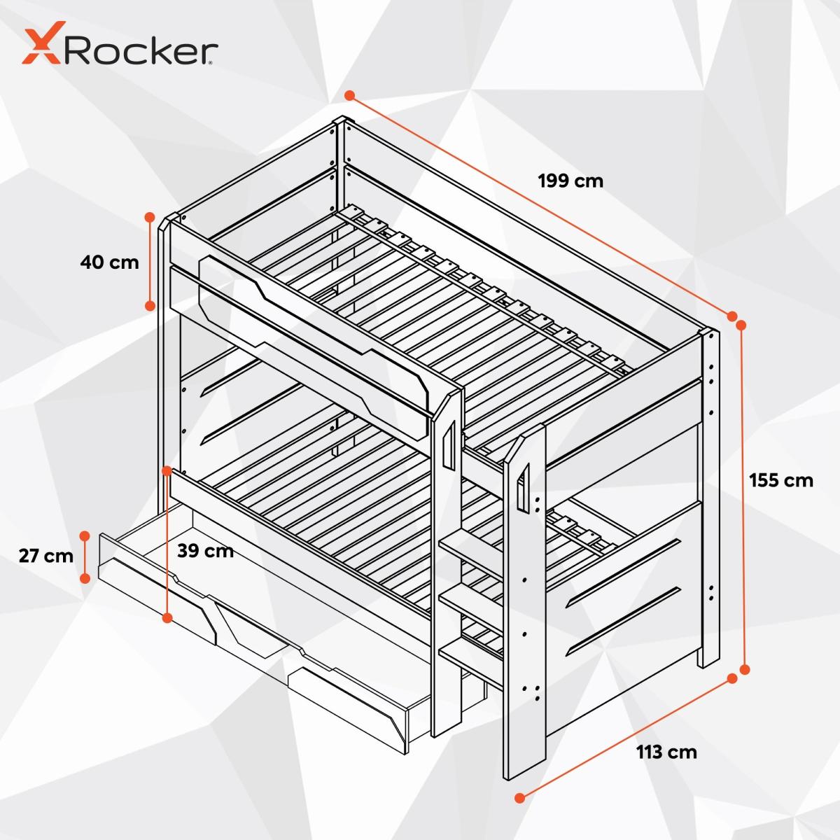 * Wooden bed frame* Trundle drawers* Fixed ladder The X Rocker Battalion Gaming Bunk Bed is perfect for sleepovers, making it an ideal choice for gaming siblings or themed gatherings. It features high-capacity storage trundle drawers, cleverly designed to maximise space within its compact structure. Inspired by e Sports aesthetics, this bunk bed boasts solid color paneling that creates a futuristic, gaming-like look. Additionally, the right-handed ladder is securely fixed to one side, ensuring safe access to the top bunk while maintaining a sleek design.