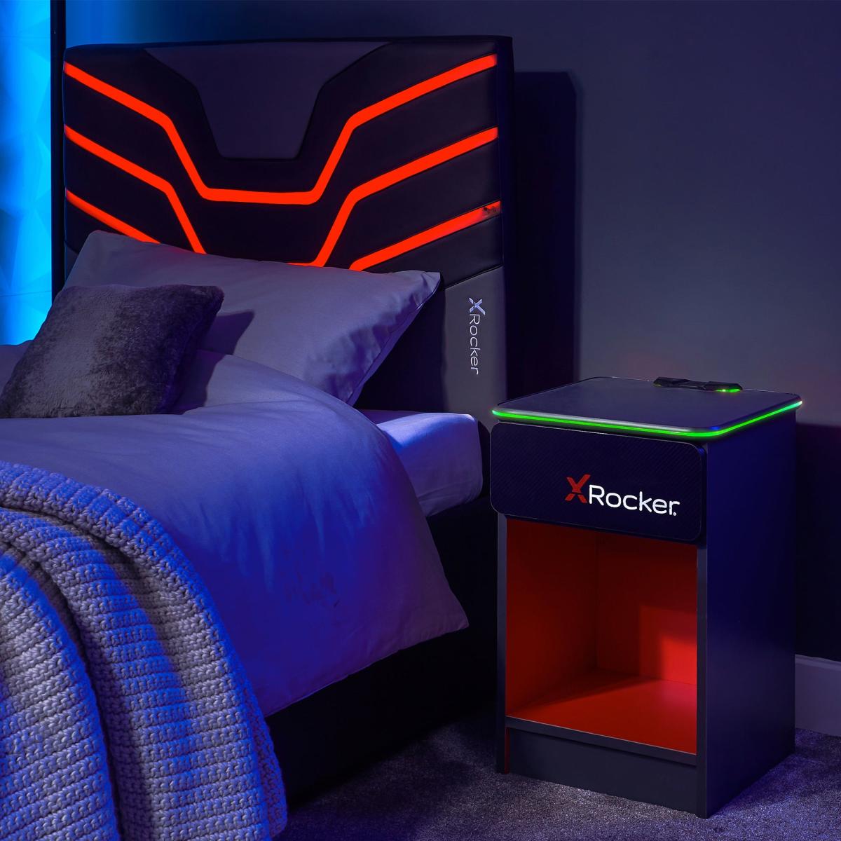 * Bedside table* Illuminated Neo Fibre LED technology* Wireless charging pad* Storage compartments: drawer unit and large open space* Futuristic carbon fibre finish* 1 year guarantee included Bring a glow to your bedroom with X Rocker’s innovative Neo Fibre LED lighting technology in this futuristic style bedside table. Built for style and practicality, this side table is designed with a carbon fibre finish to create a smooth surface, enhanced with high tech functionalities and versatile storage, perfect for displaying collectables or night-time reading in the open space and personal bits and bobs in the neat drawer. Equipped with wireless charging technology, you’ll never have to worry about your battery being on low as the built-in charge pad delivers up to 15W of charge power once activated (USB power supply not included, use in conjunction with the manufacturer's phone charger for best results). To boost the ultra-cool looks in your space, the innovative LED lighting provides a unique and colourful glow to your bedroom set up with multi-colour options to choose from. Powered by a built-in control panel that connects via USB Type-A cable to your power supply (wall adapter or power bank and remote control not included)