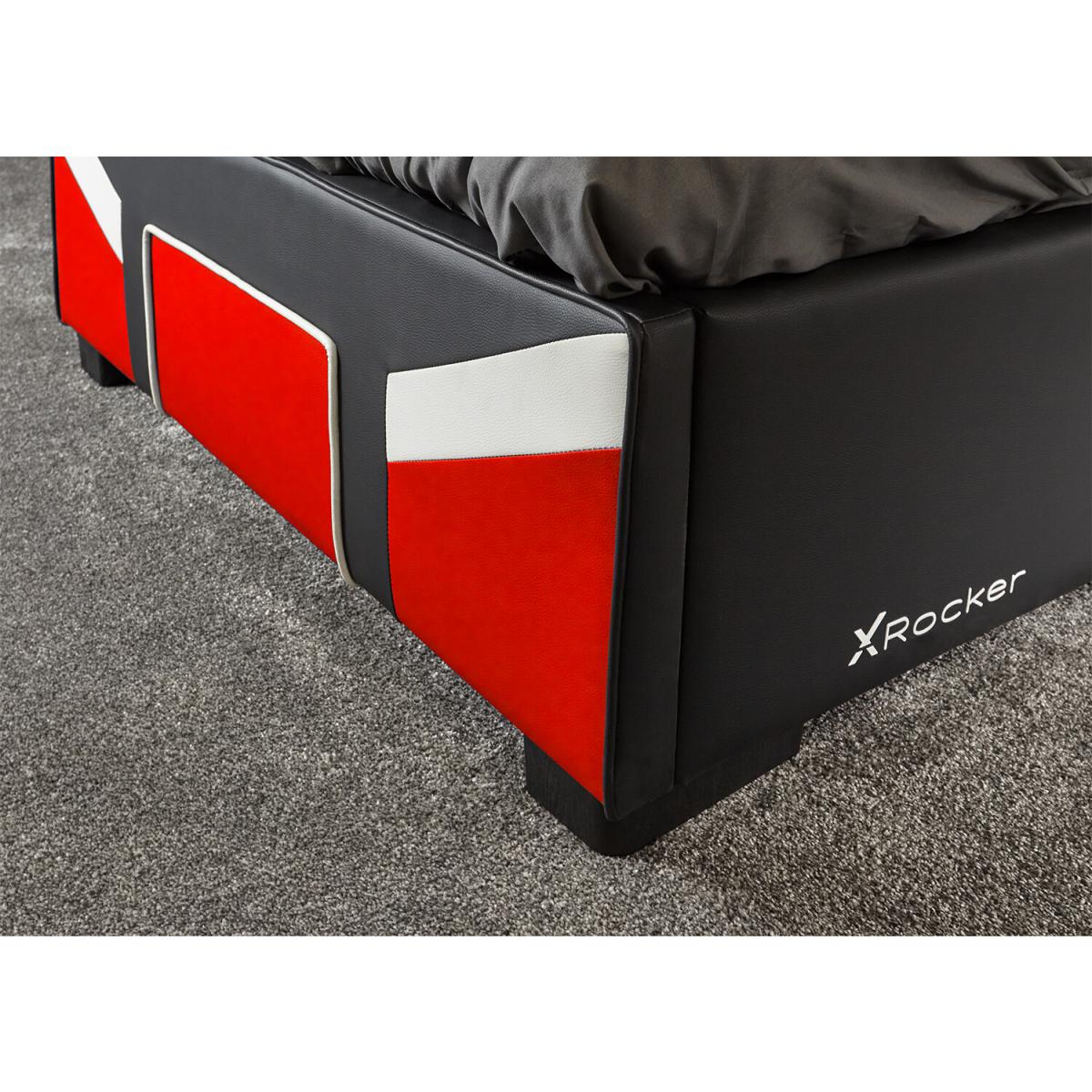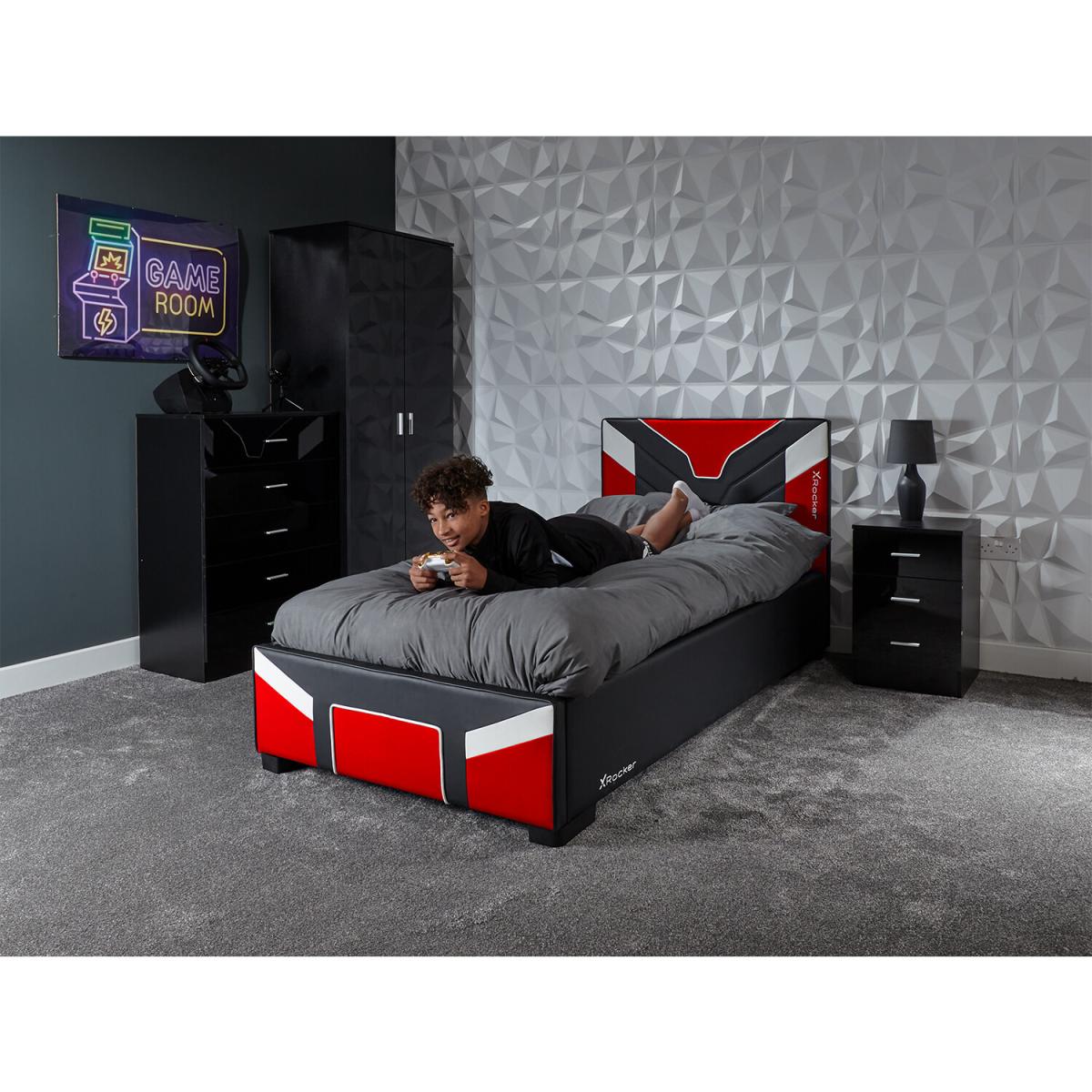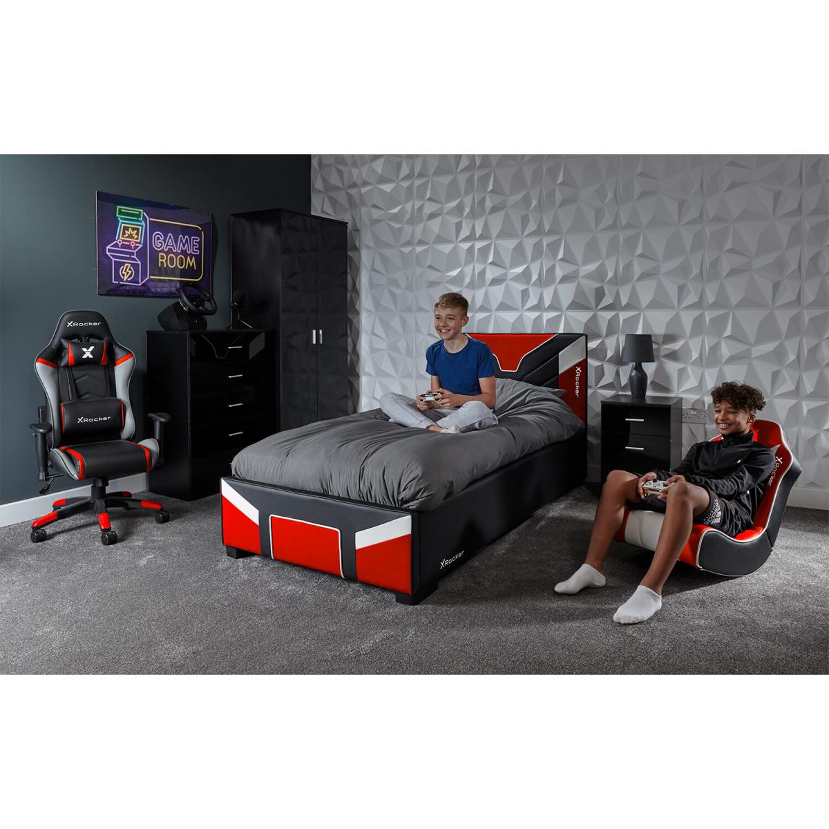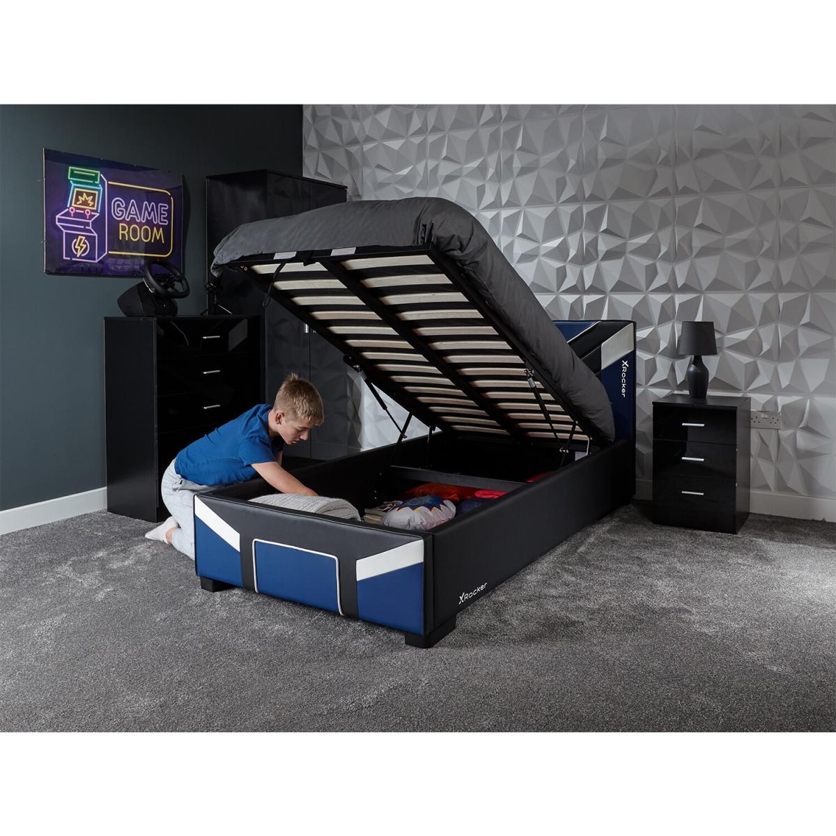 Immerse yourself in the world of e. Sports with the new X Rocker Cerberus Ottoman Bed, the world’s first gaming bed inspired by competitive gameplay. Built for those who eat and sleep gaming, this innovative ottoman bed frame lifts up to reveal plenty of storage space built-in for all your gaming gear. Whilst the luxurious faux leather headboard and wooden bed slats provide additional support and comfort throughout the night. Designed with e. Sports in mind, this gaming ottoman bed is available in blue or red, with 3 size options to suit all bedrooms.