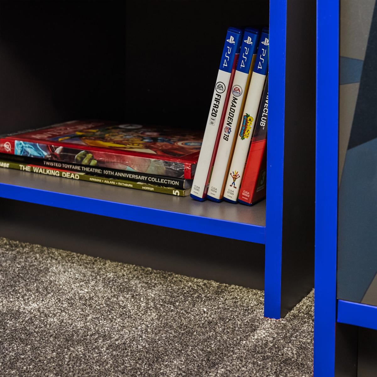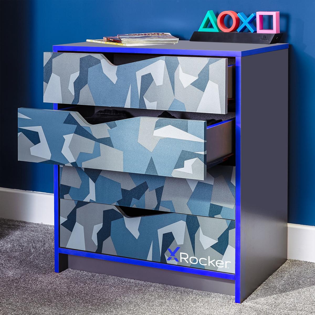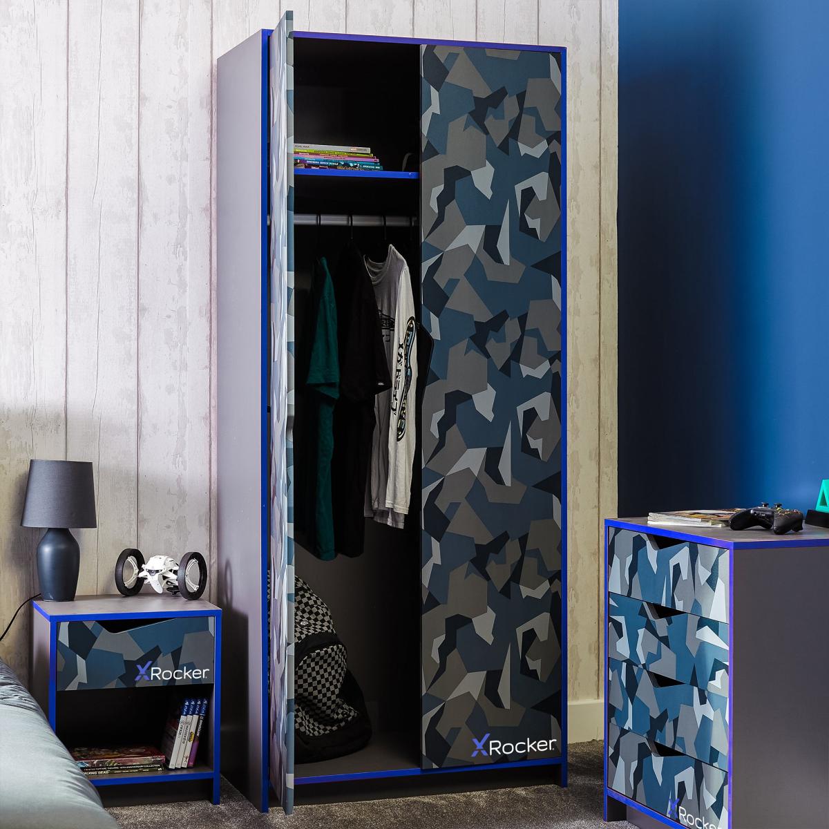 Transform your bedroom from ordinary to the ultimate gaming retreat with the X Rocker Hideout Gaming 3 Piece Bedroom Furniture Set, including a 2 door wardrobe with top shelf and clothes rail, 4 drawer chest and a single drawer bedside table with lower shelf storage. The striking Geo Camo printed design with e. Sports influences is available in the choice of a pink or blue colourway to match your style and unique shaped drawers and door handles provide an easy ergonomic grip for opening and closing. Whether you’re tidying away gaming accessories, clothes or stowing away devices at the end of the day, the Hideout gaming furniture range provides a stylish, storage solution for any kids bedroom or games room and high rise furniture can be securely mounted onto the wall using the included wall fixture kit.