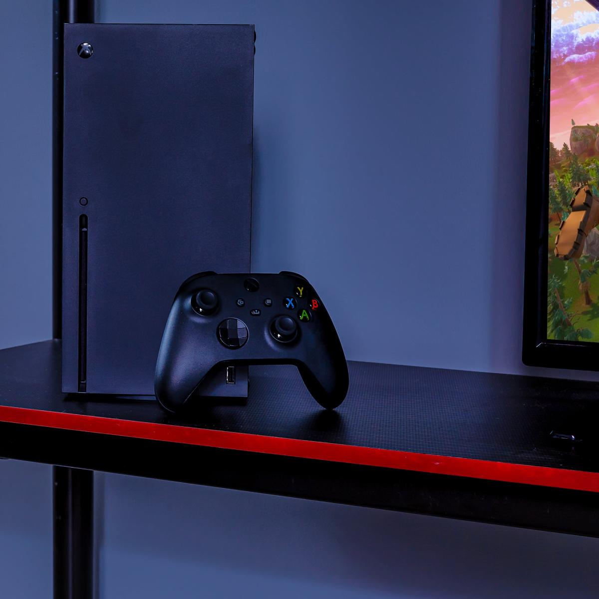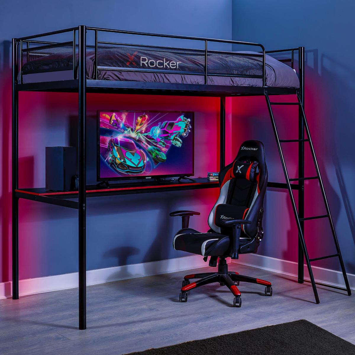 * High Sleeper Bed Frame* Desk Included* Metal Frame* Full Assembly Required This high sleeper bunk bed features a full-width desk beneath, providing ample space to accommodate a large-scale TV, a console, and accessories, ensuring a comprehensive gaming setup. The single high sleeper bed frame offers an elevated and comfortable sleeping platform, promising a restful night's sleep after intense gaming tournaments (mattress not included). Ideal for kids and teens, it serves as a space-saving solution for smaller bedrooms, offering both functionality and style. Unleash your creativity with the spacious under-bed capacity, allowing you to build your own gaming den. The full-width built-in desk is perfectly sized to house T Vs or PC monitors up to 40", forming an integrated gaming platform for the perfect gaming setup. Immerse yourself in the world of gaming with the HQ High Sleeper Gaming Bed, where comfort, functionality, and style converge to provide the ultimate gaming haven.*Mattress and LE Ds not included.