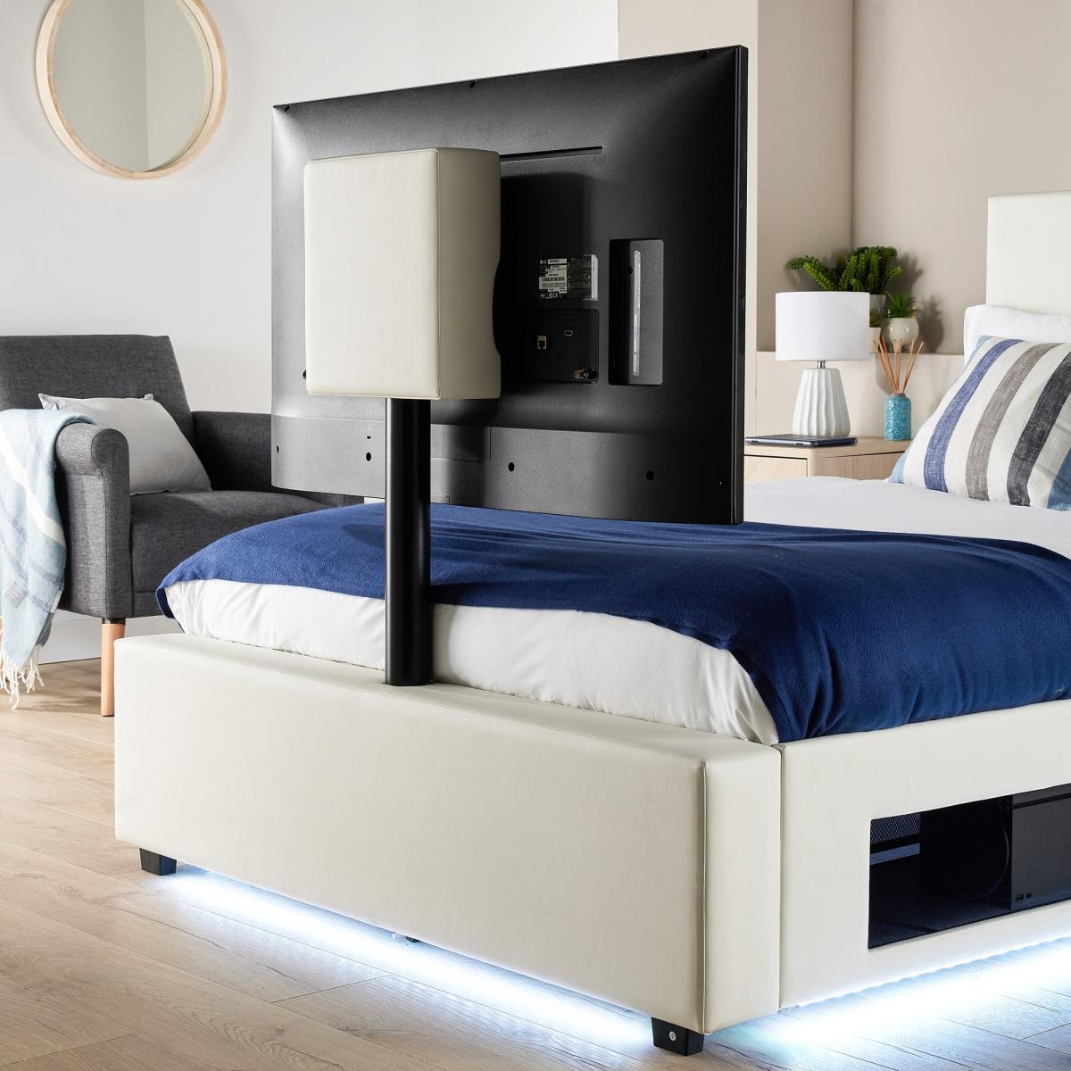 * Gaming Bed* TV Mount* Single and Small Double suitable up to 40" T Vs* Double and Kingsize suitable up to 55" T Vs* Mesh Storage Compartment* Faux Leather Upholstery This bed is designed for e Sports enthusiasts who seek the perfect fusion of style and functionality. The bed features a cutting-edge rotating TV mount, ensuring you're always ready for an immersive gaming session or a cinematic movie marathon. The thoughtful inclusion of a breathable under-storage mesh provides a convenient space for consoles and TV boxes, while the hidden cable tidy system keeps the setup clean and organized. Adorned with e Sports-inspired faux leather upholstery, this bed not only elevates your gaming experience but also adds a touch of contemporary flair to your space. Please note:Single and Small Double suitable up to 40" T Vs. Double and Kingsize suitable up to 55" T Vs.
