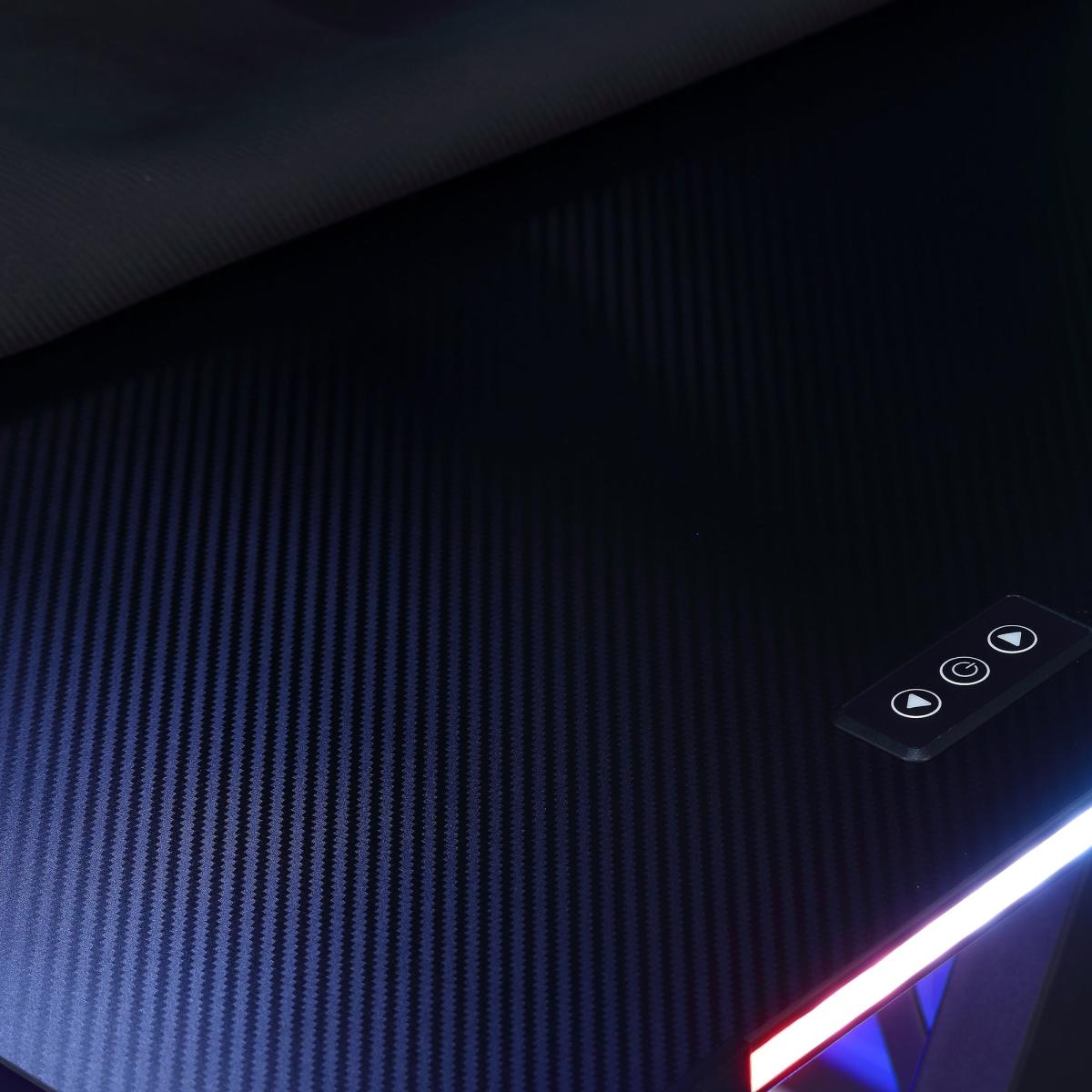 * Light Up Desk* App Controlled* Perfect for Gaming* Carbon Fibre Effect This cutting-edge desk is designed to provide a dynamic and visually stunning gaming setup, allowing you to customise the desk's LED lighting effects according to your gaming preferences. The spacious desk surface offers ample room for your gaming essentials, providing a clutter-free and organized gaming environment. With its sleek design and advanced LED technology, this gaming desk is a must-have for gamers looking to elevate their gaming setup with a touch of modern style and customisable lighting effects.