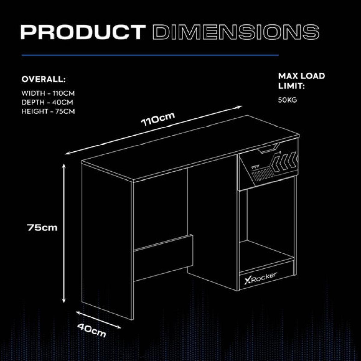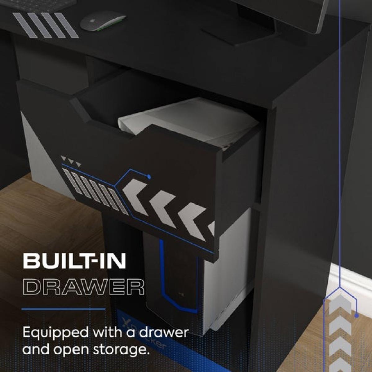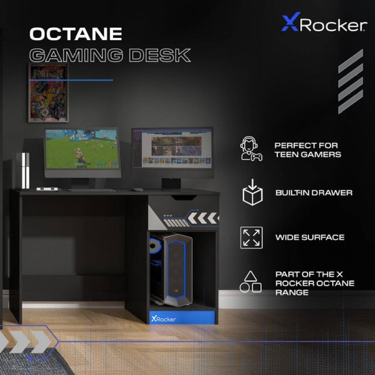 * Modern, gaming desk * Wide surface * Built in drawer Level up your setup with the Octane gaming desk, a sleek and functional workstation designed for aspiring gamers. With its racing-inspired design and bold detailing, this desk brings a sense of speed and excitement to any gaming space. The wide surface area provides plenty of room for dual monitors, a keyboard, and accessories, while a dedicated platform keeps your PC tower elevated and ventilated. A built-in drawer offers convenient storage for controllers, cables, and other essentials, helping you maintain a clean and focused environment.